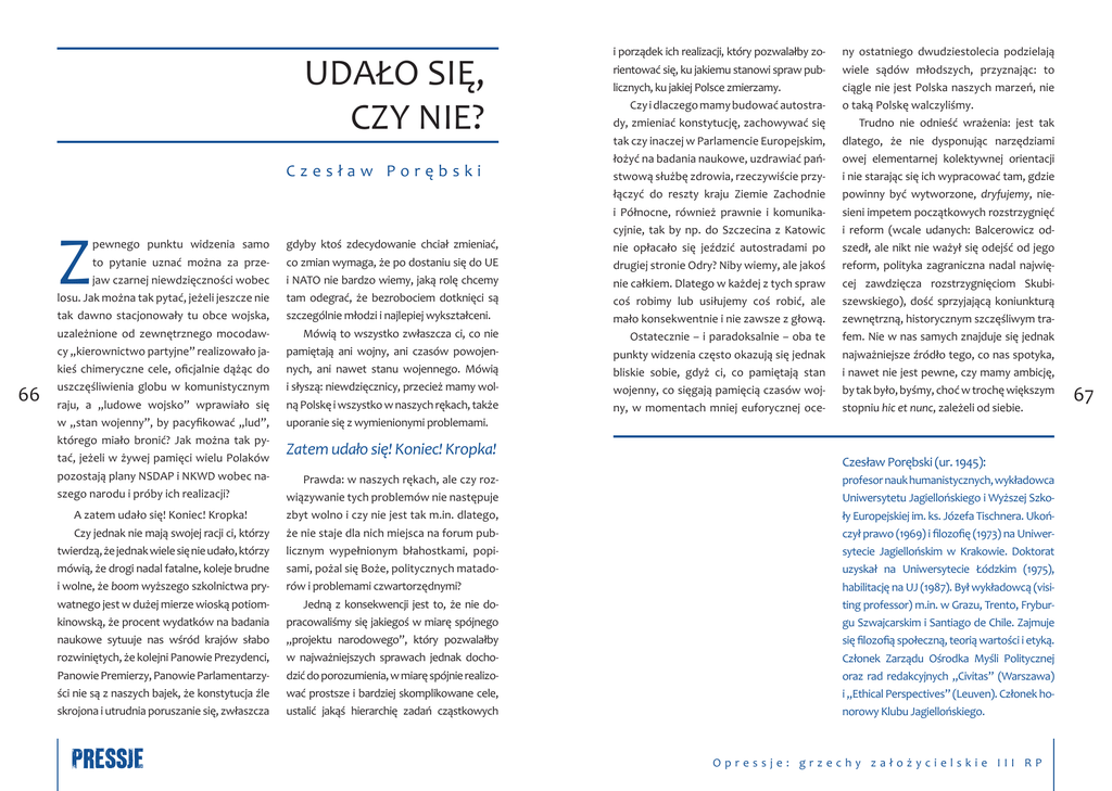 UDAŁO SIĘ, CZY NIE? Czesław Porębski Z 66 pewnego punktu widzenia samo to pytanie uznać można za przejaw czarnej niewdzięczności wobec losu. Jak można tak pytać, jeżeli jeszcze nie tak dawno stacjonowały tu obce wojska, uzależnione od zewnętrznego mocodawcy „kierownictwo partyjne” realizowało jakieś chimeryczne cele, oficjalnie dążąc do uszczęśliwienia globu w komunistycznym raju, a „ludowe wojsko” wprawiało się w „stan wojenny”, by pacyfikować „lud”, którego miało bronić? Jak można tak pytać, jeżeli w żywej pamięci wielu Polaków pozostają plany NSDAP i NKWD wobec naszego narodu i próby ich realizacji? A zatem udało się! Koniec! Kropka! Czy jednak nie mają swojej racji ci, którzy twierdzą, że jednak wiele się nie udało, którzy mówią, że drogi nadal fatalne, koleje brudne i wolne, że boom wyższego szkolnictwa prywatnego jest w dużej mierze wioską potiomkinowską, że procent wydatków na badania naukowe sytuuje nas wśród krajów słabo rozwiniętych, że kolejni Panowie Prezydenci, Panowie Premierzy, Panowie Parlamentarzyści nie są z naszych bajek, że konstytucja źle skrojona i utrudnia poruszanie się, zwłaszcza gdyby ktoś zdecydowanie chciał zmieniać, co zmian wymaga, że po dostaniu się do UE i NATO nie bardzo wiemy, jaką rolę chcemy tam odegrać, że bezrobociem dotknięci są szczególnie młodzi i najlepiej wykształceni. Mówią to wszystko zwłaszcza ci, co nie pamiętają ani wojny, ani czasów powojennych, ani nawet stanu wojennego. Mówią i słyszą: niewdzięcznicy, przecież mamy wolną Polskę i wszystko w naszych rękach, także uporanie się z wymienionymi problemami. Zatem udało się! Koniec! Kropka! Prawda: w naszych rękach, ale czy rozwiązywanie tych problemów nie następuje zbyt wolno i czy nie jest tak m.in. dlatego, że nie staje dla nich miejsca na forum publicznym wypełnionym błahostkami, popisami, pożal się Boże, politycznych matadorów i problemami czwartorzędnymi? Jedną z konsekwencji jest to, że nie dopracowaliśmy się jakiegoś w miarę spójnego „projektu narodowego”, który pozwalałby w najważniejszych sprawach jednak dochodzić do porozumienia, w miarę spójnie realizować prostsze i bardziej skomplikowane cele, ustalić jakąś hierarchię zadań cząstkowych i porządek ich realizacji, który pozwalałby zorientować się, ku jakiemu stanowi spraw publicznych, ku jakiej Polsce zmierzamy. Czy i dlaczego mamy budować autostrady, zmieniać konstytucję, zachowywać się tak czy inaczej w Parlamencie Europejskim, łożyć na badania naukowe, uzdrawiać państwową służbę zdrowia, rzeczywiście przy- ny ostatniego dwudziestolecia podzielają wiele sądów młodszych, przyznając: to ciągle nie jest Polska naszych marzeń, nie o taką Polskę walczyliśmy. Trudno nie odnieść wrażenia: jest tak dlatego, że nie dysponując narzędziami owej elementarnej kolektywnej orientacji i nie starając się ich wypracować tam, gdzie łączyć do reszty kraju Ziemie Zachodnie i Północne, również prawnie i komunikacyjnie, tak by np. do Szczecina z Katowic nie opłacało się jeździć autostradami po drugiej stronie Odry? Niby wiemy, ale jakoś nie całkiem. Dlatego w każdej z tych spraw coś robimy lub usiłujemy coś robić, ale mało konsekwentnie i nie zawsze z głową. Ostatecznie – i paradoksalnie – oba te punkty widzenia często okazują się jednak bliskie sobie, gdyż ci, co pamiętają stan wojenny, co sięgają pamięcią czasów wojny, w momentach mniej euforycznej oce- powinny być wytworzone, dryfujemy, niesieni impetem początkowych rozstrzygnięć i reform (wcale udanych: Balcerowicz odszedł, ale nikt nie ważył się odejść od jego reform, polityka zagraniczna nadal najwięcej zawdzięcza rozstrzygnięciom Skubiszewskiego), dość sprzyjającą koniunkturą zewnętrzną, historycznym szczęśliwym trafem. Nie w nas samych znajduje się jednak najważniejsze źródło tego, co nas spotyka, i nawet nie jest pewne, czy mamy ambicję, by tak było, byśmy, choć w trochę większym stopniu hic et nunc, zależeli od siebie. Czesław Porębski (ur. 1945): profesor nauk humanistycznych, wykładowca Uniwersytetu Jagiellońskiego i Wyższej Szkoły Europejskiej im. ks. Józefa Tischnera. Ukończył prawo (1969) i filozofię (1973) na Uniwersytecie Jagiellońskim w Krakowie. Doktorat uzyskał na Uniwersytecie Łódzkim (1975), habilitację na UJ (1987). Był wykładowcą (visiting professor) m.in. w Grazu, Trento, Fryburgu Szwajcarskim i Santiago de Chile. Zajmuje się filozofią społeczną, teorią wartości i etyką. Członek Zarządu Ośrodka Myśli Politycznej oraz rad redakcyjnych „Civitas” (Warszawa) i „Ethical Perspectives” (Leuven). Członek honorowy Klubu Jagiellońskiego. Opressje: grzechy założycielskie III RP 67
