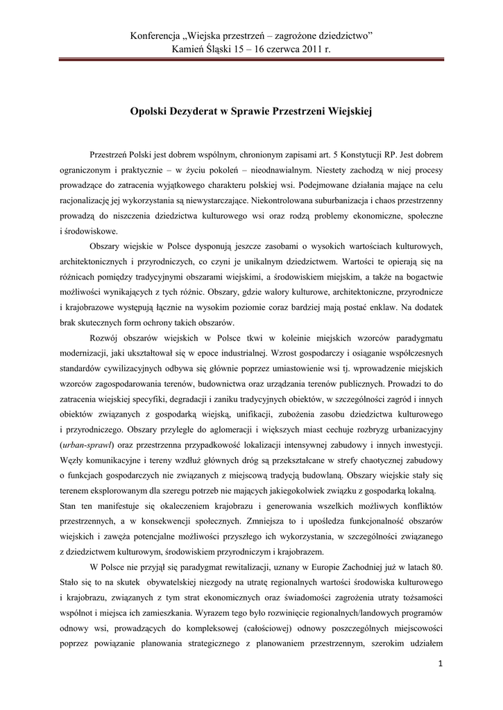 Konferencja „Wiejska przestrzeń – zagrożone dziedzictwo” Kamień Śląski 15 – 16 czerwca 2011 r. Opolski Dezyderat w Sprawie Przestrzeni Wiejskiej Przestrzeń Polski jest dobrem wspólnym, chronionym zapisami art. 5 Konstytucji RP. Jest dobrem ograniczonym i praktycznie – w życiu pokoleń – nieodnawialnym. Niestety zachodzą w niej procesy prowadzące do zatracenia wyjątkowego charakteru polskiej wsi. Podejmowane działania mające na celu racjonalizację jej wykorzystania są niewystarczające. Niekontrolowana suburbanizacja i chaos przestrzenny prowadzą do niszczenia dziedzictwa kulturowego wsi oraz rodzą problemy ekonomiczne, społeczne i środowiskowe. Obszary wiejskie w Polsce dysponują jeszcze zasobami o wysokich wartościach kulturowych, architektonicznych i przyrodniczych, co czyni je unikalnym dziedzictwem. Wartości te opierają się na różnicach pomiędzy tradycyjnymi obszarami wiejskimi, a środowiskiem miejskim, a także na bogactwie możliwości wynikających z tych różnic. Obszary, gdzie walory kulturowe, architektoniczne, przyrodnicze i krajobrazowe występują łącznie na wysokim poziomie coraz bardziej mają postać enklaw. Na dodatek brak skutecznych form ochrony takich obszarów. Rozwój obszarów wiejskich w Polsce tkwi w koleinie miejskich wzorców paradygmatu modernizacji, jaki ukształtował się w epoce industrialnej. Wzrost gospodarczy i osiąganie współczesnych standardów cywilizacyjnych odbywa się głównie poprzez umiastowienie wsi tj. wprowadzenie miejskich wzorców zagospodarowania terenów, budownictwa oraz urządzania terenów publicznych. Prowadzi to do zatracenia wiejskiej specyfiki, degradacji i zaniku tradycyjnych obiektów, w szczególności zagród i innych obiektów związanych z gospodarką wiejską, unifikacji, zubożenia zasobu dziedzictwa kulturowego i przyrodniczego. Obszary przyległe do aglomeracji i większych miast cechuje rozbryzg urbanizacyjny (urban-sprawl) oraz przestrzenna przypadkowość lokalizacji intensywnej zabudowy i innych inwestycji. Węzły komunikacyjne i tereny wzdłuż głównych dróg są przekształcane w strefy chaotycznej zabudowy o funkcjach gospodarczych nie związanych z miejscową tradycją budowlaną. Obszary wiejskie stały się terenem eksplorowanym dla szeregu potrzeb nie mających jakiegokolwiek związku z gospodarką lokalną. Stan ten manifestuje się okaleczeniem krajobrazu i generowania wszelkich możliwych konfliktów przestrzennych, a w konsekwencji społecznych. Zmniejsza to i upośledza funkcjonalność obszarów wiejskich i zawęża potencjalne możliwości przyszłego ich wykorzystania, w szczególności związanego z dziedzictwem kulturowym, środowiskiem przyrodniczym i krajobrazem. W Polsce nie przyjął się paradygmat rewitalizacji, uznany w Europie Zachodniej już w latach 80. Stało się to na skutek obywatelskiej niezgody na utratę regionalnych wartości środowiska kulturowego i krajobrazu, związanych z tym strat ekonomicznych oraz świadomości zagrożenia utraty tożsamości wspólnot i miejsca ich zamieszkania. Wyrazem tego było rozwinięcie regionalnych/landowych programów odnowy wsi, prowadzących do kompleksowej (całościowej) odnowy poszczególnych miejscowości poprzez powiązanie planowania strategicznego z planowaniem przestrzennym, szerokim udziałem 1 Konferencja „Wiejska przestrzeń – zagrożone dziedzictwo” Kamień Śląski 15 – 16 czerwca 2011 r. społeczności wiejskich. Natomiast w Polsce, w dobie transformacji ustrojowej lat 90., przyjęto paradygmat wielofunkcyjnego rozwoju obszarów wiejskich. Jego realizacja sprowadzała się do tzw. różnicowania, czyli zwiększania spectrum działalności gospodarczej, czym skutecznie podtrzymano ukształtowaną w czasach realnego socjalizmu praktykę traktowania wsi wyłącznie jako sfery produkcji. Pierwsza dekada XXI wieku nie przyniosła w tej mierze pozytywnych zmian jakościowych. Nie wypracowano spójnej koncepcji rozwoju i kształtowania obszarów wiejskich. Natomiast podporządkowano je realizacji Wspólnej Polityki Rolnej Unii Europejskiej. Programy Operacyjne stały się źródłem zdobywania środków na poszczególne inwestycje, obiektywnie potrzebne, lecz nie osadzone w szerszym kontekście rozwojowym. Lokalnie oznaczało to realizację szeregu przedsięwzięć (w zdecydowanej mierze infrastrukturalnych), co do treści będących punktowymi interwencjami, a nie sposobem na dynamizowanie procesów rozwojowych uruchomionych innymi metodami. W ten sposób na przełomie ubiegłego i obecnego wieku, nabyte przez samorządy gmin umiejętności planowania strategicznego ustąpiły „wykorzystywaniu środków unijnych”, głównie na rozbudowę infrastruktury. W praktyce polityka rozwoju obszarów wiejskich sprowadziła się do osiągania zmian możliwych do pomiaru poprzez tzw. wskaźniki produktu, a więc kategorie fizykalne (mierzalne). Osiąganie założonych mierników ma dowodzić skuteczności polityki rozwojowej. Kształtowanie przestrzeni, a w szczególności ochrony krajobrazu, nie uznano za dziedziny wymagające interwencji, tym bardziej, iż ewentualne ustalenie efektu osiągniętych zmian jest niemal niemożliwe przy takim podejściu. Dlatego też obecny okres silnego wzrostu gospodarczego, podobnie jak okres transformacji ustrojowej lat 90. cechują się przewagą oddziaływań negatywnych na przestrzeń wiejską i krajobraz. Wyjątkowa w historii dynamika niekorzystnych zmian diagnozowana jest jako „planowany chaos (bo sankcjonowany formalną zgodnością z planami zagospodarowania przestrzennego). Dewastacja przestrzeni i degradacja krajobrazu to problemy pierwszoplanowe, bez których rozwiązania rozwój zrównoważony nie jest możliwy. Traktowanie obszarów wiejskich jako niewyczerpywanego źródła rezerw terenowych spotyka się w Polsce z szeroką akceptacją lub co najmniej przyzwoleniem, co objawia się zarówno w działaniach władz i osób zawodowo zajmujący