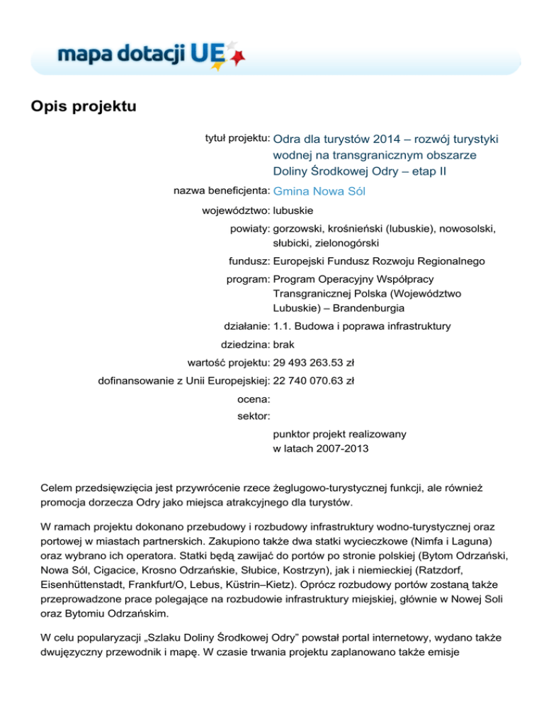 Opis projektu tytuł projektu: Odra dla turystów 2014 – rozwój turystyki wodnej na transgranicznym obszarze Doliny Środkowej Odry – etap II nazwa beneficjenta: Gmina Nowa Sól województwo: lubuskie powiaty: gorzowski, krośnieński (lubuskie), nowosolski, słubicki, zielonogórski fundusz: Europejski Fundusz Rozwoju Regionalnego program: Program Operacyjny Współpracy Transgranicznej Polska (Województwo Lubuskie) – Brandenburgia działanie: 1.1. Budowa i poprawa infrastruktury dziedzina: brak wartość projektu: 29 493 263.53 zł dofinansowanie z Unii Europejskiej: 22 740 070.63 zł ocena: sektor: punktor projekt realizowany w latach 2007-2013 Celem przedsięwzięcia jest przywrócenie rzece żeglugowo-turystycznej funkcji, ale również promocja dorzecza Odry jako miejsca atrakcyjnego dla turystów. W ramach projektu dokonano przebudowy i rozbudowy infrastruktury wodno-turystycznej oraz portowej w miastach partnerskich. Zakupiono także dwa statki wycieczkowe (Nimfa i Laguna) oraz wybrano ich operatora. Statki będą zawijać do portów po stronie polskiej (Bytom Odrzański, Nowa Sól, Cigacice, Krosno Odrzańskie, Słubice, Kostrzyn), jak i niemieckiej (Ratzdorf, Eisenhüttenstadt, Frankfurt/O, Lebus, Küstrin–Kietz). Oprócz rozbudowy portów zostaną także przeprowadzone prace polegające na rozbudowie infrastruktury miejskiej, głównie w Nowej Soli oraz Bytomiu Odrzańskim. W celu popularyzacji „Szlaku Doliny Środkowej Odry” powstał portal internetowy, wydano także dwujęzyczny przewodnik i mapę. W czasie trwania projektu zaplanowano także emisje promocyjnych spotów w polskiej i niemieckiej telewizji regionalnej. *** Oczy zanurzają się w zieleni wierzb, tuż obok nurkuje perkoz… W oddali słychać śmiech trenujących kajakarzy… Czy czas się zatrzymał? Bynajmniej — na Szlaku Doliny Środkowej Odry życie rozkwita. Bo Odra to rzeka dla turystów. Można się nią zachwycić z pokładu Laguny i Zefira, wycieczkowych statków kursujących od Głogowa do Kostrzyna nad Odrą. Po drodze cumują one w Bytomiu Odrzańskim, Nowej Soli, Cigacicach i Frankfurcie nad Odrą, a także w Krośnie Odrzańskim, Eisenhüttenstadt, Słubicach i Górzycy. Wodniacy mają do dyspozycji profesjonalne nabrzeża z pomostami pływającymi umożliwiającymi cumowanie małych jednostek. Na pokład statków turyści mogą zabrać rowery i w wybranym porcie zejść na ląd, by zmienić styl wycieczki. Dolina Środkowej Odry zadziwia różnorodnością krajobrazu: płaskie równiny splatają się tu z wysoczyznami. Po drodze w zdumienie wprawia wiele zabytków, jak zjawiskowy most w Stanach w okolicach Nowej Soli czy Twierdza Kostrzyn. Dzięki nowej infrastrukturze porty w Bytomiu Odrzańskim, Nowej Soli, Cigacicach i Frankfurcie n. Odrą są miejscem różnorodnych imprez wodniackich. Tu odbywają się zloty łodzi motorowych i amatorów rekreacji wodnej, spływy i regaty kajakowe, wyścigi smoczych łodzi, zawody w ratownictwie wodnym, regaty sterowanych modeli żaglowych. Co istotne, graniczna rzeka łączy polskich i niemieckich miłośników turystyki wodnej. Swojej pasji mogą się oddawać na transgranicznych spływach tratwami. Jednoczą także polsko-saksońskie warsztaty modelarskie w Nowej Soli. Realizacja projektu w gminach pogranicza lubusko-brandenburskiego przełożyła się bezpośrednio na kolejne inicjatywy w regionie. W Nowej Soli warto zajrzeć do Parku Krasnala — na rodziny z dziećmi czeka tu ogromny park zabaw i rozrywki, któremu patronuje olbrzymi krasnal Soluś z żoną Lusią. Na nabrzeżach nadodrzańskich miejscowości budowane są kawiarnie i restauracje. Pobliskie gospodarstwa tworzą spójną sieć, by zaproponować turyście bogatą ofertę wypoczynku i atrakcji z dala od wielkomiejskiego zgiełku. W kompleksowym, spójnym pakiecie znajduje się zwiedzanie, przejażdżki konne, nauka konnej jazdy lub wypożyczanie sprzętu wodnego. W Winnicy Kinga w Starej Wsi można nie tylko zobaczyć hodowlę winorośli, posmakować wyjątkowych gołąbków w liściach winorośli i wina, ale też przyjrzeć się pasji właścicieli, którzy znaleźli sposób na życie w harmonii z naturą. A potem udać się do kolejnych gospodarzy oferujących inne potrawy, bo paleta swojskich smaków ziemi lubuskiej jest bogata. Warto też skorzystać z wycieczki galarem, stylizowanym na XVIII-wieczną łódź wiosłową. Kapitan dzwonkiem sygnalizuje początek rejsu. Wieczorne pomarańczowe niebo odbija się w falach rzeki, czasem przemknie motorówka. Odra żyje.