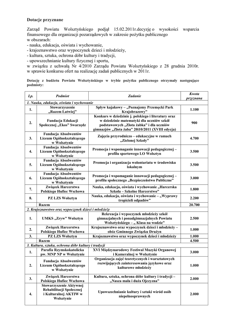 Dotacje przyznane Zarząd Powiatu Wolsztyńskiego podjął 15.02.2011r.decyzję o wysokości wsparcia finansowego dla organizacji pozarządowych w zakresie pożytku publicznego w obszarach: - nauka, edukacja, oświata i wychowanie, - krajoznawstwo oraz wypoczynek dzieci i młodzieży, - kultura, sztuka, ochrona dóbr kultury i tradycji, - upowszechnianie kultury fizycznej i sportu, w związku z uchwałą Nr 4/2010 Zarządu Powiatu Wolsztyńskiego z 28 grudnia 2010r. w sprawie konkursu ofert na realizację zadań publicznych w 2011r. Dotację z budżetu Powiatu Wolsztyńskiego w trybie pożytku publicznego otrzymały następujące podmioty: Lp. Podmiot Zadanie 1. Nauka, edukacja, oświata i wychowanie Stowarzyszenie Spływ kajakowy – „Poznajemy Przemęcki Park 1. „Razem Łatwiej” Krajobrazowy” Konkurs w dziedzinie j. polskiego i literatury oraz Fundacja Edukacji w dziedzinie matematyki dla uczniów szkół 2. Społecznej „Ekos” Swarzędz podstawowych „Złota żabka” i dla uczniów gimnazjów „Złota żaba” 20i10/2011 (XVIII edycja) Fundacja Absolwentów Zajęcia przyrodniczo – edukacyjne w ramach 3. Liceum Ogólnokształcącego „Zielonej Szkoły” w Wolsztynie Fundacja Absolwentów Promocja i wspomaganie innowacji pedagogicznej – 4. Liceum Ogólnokształcącego profilu sportowego LO Wolsztyn w Wolsztynie Fundacja Absolwentów Promocja i organizacja wolontariatu w środowisku 5. Liceum Ogólnokształcącego lokalnym w Wolsztynie Fundacja Absolwentów Promocja i wspomaganie innowacji pedagogicznej – 6. Liceum Ogólnokształcącego profilu społecznego „Bezpieczeństwo Publiczne” w Wolsztynie Związek Harcerstwa Nauka, edukacja, oświata i wychowanie „Harcerska 7. Polskiego Hufiec Wschowa Szkoła – Szkolne Harcerstwo” Nauka, edukacja, oświata i wychowanie – „Wyprawy 8. PZ LZS Wolsztyn tropicieli odpadów” Razem 2. Krajoznawstwo oraz wypoczynek dzieci i młodzieży Rekreacja i wypoczynek młodzieży szkół 1. UMKS „Zryw” Wolsztyn gimnazjalnych i ponadgimnazjalnych Powiatu Wolsztyńskiego – „ Klasa na wodzie” Związek Harcerstwa Krajoznawstwo oraz wypoczynek dzieci i młodzieży – 2. Polskiego Hufiec Wschowa obóz Gminnego Związku Drużyn 3. PZ LZS Wolsztyn Krajoznawstwo oraz wypoczynek dzieci i młodzieży Razem 3. Kultura, sztuka, ochrona dóbr kultury i tradycji Parafia Rzymskokatolicka XVI Międzynarodowy Festiwal Muzyki Organowej 1. pw. MNP NP w Wolsztynie i Kameralnej w Wolsztynie Organizacja zajęć teoretycznych i warsztatowych Fundacja Absolwentów rozwijających zainteresowania językowe oraz 2. Liceum Ogólnokształcącego kulturowe młodzieży w Wolsztynie 3. 4. Związek Harcerstwa Polskiego Hufiec Wschowa Stowarzyszenie Aktywnej Rehabilitacji Społecznej i Kulturalnej AKTIW w Wolsztynie Kwota przyznana 1.100 900 4.700 3.500 3.500 3.000 1.800 2.200 20.700 2.500 1.000 1.000 4.500 3.000 1.000 Kultura, sztuka, ochrona dóbr kultury i tradycji – „Nasza mała i duża Ojczyzna” 2.000 Upowszechnianie kultury i sztuki wśród osób niepełnosprawnych 2.000 UKS „Leśnik - Junior” XV Ogólnopolski Festiwal Piosenki Religijnej Świętno im. Jana Pawła II w Świętnie Razem 4. Upowszechnianie kultury fizycznej i sportu Stowarzyszenie „Razem Półkolonia dla dzieci niepełnosprawnych – „Moja 1. Łatwiej” mama pracuje” Upowszechnianie kultury fizycznej i sportu. - działania sportowe w zasięgu ponadgimnazjalnym i powiatowym, promujące kulturę fizyczną wśród młodzieży, ze szczególnym uwzględnieniem rozgrywek WMLKS „Nadodrze” międzyszkolnych, mistrzostw powiatu, stanowiących 2. Powodowo eliminacje mistrzostw wyższego szczebla wynikających z kalendarza imprez, - szkolenie sportowe dzieci i młodzieży w stowarzyszeniach kultury fizycznej, uczniowskich klubach sportowych, ludowych zespołach sportowych Systematyczne szkolenie dzieci i młodzieży w wieku 3. KPR „Wolsztyniak” szkolnym, w zakresie piłki ręcznej przy współudziale wykwalifikowanej kadry trenersko–instruktorskiej 4. MUKS Wolsztyn Szkolenie dzieci i młodzieży w sekcji piłki nożnej Upowszechnianie kultury fizycznej i sportu, w tym w szczególności: - działania sportowe stanowiące eliminacje mistrzostw wyższego szczebla wynikających z kalendarza imprez, - szkolenie sportowe dzieci i młodzieży 5. UMKS „Zryw” Wolsztyn w stowarzyszeniach kultury fizycznej, uczniowskich klubach sportowych, ludowych zespołach sportowych, - zapewnienie bezpieczeństwa młodzieży uprawiającej sporty wodne i uczestniczącej w zajęciach sportowych i rekreacyjnych 5. 6. Szkolny Klub Sportowy „Helios” Bucz 7. Szkolny Klub Sportowy „Helios” Bucz 8. Oddział Regionalny Olimpiad Specjalnych Polska Wielkopolskie – Poznań 9. UKS „Taekwondo Wolsztyn” 10. UMKS „Iskra” Wolsztyn 11. KS „Grom” Wolsztyn 12. UKS „Szach” Wolsztyn 13. MLKS „Orkan” Chorzemin 14. KS „Orzeł” Belęcin 15. UKS „Rywal Klon” Mochy 16. Stowarzyszenie Aktywnej Rehabilitacji Społecznej i Kulturalnej AKTIW w Wolsztynie Szkolenie sportowe dzieci i młodzieży w stowarzyszeniach kultury fizycznej – szkolnym klubie sportowym Popularyzacja walorów rekreacji ruchowej, organizacja rozgrywek międzyszkolnych, mistrzostw powiatu, okręgu, województwa i ogólnopolskich „Chcę pływać” Organizacja obozów szkoleniowych dyscypliny – taekwondo olimpijskiego oraz upowszechnianie dyscypliny taekwondo wśród dzieci i młodzieży miasta i gminy Wolsztyn Szkolenie dzieci i młodzieży uzdolnionej w uczniowskich klubach sportowych Organizacja i udział w zawodach i imprezach sportowych. Upowszechnianie kultury fizycznej wśród mieszkańców gminy Wolsztyn. Szkolenie dzieci i młodzieży uzdolnionej sportowo Szkolenie dzieci i młodzieży w szachach. Organizacja i udział w zawodach szachowych, rywalizacja sportowa, zdobywanie nowych kategorii szachowych Upowszechnianie kultury fizycznej i sportu szkolenie dzieci i młodzieży Upowszechnianie kult