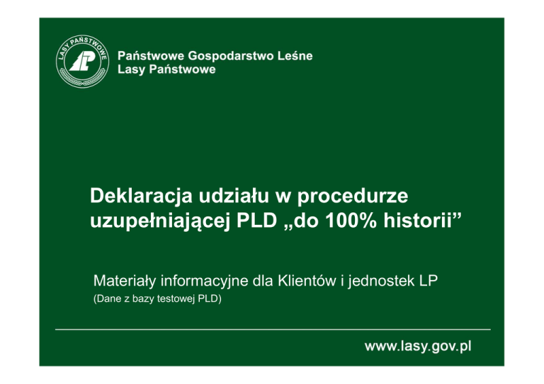 Deklaracja udziału w procedurze uzupełniającej PLD „do 100% historii” Materiały informacyjne dla Klientów i jednostek LP (Dane z bazy testowej PLD) Informacje ogólne 2 Informacje ogólne Deklarację udziału w procedurze uzupełniającej do „pełnej historii zakupów” należy złożyć za pośrednictwem PLD do dnia 9 stycznia 2017 roku włącznie (9 styczeń 2017 roku do godziny 23.59) i może być złożona/modyfikowana przez użytkownika dysponującego uprawnieniem do podpisu oferty. 3 Deklaracja udziału W celu zadeklarowania udziału w procedurze uzupełniającej w zakresie opisanym w par. 3 ust.1 pkt 3 należy skorzystać z linku Deklaracja udziału w procedurze uzupełniającej (1) i potwierdzić tekst deklaracji używając przycisku Potwierdź (2) (1) (2) 4 Deklaracja udziału Informacja dotycząca daty potwierdzenia udziału wyświetlana jest pod tekstem deklaracji (1). Umożliwiona jest rezygnacja z udziału w dodatkowej procedurze – przycisk Wycofaj (1) W przypadku wycofania deklaracji podawana jest informacja o tym fakcie (2) oraz umożliwiona jest powtórna możliwość zadeklarowania udziału - przycisk Potwierdź (2) 5 Deklaracja udziału Użytkownicy bez uprawnienia do podpisu ofert nie mogą zadeklarować ani zmienić decyzji o udziale w procedurze uzupełniającej, o czym informuje komunikat. 6 Zespół zadaniowy do spraw budowy, utrzymania i rozwoju elektronicznego systemu sprzedaży drewna w Lasach Państwowych