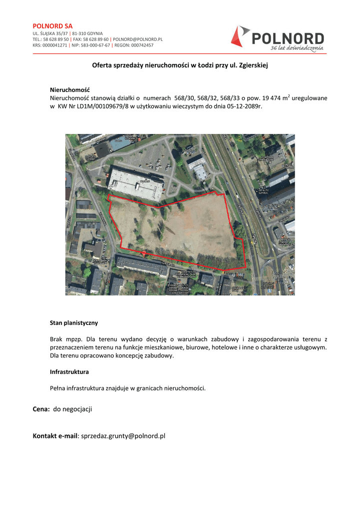 POLNORD SA UL. ŚLĄSKA 35/37 | 81-310 GDYNIA TEL.: 58 628 89 50 | FAX: 58 628 89 60 | [email protected] KRS: 0000041271 | NIP: 583-000-67-67 | REGON: 000742457 Oferta sprzedaży nieruchomości w Łodzi przy ul. Zgierskiej Nieruchomość Nieruchomość stanowią działki o numerach 568/30, 568/32, 568/33 o pow. 19 474 m2 uregulowane w KW Nr LD1M/00109679/8 w użytkowaniu wieczystym do dnia 05-12-2089r. Stan planistyczny Brak mpzp. Dla terenu wydano decyzję o warunkach zabudowy i zagospodarowania terenu z przeznaczeniem terenu na funkcje mieszkaniowe, biurowe, hotelowe i inne o charakterze usługowym. Dla terenu opracowano koncepcję zabudowy. Infrastruktura Pełna infrastruktura znajduje w granicach nieruchomości. Cena: do negocjacji Kontakt e-mail: [email protected]