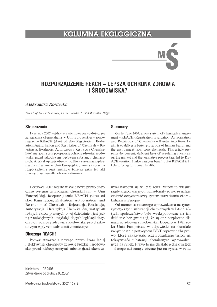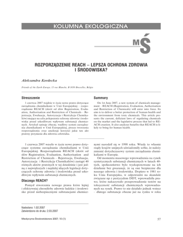 KOLUMNA EKOLOGICZNA ROZPORZÑDZENIE REACH – LEPSZA OCHRONA ZDROWIA I ÂRODOWISKA? Aleksandra Kordecka Friends of the Earth Europe, 15 rue Blanche, B 1050 Bruxelles, Belgia Streszczenie Summary 1 czerwca 2007 wejdzie w ˝ycie nowe prawo dotyczàce zarzàdzania chemikaliami w Unii Europejskiej – rozporzàdzenie REACH (skrót od s∏ów Registration, Evaluation, Authorisation and Restriction of Chemicals – Rejestracja, Ewaluacja, Autoryzacja i Restrykcja Chemikaliów) majàce na celu polepszenie ochrony zdrowia i Êrodowiska przed szkodliwym wp∏ywem substancji chemicznych. Artyku∏ opisuje obecny, wadliwy system zarzàdzania chemikaliami w Unii Europejskiej, proces tworzenia rozporzàdzenia oraz analizuje korzyÊci jakie ten akt prawny przyniesie dla zdrowia cz∏owieka. On 1st June 2007, a new system of chemicals management – REACH (Registration, Evaluation, Authorisation and Restriction of Chemicals) will enter into force. Its aim is to deliver a better protection of human health and the environment from toxic chemicals. This article presents the current, deficient laws of regulating chemicals on the market and the legislative process that led to REACH creation. It also analyses benefits that REACH is likely to bring for human health. 1 czerwca 2007 wesz∏o w ˝ycie nowe prawo dotyczàce systemu zarzàdzania chemikaliami w Unii Europejskiej. Rozporzàdzenie REACH (skrót od s∏ów Registration, Evaluation, Authorisation and Restriction of Chemicals – Rejestracja, Ewaluacja, Autoryzacja i Restrykcja Chemikaliów) zastàpi 40 ró˝nych aktów prawnych w tej dziedzinie i jest jednà z najwi´kszych i najdalej idàcych legislacji dotyczàcych ochrony zdrowia i Êrodowiska przed szkodliwym wp∏ywem substancji chemicznych. nymi narodzi∏ si´ w 1998 roku. Wtedy to w∏asnie rzàdy krajów unijnych uÊwiadomi∏y sobie, ˝e nale˝y zmieniç dotychczasowy system zarzàdzania chemikaliami w Europie. Od momentu masowego wprowadzenia na rynek syntetycznych substancji chemicznych w latach 40tych, spo∏eczeƒstwo bylo wyeksponowane na ich dzia∏anie bez gwarancji, ˝e sà one bezpieczne dla naszego zdrowia i Êrodowiska. Dopiero w 1981 roku Unia Europejska, w odpowiedzi na skandale zwiàzane np z pestycydem DDT, wprowadzi∏a prawo, które nakazywa∏o przeprowadzenie testów na toksycznoÊç substancji chemicznych wprowadzanych na rynek. Prawo to nie dzia∏a∏o jednak wstecz – dlatego substancje obecne ju˝ na rynku w roku Dlaczego REACH? Pomys∏ stworzenia nowego prawa które lepiej i efektywniej chroni∏oby zdrowie ludzkie i Êrodowisko przed niebezpiecznymi substancjami chemicz- Nades∏ano: 1.02.2007 Zatwierdzono do druku: 2.03.2007 Medycyna Środowiskowa 2007; 10 (1) 57 Kolumna dofinansowana ze Êrodków WFOÂiGW w Katowicach 1981, których wed∏ug danych Europejskiej Agencji Ochrony Ârodowiska by∏o ok 100 000 (EINECS), nigdy nie zosta∏y zbadane pod kàtem ich wp∏ywu na zdrowie i Êrodowisko [1]. W 1993 roku, Unia Europejska postanowi∏a naprawiç ten b∏àd i rozpocz´∏a proces oceny ryzyka 100 000 „starych” (na rynku przed 1981r.) i 2000 „nowych” substancji, rozpoczynajàc od tych, o których posiadano najmniej danych dotyczàcych ich toksycznoÊci oraz tych produkowanych w iloÊciach przekraczajàcych 1000 ton rocznie (na producenta). Proces tej oceny by∏ przeprowadzany przez paƒstwa cz∏onkowskie oraz na poziomie unijnym i wymaga∏ konsultacji du˝ej iloÊci danych, które w wi´kszoÊci nie istnia∏y. Szacunki mówià ˝e dla oko∏o 75% z 3000 substancji chemicznych produkowanych w wysokich tona˝ach brakowa∏o podstawowego, okreÊlonego przez OECD zestawu danych dotyczàcych toksycznoÊci [2]. Co wi´cej, Êrodki finansowe przeznaczone na proces oceny ryzyka by∏y niewielkie. W efekcie mo˝na by∏o oceniç zaledwie 20-30 substancji rocznie. Do koƒca 1997 roku przeprowadzono kompletnà ocen´ zaledwie 10 „starych” substancji i 400 „nowych” substancji [3]. Dlatego w∏adze unijne zdecydowa∏y, ˝e konieczne jest inne, bardziej skuteczne podejÊcie do chemikaliów na rynku europejskim. 13 lutego 2001 roku Komisja Europejska opublikowa∏a „Bia∏à Ksi´g´”, czyli pierwszà propozycj´ nowego prawa, która zosta∏a poddana konsultacji internetowej. Presja przemys∏u chemicznego by∏a ju˝ podczas konsultacji bardzo silna i dlatego oficjalna propozycja prawa, opublikowana 29 paêdziernika 2003 roku, by∏a o wiele s∏absza. Znikn´∏a z niej m.in. zasada obowiàzkowej substytucji (zast´powania najbardziej niebezpiecznych substancji bezpieczniejszymi alternatywami) oraz prawo do informacji dla konsumentów. REACH dzisiaj Po ponad trzech latach negocjacji pomi´dzy Parlamentem Europejskim a rzàdami paƒstw Unii Europejskiej, REACH zosta∏ zatwierdzony jako akt prawny w grudniu 2006 roku. REACH jest rozporzàdzeniem co oznacza, ˝e ma zasi´g ogólny, jest wià˝àce w ca∏oÊci i bezpoÊrednio stosowane w paƒstwach cz∏onkowskich. REACH to jedno z najbardziej rewolucyjnych praw z wielu powodów. Po pierwsze, nak∏ada obowiàzek przetestowania, lub udost´pnienia istniejàcych ju˝ danych dotyczàcych bezpieczeƒstwa ok 30 000 substancji chemicznych na rynku (ze 100 000). Sà to substancje wprowadzone na rynek przed rokiem 1981, które sà produkowane w najwy˝szych tona˝ach (powy˝ej 1 tony 58 rocznie dla producenta lub importera). Próg tona˝owy jest tutaj odzwierciedleniem naszej ekspozycji na dana substancj´ chemicznà – zak∏adane jest tutaj, ˝e im wi´cej danej substancji jest wprowadzone na rynek, tym bardziej cz∏owiek i przyroda sà na nià wyeksponowane. Proces badania i oceny (Rejestracji i Ewaluacji) substancji chemicznych b´dzie trwa∏ 11 lat (najwy˝sze tona˝e i najbardziej niebezpieczne substancje b´dà testowane najpierw). Dobra wiadomoÊç to to, ˝e po zakoƒczeniu tego procesu b´dziemy w posiadaniu o wiele wi´kszej iloÊci informacji na temat substancji obecnych ma rynku i b´dziemy 