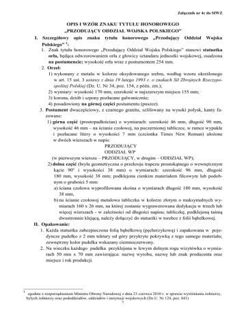 Załącznik nr 4c do SIWZ OPIS I WZÓR ZNAKU TYTUŁU HONOROWEGO „PRZODUJĄCY ODDZIAŁ WOJSKA POLSKIEGO” I. Szczegółowy opis znaku tytułu honorowego „Przodujący Oddział Wojska Polskiego” 1: 1. Znak tytułu honorowego „Przodujący Oddział Wojska Polskiego” stanowi statuetka orła, będąca odwzorowaniem orła z głowicy sztandaru jednostki wojskowej, osadzona na postumencie; wysokość orła wraz z postumentem 254 mm. 2. Orzeł: 1) wykonany z metalu w kolorze oksydowanego srebra, według wzoru określonego w art. 15 ust. 3 ustawy z dnia 19 lutego 1993 r. o znakach Sił Zbrojnych Rzeczypospolitej Polskiej (Dz. U. Nr 34, poz. 154, z późn. zm.); 2) wymiary: wysokość 170 mm, szerokość w najszerszym miejscu 155 mm; 3) korona, dziób i szpony pozłacane galwanicznie; 4) posadowiony na górnej części postumentu (puszce). 3. Postument dwuczęściowy, z czarnego granitu, szlifowany na wysoki połysk, kanty fazowane: 1) górna część (prostopadłościan) o wymiarach: szerokość 46 mm, długość 90 mm, wysokość 46 mm – na ścianie czołowej, na poczernionej tabliczce, w ramce wypukłe i pozłacane litery o wysokości 7 mm (czcionka Times New Roman) ułożone w dwóch wierszach w napis: PRZODUJĄCY ODDZIAŁ WP (w pierwszym wierszu – PRZODUJĄCY, w drugim – ODDZIAŁ WP); 2) dolna część (bryła geometryczna o przekroju trapezu prostokątnego o wewnętrznym kącie 90o i wysokości 38 mm) o wymiarach: szerokość 96 mm, długość 180 mm, wysokość 38 mm; podklejona cienkim materiałem filcowym lub podobnym o grubości 5 mm: a) ściana czołowa wyprofilowana skośna o wymiarach długość 180 mm, wysokość 38 mm, b) na ścianie czołowej metalowa tabliczka w kolorze złotym o maksymalnych wymiarach 160 x 26 mm, na której zostanie wygrawerowana dedykacja w trzech lub więcej wierszach - w zależności od długości napisu; tabliczkę, podklejoną taśmą dwustronnie klejącą, należy dołączyć do statuetki w torebce z folii bąbelkowej. II. Opakowanie: 1. Każda statuetka zabezpieczona folią bąbelkową (pęcherzykową) i zapakowana w pojedyncze pudełko z 2 mm tektury od góry przykryte pokrywką z tego samego materiału; zewnętrzny kolor pudełka wskazany ciemnoczerwony. 2. Na wieczku każdego pudełka przyklejona w lewym dolnym rogu wizytówka o wymiarach 50 mm x 70 mm zawierająca: nazwę wyrobu, nazwę lub znak producenta oraz miejsce i rok produkcji. 1 zgodnie z rozporządzeniem Ministra Obrony Narodowej z dnia 23 czerwca 2010 r. w sprawie wyróżniania żołnierzy, byłych żołnierzy oraz pododdziałów, oddziałów i instytucji wojskowych (Dz.U. Nr 124, poz. 841) 1 Załącznik nr 4c do SIWZ III. Wzór znaku honorowego „Przodujący Oddział Wojska Polskiego” zamieszczony poniżej. Przód Tył 2 Załącznik nr 4c do SIWZ I. OPIS I WZÓR ZNAKU TYTUŁU HONOROWEGO „PRZODUJĄCA INSTYTUCJA WOJSKOWA” Szczegółowy opis znaku tytułu honorowego „Przodująca Instytucja Wojskowa” 2: 1. Znak tytułu honorowego „Przodująca Instytucja Wojskowa” stanowi statuetka orła, będąca odwzorowaniem orła z głowicy sztandaru jednostki wojskowej, osadzona na postumencie; wysokość orła wraz z postumentem 254 mm. 2. Orzeł: 1) wykonany z metalu w kolorze oksydowanego srebra, według wzoru określonego w art. 15 ust. 3 ustawy z dnia 19 lutego 1993 r. o znakach Sił Zbrojnych Rzeczypospolitej Polskiej (Dz. U. Nr 34, poz. 154, z późn. zm.); 2) wymiary – wysokość 170 mm, szerokość w najszerszym miejscu 155 mm, 3) korona, dziób i szpony pozłacane galwanicznie; 4) posadowiony na górnej części postumentu (puszce). 3. Postument dwuczęściowy, z czarnego granitu, szlifowany na wysoki połysk, kanty fazowane: 1) górna część (prostopadłościan) o wymiarach: szerokość 46 mm, długość 90 mm, wysokość 46 mm – na ścianie czołowej, na poczernionej tabliczce, w ramce wypukłe i pozłacane litery o wysokości 7 mm (czcionka Times New Roman) ułożone w trzech wierszach w napis: PRZODUJĄCA INSTYTUCJA WOJSKOWA (w pierwszym wierszu – PRZODUJĄCA, w drugim – INSTYTUCJA, w trzecim WOJSKOWA); 2) dolna część (bryła geometryczna o przekroju trapezu prostokątnego o wewnętrznym kącie 90o i wysokości 38 mm) o wymiarach: szerokość 96 mm, długość 180 mm, wysokość 38 mm; podklejona cienkim materiałem filcowym lub podobnym o grubości 5 mm: a) ściana czołowa wyprofilowana skośna o wymiarach: długość 180 mm, wysokość 38 mm, b) na ścianie czołowej metalowa tabliczka w kolorze złotym o maksymalnych wymiarach 160 x 26 mm, na której zostanie wygrawerowana dedykacja w trzech lub więcej wierszach - w zależności od długości napisu; tabliczkę, podklejoną taśmą dwustronnie klejącą, należy dołączyć do statuetki w torebce z folii bąbelkowej. II. Opakowanie: 1. Każda statuetka zabezpieczona folią bąbelkową (pęcherzykową) i zapakowana w pojedyncze pudełko z tektury 2 mm od góry przykryte pokrywką z tego samego materiału; zewnętrzny kolor pudełka wskazany ciemnoczerwony. 2. Na wieczku każdego pudełka przyklejona w lewym dolnym rogu wizytówka o wymiarach 50 mm x 70 mm zawierająca: nazwę wyrobu, nazwę lub znak producenta oraz miejsce i rok produkcji. III. Wzór znaku honorowego „Przodująca Instytucja Wojskowa” zamieszczony poniżej. 2 tamże 3 Załącznik nr 4c do SIWZ Przód Tył 4