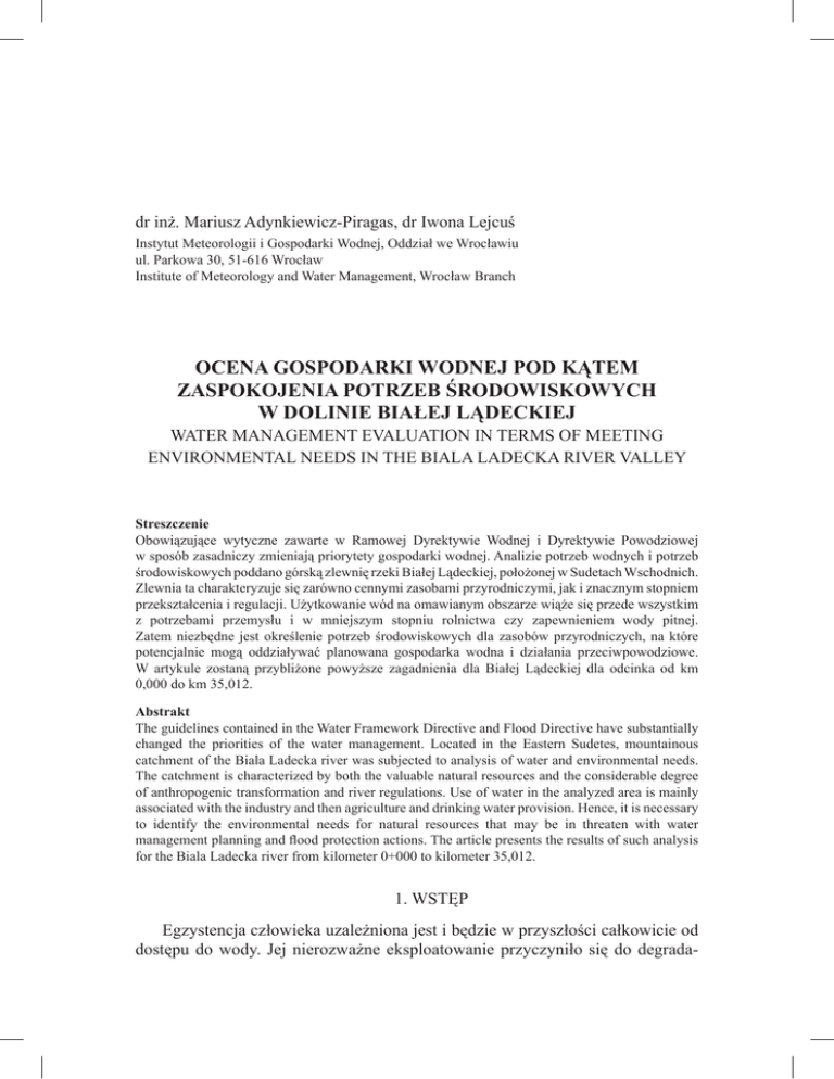 dr inż. Mariusz Adynkiewicz-Piragas, dr Iwona Lejcuś Instytut Meteorologii i Gospodarki Wodnej, Oddział we Wrocławiu ul. Parkowa 30, 51-616 Wrocław Institute of Meteorology and Water Management, Wrocław Branch OCENA GOSPODARKI WODNEJ POD KĄTEM ZASPOKOJENIA POTRZEB ŚRODOWISKOWYCH W DOLINIE BIAŁEJ LĄDECKIEJ WATER MANAGEMENT EVALUATION IN TERMS OF MEETING ENVIRONMENTAL NEEDS IN THE BIALA LADECKA RIVER VALLEY Streszczenie Obowiązujące wytyczne zawarte w Ramowej Dyrektywie Wodnej i Dyrektywie Powodziowej w sposób zasadniczy zmieniają priorytety gospodarki wodnej. Analizie potrzeb wodnych i potrzeb środowiskowych poddano górską zlewnię rzeki Białej Lądeckiej, położonej w Sudetach Wschodnich. Zlewnia ta charakteryzuje się zarówno cennymi zasobami przyrodniczymi, jak i znacznym stopniem przekształcenia i regulacji. Użytkowanie wód na omawianym obszarze wiąże się przede wszystkim z potrzebami przemysłu i w mniejszym stopniu rolnictwa czy zapewnieniem wody pitnej. Zatem niezbędne jest określenie potrzeb środowiskowych dla zasobów przyrodniczych, na które potencjalnie mogą oddziaływać planowana gospodarka wodna i działania przeciwpowodziowe. W artykule zostaną przybliżone powyższe zagadnienia dla Białej Lądeckiej dla odcinka od km 0,000 do km 35,012. Abstrakt The guidelines contained in the Water Framework Directive and Flood Directive have substantially changed the priorities of the water management. Located in the Eastern Sudetes, mountainous catchment of the Biala Ladecka river was subjected to analysis of water and environmental needs. The catchment is characterized by both the valuable natural resources and the considerable degree of anthropogenic transformation and river regulations. Use of water in the analyzed area is mainly associated with the industry and then agriculture and drinking water provision. Hence, it is necessary to identify the environmental needs for natural resources that may be in threaten with water management planning and flood protection actions. The article presents the results of such analysis for the Biala Ladecka river from kilometer 0+000 to kilometer 35,012. 1. WSTĘP Egzystencja człowieka uzależniona jest i będzie w przyszłości całkowicie od dostępu do wody. Jej nierozważne eksploatowanie przyczyniło się do degrada- 142 cji wód powierzchniowych i podziemnych oraz do znacznego ograniczenia ich dostępnych zasobów. Stąd podejmowane są wielokierunkowe działania prawne zmierzające do ochrony zasobów wodnych dla zapewnienia przyszłym pokoleniom wystarczającej ilości wody o dobrej jakości. Obowiązujące wytyczne zawarte w Ramowej Dyrektywie Wodnej (RDW) i Dyrektywie Powodziowej (DP) w sposób zasadniczy zmieniają priorytety gospodarki wodnej [3, 4]. Ramowa Dyrektywa Wodna zakłada równoprawne traktowanie wszystkich użytkowników wód (m.in. ludności, przemysłu, rolnictwa), uznając za użytkownika także środowisko naturalne. Celem RDW jest osiągnięcie dobrego stanu wód. Dobry stan wód oznacza, że jakość i ilość tych wód niewiele odbiega od stanu naturalnego, niezakłóconego przez człowieka. Kryteria oceny „dobrego stanu ekologicznego” wskazują, iż oprócz oczywistych wskaźników chemicznych i fizycznych pozwalających ocenić stopień zanieczyszczenia wód w RDW szczególny nacisk położono na skład gatunkowy organizmów wodnych i od wody zależnych. Stąd wartościowymi ekologicznie wodami nie są te, w których nie występują organizmy o składzie gatunkowym właściwym dla danej strefy klimatycznej i określonego charakteru akwenu mimo spełnienia norm fizyko-chemicznych. RDW wprowadza konieczność ochrony nie tylko wszystkich wód – rzek, jezior, wód podziemnych i przybrzeżnych, ale również całego środowiska wodnego, w tym ekosystemów wodnych i od wody zależnych. Kolejną grupą normatyw prawnych, wprowadzonych przez Unię Europejską, a kładącą nacisk na ochronę walorów przyrodniczych są Dyrektywa Ptasia i Dyrektywa Siedliskowa [5, 6]. Z ich funkcjonowaniem jest związane wyznaczenie sieci obszarów Natura 2000, które mają chronić najcenniejsze i zagrożone siedliska przyrodnicze i gatunki w Europie, które wymienione są w załącznikach do ww. Dyrektyw. W obszarach objętych formą ochrony Natura 2000 dopuszcza się możliwość prowadzenia działalności gospodarczej. Istnieją jednak ograniczenia w podejmowaniu jakichkolwiek działań mogących, osobno lub w połączeniu z innymi działaniami, znacząco negatywnie oddziaływać na cele ochrony obszaru Natura 2000, w tym w szczególności: pogorszyć stan siedlisk przyrodniczych lub siedlisk gatunków roślin i zwierząt, dla których ochrony wyznaczono obszar Natura 2000; wpłynąć negatywnie na gatunki, dla których ochrony został wyznaczony obszar Natura 2000; pogorszyć integralność obszaru Natura 2000 lub jego powiązania z innymi obszarami. Często działania przeciwpowodziowe stwarzają sytuacje konfliktowe z obszarami Natura 2000 w obrębie dolin rzecznych. Wyjątkowo można zezwolić na działanie lub przedsięwzięcie wpływające niekorzystnie na obszar Natura 2000, ale jedynie po ścisłym spełnieniu trzech warunków: udowodnieniu koniecznej przyczyny nadrzędnego interesu publicznego, udowodnienia braku alternatyw oraz podjęciu działań kompensacyjnych jeśli takie są wymagane. Dyrektywą związaną również z gospodarką wodną i ochroną wód jest Dyrektywa Powodziowa (DP). Przekształcenia i ingerencja człowieka w doliny cieków, wymuszają odpowiednią gospodarkę wodną i uwzględnienie potrzeby podejmowania licznych działań o charakterze przeciwpowodziowym. Celem Dyrektywy Powodziowej jest ograniczenie wyni- 143 kających z powodzi zagrożeń dla ludzkiego zdrowia, środowiska, infrastruktury i mienia oraz zarządzanie tymi zagrożeniami. W związku z powyższym Dyrektywa Powodziowa sugeruje konieczność stosowania w ochronie przeciwpowodziowej całej gamy środków 