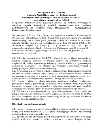 Zarządzenie nr 2 Dziekana Wydziału Nauk Historycznych i Pedagogicznych Uniwersytetu Wrocławskiego z dnia 15 stycznia 2015 roku zmieniające zarządzenie nr 3/2014 w sprawie dokumentowania przebiegu studiów na studiach pierwszego i drugiego stopnia, jednolitych studiach magisterskich oraz studiach podyplomowych na Wydziale Nauk Historycznych i Pedagogicznych Uniwersytetu Wrocławskiego Na podstawie § 27 ust. 3 i § 30 ust. 4 Regulaminu studiów w Uniwersytecie Wrocławskim uchwalonego w dniu 10 maja 2006 r. uchwałą Senatu Uniwersytetu Wrocławskiego Nr 65/2006 [tekst jednolity z dnia 28 kwietnia 2010 r. (zm. uchwała Senatu Uniwersytetu Wrocławskiego z dnia 30 marca 2011 r. Nr 30/2011) w związku z § 6 ust.1 pkt 1, § 10 ust. 2 i § 11 ust. 1 pkt 3 rozporządzenia Ministra Nauki i Szkolnictwa Wyższego z dnia 14 września 2011 r. W sprawie dokumentacji przebiegu studiów (Dz. U. Nr 201, poz. 1188), zarządza się, co następuje: 1.1. Od roku akademickiego 2014/2015 odstępuje się od dokumentowania w indeksie osiągnięć studenta w trakcie studiów na jednolitych studiach magisterskich, studiach pierwszego i drugiego stopnia, studiach podyplomowych wszystkich kierunków i lat studiów na Wydziale Nauk Historycznych i Pedagogicznych Uniwersytetu Wrocławskiego. 1.2. W związku z powyższym jedyną oficjalną formą dokumentacji osiągnięć studenta w trakcie studiów będą zapisy na indywidualnym koncie studenta prowadzone w oparciu o właściwe w tym przedmiocie przepisy prawa przy wykorzystaniu Uniwersyteckiego Systemu Obsługi Studiów (dalej: USOS). 1.3. Biorący udział w dokumentowaniu przebiegu studiów (zwłaszcza: prowadzący zajęcia, pracownicy, doktoranci oraz studenci) winni wykonywać wszystkie związane z tym czynności z najwyższą starannością oraz rzetelnie współdziałać w zakresie prawidłowego dokumentowania przebiegu studiów. 1.4. Dokumentacja własna prowadzona przez zaliczającego określone zajęcia lub przeprowadzającego egzaminy, w której ujęte są oceny wprowadzone do USOS, jest przechowywana przez prowadzącego zajęcia lub egzaminatora do końca następnego roku akademickiego. Obowiązki prowadzącego zajęcia 2.1. Oceny z zaliczenia ćwiczeń oraz wykładów niekończących się egzaminem winny być wprowadzone do USOS przez zaliczającego zajęcia bez zbędnej zwłoki w dniu wystawienia zaliczenia. 2.2. Zaliczający ma obowiązek przed przystąpieniem do zaliczania tych zajęć ogłosić studentom termin i miejsce konsultacji, podczas których będzie przyjmował ewentualne uwagi i zastrzeżenia do wprowadzonych ocen. Konsultacje te należy przeprowadzić najpóźniej w terminie 3 dni przed rozpoczęciem sesji egzaminacyjnej i zamknięciem protokołów zaliczeniowych w systemie USOS. 2.3. Prawidłowo sporządzone protokoły zaliczenia ćwiczeń oraz protokoły zaliczenia wykładów niekończących się egzaminem zaliczający zajęcia składają w dziekanacie najpóźniej w terminie 3 dni od dnia zamknięcia protokołów w USOS. 2.4. Zmiana oceny w złożonym protokole zaliczenia ćwiczeń oraz protokole zaliczenia wykładu niekończącego się egzaminem dokonywana jest na pisemny wniosek zaliczającego zajęcia, zatwierdzony przez kierownika jednostki dydaktycznej lub osobę przez niego wyznaczoną. Wzór wniosku ustali dziekan w drodze zarządzenia. 3.1. Egzaminator dopuszcza do egzaminu uprawnionych studentów w oparciu o informacje o zaliczonych ćwiczeniach znajdujące się w systemie USOS. Egzaminatorzy otrzymują status koordynatorów zajęć, z których prowadzą egzamin, w momencie zamknięcia protokołów zaliczeniowych. 3.2. Obecność na egzaminie ustnym student potwierdza na liście obecności. 3.3. Oceny z egzaminu ustnego winny być wprowadzone do USOS przez egzaminatora bez zbędnej zwłoki w dniu przeprowadzenia egzaminu. 3.4. Oceny z egzaminu pisemnego winny być wprowadzone do USOS przez egzaminatora bez zbędnej zwłoki, najpóźniej w 7 dniu od dnia przeprowadzenia egzaminu, z uwzględnieniem terminu zamknięcia protokołów. 3.5. Egzaminator najpóźniej przed rozpoczęciem egzaminu ogłosi studentom termin i miejsce konsultacji, podczas których będzie przyjmował ewentualne uwagi i zastrzeżenia do wprowadzonych ocen do USOS. Konsultacje te należy przeprowadzić najpóźniej w terminie 3 dni od dnia wprowadzenia przez egzaminatora ocen do USOS, z uwzględnieniem terminu zamknięcia protokołów. 3.6. Prawidłowo sporządzone protokoły egzaminacyjne egzaminator składa w dziekanacie najpóźniej w terminie 3 dni od zakończenia sesji egzaminacyjnej. 3.7. Zmiana oceny w złożonym protokole egzaminu dokonywana jest na pisemny wniosek egzaminatora, zatwierdzony przez kierownika jednostki dydaktycznej lub osobę przez niego wyznaczoną. Wzór wniosku ustali dziekan w drodze zarządzenia. Obowiązki studenta 4.1. Student ma obowiązek sprawdzić bez zbędnej zwłoki na swoim koncie indywidualnym w systemie USOS uzyskaną ocenę (w tym brak oceny) z określonych zajęć, wprowadzoną przez zaliczającego dane zajęcia do USOS. 4.2. Student uwagi i zastrzeżenia w zakresie uzyskanej oceny (w tym braku oceny) zgłasza do zaliczającego zajęcia najpóźniej w terminie 3 dni od dnia wprowadzenia ocen. Niezgłoszenie przez studenta uwag i zastrzeżeń w zakresie uzyskanej oceny (w tym braku oceny) do zaliczającego oznacza brak jakichkolwiek uwag i zastrzeżeń do oceny (w tym braku oceny) odnotowanej w USOS. 4.3. Zaliczający dane zajęcia bez zbędnej zwłoki wyjaśnia zgłoszone w danym dniu przez studenta zastrzeżenia i uwagi; podejmuje rozstrzygnięcie w sprawie i dokonuje niezwłocznie ewentualnych modyfikacji w zakresie wprowadzonej oceny (w tym braku oceny) do USOS. W przypadku zamknięcia systemu USOS prowadzący występuje do Dziekana z wnioskiem o zmianę oceny posługując się wzorem wniosku zatwierdzonym przez Dziekana (zał. nr 1). 4.4. Od rozstrzygnięcia zaproponowanego przez zaliczającego dane zajęcia
