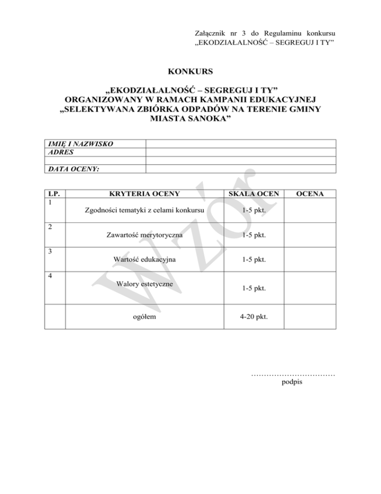 Załącznik nr 3 do Regulaminu konkursu „EKODZIAŁALNOŚĆ – SEGREGUJ I TY” KONKURS „EKODZIAŁALNOŚĆ – SEGREGUJ I TY” ORGANIZOWANY W RAMACH KAMPANII EDUKACYJNEJ „SELEKTYWANA ZBIÓRKA ODPADÓW NA TERENIE GMINY MIASTA SANOKA” IMIĘ I NAZWISKO ADRES DATA OCENY: LP. 1 KRYTERIA OCENY SKALA OCEN Zgodności tematyki z celami konkursu 1-5 pkt. Zawartość merytoryczna 1-5 pkt. Wartość edukacyjna 1-5 pkt. OCENA 2 3 4 Walory estetyczne ogółem 1-5 pkt. 4-20 pkt. …………………………… podpis