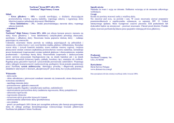NeoStrata® Krem HPP AHA 20% NeoStrata® High Potency Cream Skład: • Kwas glikolowy – 18% - czynnik nawilżający, o działaniu złuszczającym powierzchowną warstwę rogową naskórka, wspomaga odnowę i regenerację skóry właściwej poprzez pobudzanie aktywności fibroblastów • Kwas laktobionowy – 2% - środek przeciwdziałający starzeniu skóry; wspomaga odnowę komórek; - witamina E Opis: NeoStrata® High Potency Cream 20% AHA jest silnym kremem przeciw starzeniu się skóry. Kwas glikolowy i kwas laktobionowy (antyoksydant) powodują złuszczenie, nawilżenie i odbudowę skóry. Stosowanie kremu poprawia teksturę skóry – redukuje pojawiające się zmarszczki. Codzienne stosowanie kremu pozwala na redukcję pojawiających się pobrużdżeń i zmarszczek, a skórę twarzy i szyi czyni bardziej miękką, gładszą i delikatniejszą. Stymuluje wzrost skóry i żywych komórek naskórka, usuwa nadmiar warstwy rogowej, zwiększa plastyczność stratum corneum (najbardziej powierzchowna warstwa naskórka), normalizuje proces keratynizacji (rogowacenia) czyniąc naskórek gładszym i elastyczniejszym, rozjaśnia przebarwienia i wyrównuje barwę skóry. Przeciwdziała czopowaniu i zanieczyszczeniu porów zarówno przyczynami fizjologicznymi (np. na skutek łojotoku) jak i na skutek stosowania kosmetyki kolorowej (pudry, pokłady, korektory itp.), zmniejsza ich wielkość. Reguluje pracę gruczołów łojowych i przeciwdziała powstawaniu zaskórników. Wspomaga efekty zabiegów kosmetycznych i medycznych (np. peelingów). Krem posiada opatentowany przez NeoStratę system amfoteryczny, ułatwiający powolną i długotrwałą penetrację składników aktywnych w ilościach „akceptowanych” przez skórę, bez ryzyka podrażnienia. Wskazania: - skóra sucha - skóra odwodniona z pierwszymi oznakami starzenia się (zmarszczki, utrata elastyczności, wzmożona urażalność) - zapobiega starzeniu skóry - powierzchowne i głębokie zmarszczki - trądzik pospolity (łagodny i umiarkowanie nasilony, zaskórnikowi) - nierównomierna powierzchnia skóry (nadmierne rogowacenie, blizny potrądzikowe) - zaburzenia rogowacenia - rogowacenie słoneczne - rozszerzone ujścia gruczołów łojowych i łojotok - nierównomierne zabarwienie skóry (przebarwienia) - cera ziemista - przed i po peelingach AHA (krem jest szczególnie polecany jako kuracja przygotowująca skórę do zabiegu peelingu dermatologicznego wykonywanego kwasami glikolowymi NeoStrata lub płatkami Citriate NeoStrata) Sposób użycia: Nakładać na twarz i szyję raz dziennie. Delikatnie wcierając aż do momentu całkowitego wchłonięcia. Uwagi: Kremu nie powinny stosować osoby z wrażliwą skórą Nie stosować pod oczy, na powieki i usta. W czasie stosowania używać preparatów promieniochłonnych o współczynniku ochronnym, co najmniej, SPF 15. Unikać intensywnego opalania. Może występować czasowe pieczenie. Jeśli podrażnienie lub dyskomfort będzie się utrzymywać – przerwać stosowanie. Chronić przed dziećmi. Produkt należy stosować pod kontrolą lekarza przez pacjentów tolerujących kwas glikolowy. Producent: ® NeoStrata Company Inc. USA ,NJ 08540 Dystrybutor: Derm-Service Pologne www.dermservice.com.pl Data sporządzenia lub data ostatniej weryfikacji ulotki: kwiecień 2008r.
