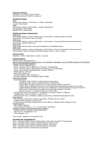 Sebastian Główka Urodzony 2.12.1976 w Nysie, Polska sebastian.glowka(AT)math.uni.opole.pl WYKSZTAŁCENIE: 2004 Politechnika Opolska, Informatyka - studia inżynierskie Inżynier informatyki 2002 Uniwersytet Opolski, Matematyka - studia magisterskie Specjalizacja: informatyka Magisterium z matematyki DOŚWIADCZENIE ZAWODOWE: 2006-teraz Uniwersytet Opolski, Instytut Matematyki i Informatyki, Lokalna Akademia CISCO Stanowiska: Curriculum Lead, Instructor 2002-teraz Uniwersytet Opolski, Instytut Matematyki i Informatyki, Pracownia Systemów Komputerowych Stanowisko: administrator sieci 2002-2005 Programista komercyjnych systemów zarządzania przedsiębiorstwem 2000-2002 Uniwersytet Opolski, Instytut Matematyki i Informatyki, Pracownia Systemów Komputerowych Administrator systemu Windows NT(Workstation, Server), Linux i Solaris JĘZYKI OBCE: Angielski – dobra znajomość w mowie i w piśmie UMIEJĘTNOŚCI: Ponad 9-letnie doświadczenie z: Administracja systemami operacyjnymi: Linux (RedHat, Mandrake), Unix (FreeBSD, Solaris), MS Windows Serwer NT/2000/2003/2008 R2: - MCITP: Server Administrator - MCTS: Windows Server 2008 Active Directory: Configuration - MCTS: Windows Server 2008 Network Infrastructure: Configuration - poczta email (postfix, SpamAssassin, Amavis, Clamav) - WWW (Apache, MS IIS) - DNS (bind i Windows) - firewall (iptables, ipfw, Symantec ) - Domeny Windows NT4.0,Windows 2000, SAMBA Sieci komputerowe: - Szkolenia CISCO: Certyfikat CCNA (CISCO Certified Network Associate) Certyfikat CCNP (CISCO Certified Network Professional) CCNP1:BSCI (Building Scalable Cisco Internetworks) egzamin 642-901 CCNP2:ISCW (Implementing Secure Converged Wide Area Networks) egzamin 642-825 CCNP3:BCMSN (Building Converged Cisco Multilayer Switched Networks) egzamin 642-812 CCNP4:ONT (Optimizing Converged Cisco Networks) egzamin 642-845 Network Security 1 & Network Security 2 (PIX, ASA) - konfiguracja ruterów sprzętowych i zarządzalnych switchy (CISCO i podobne) - projektowanie sieci dla małych i średnich firm - zabezpieczanie sieci, wdraŜanie polityk prywatności, testowanie zabezpieczeń sieci Bazy danych: - administracja systemami mySQL, PostgreSQL, MS SQL Server, Oracle - projektowanie relacyjnych baz danych - programowanie klientów dostępowych do baz danych, zabezpieczanie dostępu do baz Programowanie: - IDE: Delphi, CBuilder - Języki programowania: C, C++, Turbo Pascal, Assembler Szkolenia Sybase Certified Professional Program: - Adaptive Server Anywhere 9.0 Fundamentals - Fast Track to PowerBuilder 10.5 - PowerDesigner 12.5 Prawo jazdy: kategoria B od ponad 10 lat SZCZEGÓLNE OSIĄGNIĘCIA: 2011: Certyfikat MCITP: Server Administrator (Microsoft Certified IT Professional) 2010: Certyfikat CCNP (CISCO Certified Network Professional) 2008: Certyfikat CCAI (CISCO Certified Academy Instructor) 2007: Certyfikat CCNA (CISCO Certified Network Associate) 2004: Nagroda Rektora Uniwersytetu Opolskiego ZAINTERESOWANIA: szybkie samochody, szybkie komputery, technologie informatyczne, dobra muzyka Wyrażam zgodę na przetwarzanie moich danych osobowych zawartych w ofercie pracy dla potrzeb niezbędnych do realizacji procesu rekrutacji (zgodnie z Ustawą z dnia 29.08.97 r. o Ochronie Danych Osobowych Dz. U. Nr 133 poz. 883)