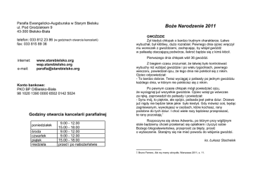 Parafia Ewangelicko-Augsburska w Starym Bielsku ul. Pod Grodziskiem 9 43-300 Bielsko-Biała telefon: 033 812 23 86 (w godzinach otwarcia kancelarii) fax: 033 815 89 36 internet: e-mail: www.starebielsko.org wap.starebielsko.org [email protected] Konto bankowe: PKO BP O/Bielsko-Biała 98 1020 1390 0000 6502 0142 5024 Godziny otwarcia kancelarii parafialnej poniedziałek środa czwartek piątek niedziela 9.00 - 12.00 15.00 - 18.00 9.00 - 12.00 9.00 - 12.00 15.00 - 18.00 przed i po nabożeństwie Boże Narodzenie 2011 GWOŹDZIE Żył kiedyś chłopak o bardzo trudnym charakterze. Łatwo wybuchał, był kłótliwy, dużo rozrabiał. Pewnego dnia ojciec wręczył mu woreczek z gwoździami, zachęcając, by wbijał gwóźdź w palisadę otaczającą podwórze, ilekroć będzie się z kimś kłócił. Pierwszego dnia chłopak wbił 36 gwoździ. Z biegiem czasu zrozumiał, że łatwiej było kontrolować wybuchy niż wzbijać gwoździe i po wielu tygodniach, pewnego wieczoru, powiedział ojcu, że tego dnia nie pokłócił się z nikim. Ojciec odpowiedział: - To bardzo dobrze. Teraz wyciągaj z palisady po jednym gwoździu każdego dnia, w którym nie pokłócisz się z nikim. Po pewnym czasie chłopak mógł powiedzieć ojcu, że wyciągnął już wszystkie gwoździe. Ojciec wziął go wówczas za rękę, zaprowadził do palisady i powiedział: - Synu mój, to pięknie, ale spójrz, palisada jest pełna dziur. Drzewo już nigdy nie będzie takie jakie było kiedyś. Gdy mówisz coś, będąc zagniewanym, wywołujesz w osobach, które kochasz, rany podobne do tych dziur. I choć wiele razy będziesz przepraszać, te rany pozostają.1 Rozpoczyna się okres Adwentu, po którym przy wigilijnym stole będziemy chcieli przełamać się opłatkiem i życzyć sobie Bożego błogosławieństwa, przeprosić za błędy, prosić o wybaczenie. Starajmy się nie mieć powodu do wbijania gwoździ. ks. Łukasz Stachelek 1 Bruno Ferrero, Ale my mamy skrzydła, Warszawa 2011, s. 11. Adwent - nabożeństwa i gwiazdki Z Syjonu pełnego piękności zajaśniał Bóg. Bóg nasz przybywa i nie milczy. Alleluja! Święta Bożego Narodzenia - nabożeństwa Niech się radują niebiosa i weseli się ziemia (...) przed obliczem Pana, bo idzie. Alleluja! Ps 50,2.3a data 27.11.2011 Nd 02.12.2011 Pt 03.12.2011 So 04.12.2011 Nd 09.12.2011 Pt 10.12.2011 So 11.12.2011 Nd 16.12.2011 Pt 17.12.2011 So 18.12.2011 Nd godzina 08.00 Kam. 09.30 St.B. MK opis I Niedziela w Adwencie I tygodniowe nabożeństwo Adwentowe Spotkanie Adwentowe 14.00 D.S. dla dzieci 09.30 St.B. WK II Niedziela w Adwencie II tygodniowe 17.00 St.B. WK nabożeństwo Adwentowe Spotkanie Adwentowe 14.00 D.S. dla dzieci 08.00 Kam. WK III Niedziela w Adwencie 09.30 St.B. MK III tygodniowe 17.00 St.B. WK nabożeństwo Adwentowe 12.00 St.B WK Nabożeństwo dla Seniorów 13.00 D.S. Gwiazdka Seniorów 17.00 D.S. Gwiazdka Chóru 09.30 St.B. WK IV Niedziela w Adwencie 15.00 St.B. Gwiazdka dzieci 17.00 St.B. Ps 96,11a.13a data godzina 24.12.2011 So 16.00 St.B. 05.00 Biała 25.12.2011 Nd 09.30 St.B. 08.00 Kam. 26.12.2011 Pn 09.30 St.B. 16.00 St.B. WK 31.12.2011 So 23.45 St.B. 01.01.2012 Nd 09.30 St.B 06.01.2012 Pt 09.30 St.B. opis Wigilia Jutrznia I Święto Bożego Narodzenia II Święto Bożego Narodzenia Zakończenie Roku Czuwanie – powitanie Nowego Roku 2012 Święto nadania Zbawicielowi imienia Jezus Nowy Rok Święto Epifanii Objaśnienia skrótów: St.B. - Kościół w Starym Bielsku Kam. - Kościół w Kamienicy D.S. - Duża sala parafialna WK - Nabożeństwo ze Spowiedzią i Wieczerzą Pańską ze Wspólnego Kielicha MK - Nabożeństwo ze Spowiedzią i Wieczerzą Pańską z Małych Kielichów