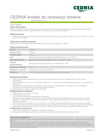CEDRIA środek do renowacji drewna Karta techniczna Linia Ogród Opis produktu Skuteczny środek na bazie wody do czyszczenia i odnawiania drewna poplamionego lub poszarzałego wskutek działania czynników atmosferycznych, promieniowania UV, deszczu i zanieczyszczeń środowiska. Właściwości • Usuwa plamy powstałe wskutek zmiennych czynników atmosferycznych, grzybów, tlenków, tanin itp., zarówno na drewnie twardym, jak i miękkim. Zalecane zastosowanie Polecany do renowacji drewna przed zastosowaniem wszelkiego rodzaju lazur i olejów. Dane techniczne Zapach Delikatny Gęstość (20ºC) 1,09 kg/l Rozpuszczalnik Woda LZO Spełnia hiszpański dekret królewski 227/2006, Załącznik I.1; do 130 g/l Warunki nakładania Maksymalna wilgotność względna: 65% Temperatura: 5 - 35ºC Warunki przechowywania Przechowywać pod zadaszeniem, w temperaturze 5 - 35ºC Pojemność opakowań 1li5l Nakładanie i usuwanie Użyć pędzla i szczotki. Usuwać wodą. Wydajność 10 m²/l w zależności od narzędzia aplikacji i rodzaju drewna Bezpieczeństwo • • • • Należy przestrzegać obowiązujących przepisów w zakresie przechowywania i obchodzenia się z tego rodzaju substancjami. Okres przechowywania: 3 lata w zamkniętym opakowaniu i w warunkach przechowywania określonych w punkcie Dane techniczne. Nie dopuścić do przedostania się produktu lub jego resztek do cieków wodnych. Pamiętaj: ochrona środowiska naturalnego to nasze zobowiązanie wobec przyszłych pokoleń. Przechowywać w miejscu niedostępnym dla dzieci. Nakładanie produktu • • • • • • Należy usunąć z drewna kurz i tłuszcz. Produkt gotowy do użycia. Przed użyciem zamieszać szpachelką (nie wstrząsać). Nanieść za pomocą pędzla obfite warstwy produktu CEDRIA ŚRODEK DO RENOWACJI na lekko zwilżone drewno i pozostawić na ok. 30 minut, by środek zaczął działać. Zaleca się użycie rękawiczek i okularów ochronnych podczas nakładania produktu. Zmyć obficie wodą, używając szczotki. Upewnić się, czy resztki zastosowanego produktu zostały dokładnie usunięte. Przed zastosowaniem produktu wykończeniowego należy odczekać, aż powierzchnia dokładnie wyschnie. W przypadku uporczywych plam powtórzyć czynność, szorując szczotką lub druciakiem zgodnie z kierunkiem włókien drewna. Dodatkowe zalecenia • • • Czas schnięcia zależy od temperatury i wilgotności względnej. Wydajność i zachowanie się produktu mogą nieznacznie się różnić w zależności od rodzaju drewna. Gwarancja jakości Produkty firmy CEDRIA są opracowywane, produkowane i wprowadzane do sprzedaży zgodnie z najwyższymi standardami jakości. Niniejsze zalecenia są zgodne z aktualnym stanem naszej wiedzy i zapewniają ogólne informacje dotyczące aplikacji i zastosowania produktów. Zważywszy na różnorodność powierzchni, zastosowań i technik nakładania, które pozostają poza kontrolą producenta, odpowiedzialność za efekt końcowy użycia produktów ponosi użytkownik. Dlatego zaleca się wykonanie próby przed właściwą aplikacją produktu. LIPIEC 2013 Strona | 1