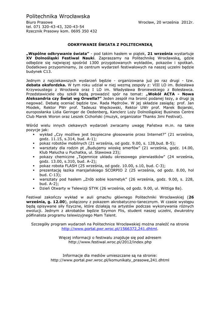 Politechnika Wrocławska Biuro Prasowe tel. 071 320-43-43, 320-43-54 Rzecznik Prasowy kom. 0695 350 432 Wrocław, 20 września 2012r. ODKRYWANIE ŚWIATA Z POLITECHNIKĄ „Wspólne odkrywanie świata” - pod takim hasłem w piątek, 21 września wystartuje XV Dolnośląski Festiwal Nauki. Zapraszamy na Politechnikę Wrocławską, gdzie odbędzie się najwięcej spośród 1300 przygotowanych wykładów, pokazów i spotkań. Dodatkowo przypominamy, że centrum wydarzeń festiwalowych na naszej uczelni będzie budynek C13. Jednym z najciekawszych wydarzeń będzie - organizowana już po raz drugi - tzw. debata oksfordzka. W tym roku udział w niej wezmą zespoły z: VIII LO im. Bolesława Krzywoustego z Wrocławia oraz I LO im. Władysława Broniewskiego z Bolesławca. Przedstawiciele obu szkół będą prowadzić spór na temat: „Wokół ACTA - Nowa Aleksandria czy Świat wg Orwella?” Jeden zespół ma bronić podanej tezy, a drugi ją negować. Debatę oceniać będzie tzw. Rada Mędrców. W jej składzie zasiądą: prof. Jan Miodek, Rektor PWr prof. Tadeusz Więckowski, Rektor UWr prof. Marek Bojarski, europosłanka Lidia Geringer de Oedenberg, Kanclerz Loży Dolnośląskiej Business Centre Club Marek Woron oraz Leszek Cichoński (muzyk, organizator Thanks Jimi Festival). Wśród wielu innych ciekawych wydarzeń zwracamy uwagę Państwa m.in. na takie pozycje jak: wykład „Czy możliwe jest bezpieczne głosowanie przez Internet?” (21 września, godz. 11.15, s.314, bud. A-1); pokaz robotów mobilnych (21 września, od godz. 9.00, s. 128,bud. B-5); warsztaty dla rodzin pt „Budujemy wioskę smerfów” (21 września, godz. 14.00, Klub Malucha u Puchatka, ul. Stawowa 23); pokazy chemiczne „Tajemnice układu okresowego pierwiastków” (24 września, godz. 13.00, s.310, bud. A-2); pokaz robota FLASH (25 września, od godz. 10.00, s.10, bud. C-3); prezentację łazika marsjańskiego SCORPIO 2 (25 września, od godz. 8.00, hol bud. C-13); warsztaty pod hasłem „Zrób sobie kosmetyk” (26 września, godz. 9.00, s. 228, bud. A-2); Dzień Otwarty w Telewizji STYK (26 września, od godz. 9.00, ul. Wittiga 8a). Festiwal zakończy wykład w auli gmachu głównego Politechniki Wrocławskiej (26 września, g. 12.00), połączony z pokazem akrobatyczno-tanecznym. W czasie występu będą opisywane siły fizyczne, które działają na artystów podczas wykonywania różnych ewolucji. Jednym z akrobatów będzie Szymon Flis, student naszej uczelni, dwukrotny półfinalista programu telewizyjnego Mam Talent. Szczegóły program wydarzeń na Politechnice Wrocławskiej można znaleźć na stronie http://www.portal.pwr.wroc.pl/1566372,241.dhtml. Więcej informacji o festiwalu znajduje się pod adresem http://www.festiwal.wroc.pl/2012/index.php Informacje dla mediów umieszczane są na stronie: http://www.portal.pwr.wroc.pl/komunikaty_prasowe,241.dhtml