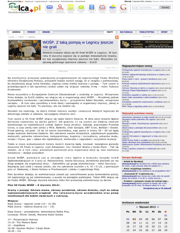 Grupa portali lca.pl - legnica.pl - Legniczanie.pl - Legnica.org - OnlineKredyty - Studniówki Wtorek, 3 stycznia 2012, imieniny: Danuta, Arleta, Genowefa Szukaj POCZTA LEGNICA POWIAT OGŁOSZENIA FORUM REGION FOTO VIDEO TV LIVE POGODA FAKTY LEGNICKA KULTURALIA PUBLICYSTYKA SPORT REKLAMA Lca.pl » Fakty » Legnica WOŚP. Z taką pompą w Legnicy jeszcze nie grali 2012-01-03 14:39:05 Wielkimi krokami zbliża się XX finał W OŚP w Legnicy. W tym roku 8 stycznia zapisze się w pamięci mieszkańców miasta, b o t a k w y jątkowej imprezy jeszcze nie było . W s z y s t k o z a sprawą głównego sponsora zabawy – E u C O Najpopularniejsze newsy Czytaj dalej Profesjonalny gabinet kosmetyczny w Legnicy (2011-11-08 REKLAMA 07:14:56) Wybierz najpopularniejszego proboszcza w Legnicy (201112-28 12:46:30) N a k o n f e r e n c j i p r a s o w e j p ośw ięc o n e j p r z y g o t o w a n i o m d o t e g o r o c z n e g o f i n ał u W i e l k i e j Orkiestry Ś w iątecznej Pomocy, prezydent miasta zwrócił u w a gę, że w z w iązku z jubileuszową, bo dwudziestą a k c ją Jurka Owsiaka, Legnicę czeka wielka impreza z pompą. - T y m r a z e m w przedsięw z ięc i e o t a k o g r o m n e j r a n d z e u d ał o s ię w ł ąc z yć rodzimą f i r mę – m ó w i T a d e u s z Krzakowski. Pracuj razem z nami - szukamy Handlowca (2011-12-05 09:35:16) Konkrety wypłacą odszkodowanie legniczance (2011-11-12 12:44:32) Cyfrowa Telewizja za darmo w Legnicy (2011-10-29 18:54:28) Obchody Święta Niepodległości w Legnicy (2011-11-10 17:12:01) M o w a o c z y w iśc i e o E u r o p e j s k i m C e n t r u m O d s z k o d o w ań z s i e d z i bą w L e g n i c y . W i c e p r e z e s firmy dodaje, że EuCO siódmy raz wł ąc z a s ię w organizację akcji WOŚ P . - W c z eśniej jednak licytowaliśm y s e r d u s z k a i s p r z e d a w a l iśm y k a r t y – p r z y p o m i n a A d a m W s z oł e k , w i c e p r e z e s z a r ząd u . - W t y m r o k u p o s z l iśm y o k r o k d a l e j i p o m a g a m y w o r g a n i z a c j i i m p r e z y , j a k i e j w Legnicy jeszcze nie był o. To pierwszy, ale nie ostatni raz. Śmiertelny wypadek w Lubinie (2011-11-04 15:14:19) Beata Tadla opowiadała o sobie licealistom (2011-10-22 10:25:39) Dwudziestu pasażerów ewakuowano z autobusu (2011-1225 12:30:58) PRW: Fikcja w legnickiej szkole (2011-11-03 09:48:26) W s z oł e k m a n a d z i e ję, że d o b r y k l i m a t i m p r e z y z a c hęc i z wł a s z c z a mł o d y c h l e g n i c z a n d o aktywnego udział u w zabawie, sprzyjającej otwarciu serc. Najwyżej oceniane newsy Jarmułowicz odwołana za słabe wyniki (2011-01-28 12:31:09) Wygrajmy ekstra podwórko dla Legnicy! (2011-07-08 T y m r a z e m w X X f i n ał W OŚ P wł ąc z y s ię także G a l e r i i G w a r n a . W d n i u a k c j i o t w a r t e będzie d a r m o w e l o d o w i s k o n a d a c h u g a l e r i i . O d g o d z i n y 1 1 n a s c e n i e w e w nęt r z u c e n t r u m h a n d l o w e g o n a n a j mł o d s z y c h c z e k ać będ z i e m a s a a t r a k c j i . Z a b a wę p o p r o w a d z i P r z e m e k C o r s o , a c z a s u m i lą n a m s o l iści z MCK, Balbinki, Chór Gosspel, DBT Crew, BeSSali i Ocelot. P r z e d g a l e r ią, o d g o d z . 1 0 d o 1 6 s t a n i e m a m m o b u s , w ięc p a n i e w w i e k u 5 0 – 6 9 l a t będą m o gł y wykonać darmowe badanie. Nie zabraknie wozów strażackich, zabytkowych pojazdów, motocykli, pokazów ratownictwa, bodypaintingu, kuglarzy i szczudlarzy, pokazów mody, w i z ażu i fryzur, gier i zabaw dla najmł odszych, konkursów z nagrodami i oczywiście licytacji. T a kże w n o w o w y b u d o w a n y m h o t e l u G a l e r i i G w a r n a będą nocować n a j w ięk s z e g w i a z d y muzyczne XX finał u w Legnicy, czyli Zakopower, Ira i Szymon Wydra z Carpe Diem. - T a k s ię zł ożył o , że w t y m r o k u , p o w ażn y m p a r t n e r e m p r z y o r g a n i z a c j i a k c j i są n a s i n i e m i e c c y inwestorzy – dodaje prezydent. 20:41:36) Skandal w szkole. Psycholog bez uprawnień (2011-10-17 16:05:22) Głomb walczy o pieniądze dla pracowników (2011-11-02 14:31:23) Profesjonalny gabinet kosmetyczny w Legnicy (2011-11-08 07:14:56) Legnicki ZUS jednym z najgorszych w kraju (2011-01-24 19:36:13) PWSZ Puchar Polski w scrabble (2011-08-28 00:17:06) Miasto zlikwiduje dwa przedszkola (2011-02-04 14:44:56) Elektroniczny system reklamowania Prezydenta (2011-08-25 15:29:37) Ponad 2 godziny uwięziony w restauracji (2011-10-08 01:11:09) S z t a b W OŚ P , p o d o b n i e j a k w u b i e gł y m r o k u będ z i e w b u d y n k u Z e s p oł u S z k ół Ogólnokształ cących nr 3 przy ul. Mazowieckiej. Iwona Gorczyca, dyrektorka placówki po raz drugi podję ła s ię organizacji akcji. - Zebraliśm y j uż grupę wolontariuszy – mówi Gorczyca. N a j w ięc e j j e s t o s ó b z n a s z e j s z k oł y, ale nie zabraknie uczniów z V, VI i II LO, z gimnazjum przy ul. Radosnej, z Domu Kultury w Prochowicach i szkoł y z Legnickiego Pola. Gorące dyskusje P a n i d y r e k t o r d o d a j e , że w o l o n t a r i u s z e z o s t a l i j uż zweryfikowani przez komendanta policji, ich legitymacje są j uż zalaminowane, a puszki na pieniądze posklejane. Także MPK wł ączy się do finał u WOŚ P. Óśmego stycznia kierowcy kilku linii przewiozą wolontariuszy za darmo. • „Zrozumieć H.” w pierwszy we... [Anonymous]Znowu Żuraw się o mały włos nie spuścił pisząc ten artykuł. A co do H, czyżby jeszcze... • Koledż do likwidacji [Anonymous]Pani Dyrektor B.K z NKJO była odważna do czasu, a gdy sytuacja stała się napięta to c... • Pożar rosyjskiego autokaru [Anonymous]Czy ten autobus to nie przypadkiem DLE ? • Problem z wykupem recept nie ominął Legn... [Anonymous]Lekarze owszem to banda, ale w tym przypadku nie ich wina. Do lekarza należy m in. po... Plan XX Finału WOŚP – 8 stycznia 2012r. Zarej
