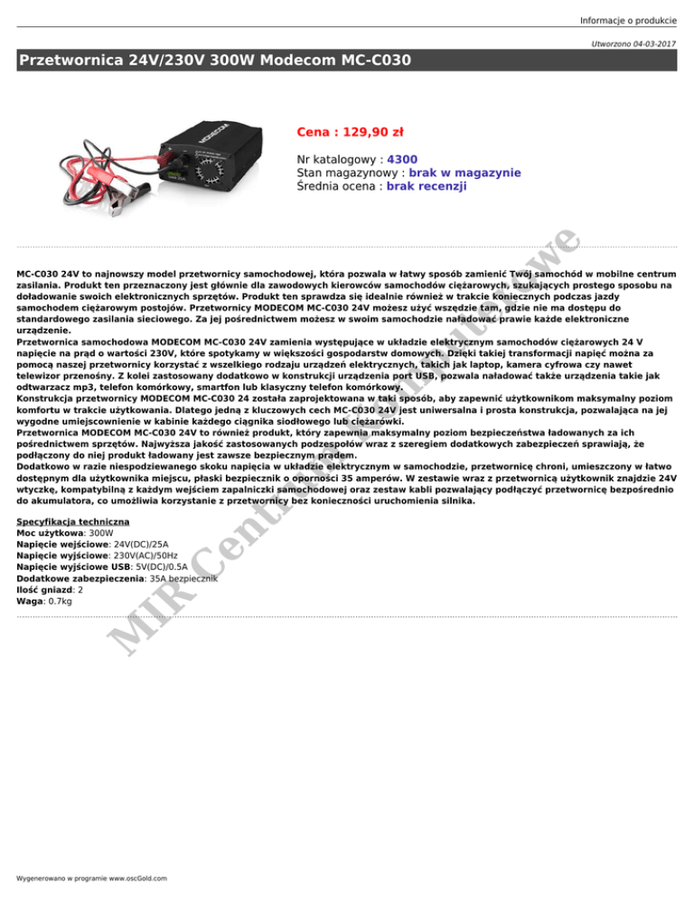 Informacje o produkcie Utworzono 04-03-2017 Przetwornica 24V/230V 300W Modecom MC-C030 Cena : 129,90 zł ow e Nr katalogowy : 4300 Stan magazynowy : brak w magazynie Średnia ocena : brak recenzji M IR C en Specyfikacja techniczna Moc użytkowa: 300W Napięcie wejściowe: 24V(DC)/25A Napięcie wyjściowe: 230V(AC)/50Hz Napięcie wyjściowe USB: 5V(DC)/0.5A Dodatkowe zabezpieczenia: 35A bezpiecznik Ilość gniazd: 2 Waga: 0.7kg tr um K om pu te r MC-C030 24V to najnowszy model przetwornicy samochodowej, która pozwala w łatwy sposób zamienić Twój samochód w mobilne centrum zasilania. Produkt ten przeznaczony jest głównie dla zawodowych kierowców samochodów ciężarowych, szukających prostego sposobu na doładowanie swoich elektronicznych sprzętów. Produkt ten sprawdza się idealnie również w trakcie koniecznych podczas jazdy samochodem ciężarowym postojów. Przetwornicy MODECOM MC-C030 24V możesz użyć wszędzie tam, gdzie nie ma dostępu do standardowego zasilania sieciowego. Za jej pośrednictwem możesz w swoim samochodzie naładować prawie każde elektroniczne urządzenie. Przetwornica samochodowa MODECOM MC-C030 24V zamienia występujące w układzie elektrycznym samochodów ciężarowych 24 V napięcie na prąd o wartości 230V, które spotykamy w większości gospodarstw domowych. Dzięki takiej transformacji napięć można za pomocą naszej przetwornicy korzystać z wszelkiego rodzaju urządzeń elektrycznych, takich jak laptop, kamera cyfrowa czy nawet telewizor przenośny. Z kolei zastosowany dodatkowo w konstrukcji urządzenia port USB, pozwala naładować także urządzenia takie jak odtwarzacz mp3, telefon komórkowy, smartfon lub klasyczny telefon komórkowy. Konstrukcja przetwornicy MODECOM MC-C030 24 została zaprojektowana w taki sposób, aby zapewnić użytkownikom maksymalny poziom komfortu w trakcie użytkowania. Dlatego jedną z kluczowych cech MC-C030 24V jest uniwersalna i prosta konstrukcja, pozwalająca na jej wygodne umiejscownienie w kabinie każdego ciągnika siodłowego lub ciężarówki. Przetwornica MODECOM MC-C030 24V to również produkt, który zapewnia maksymalny poziom bezpieczeństwa ładowanych za ich pośrednictwem sprzętów. Najwyższa jakość zastosowanych podzespołów wraz z szeregiem dodatkowych zabezpieczeń sprawiają, że podłączony do niej produkt ładowany jest zawsze bezpiecznym prądem. Dodatkowo w razie niespodziewanego skoku napięcia w układzie elektrycznym w samochodzie, przetwornicę chroni, umieszczony w łatwo dostępnym dla użytkownika miejscu, płaski bezpiecznik o oporności 35 amperów. W zestawie wraz z przetwornicą użytkownik znajdzie 24V wtyczkę, kompatybilną z każdym wejściem zapalniczki samochodowej oraz zestaw kabli pozwalający podłączyć przetwornicę bezpośrednio do akumulatora, co umożliwia korzystanie z przetwornicy bez konieczności uruchomienia silnika. Wygenerowano w programie www.oscGold.com