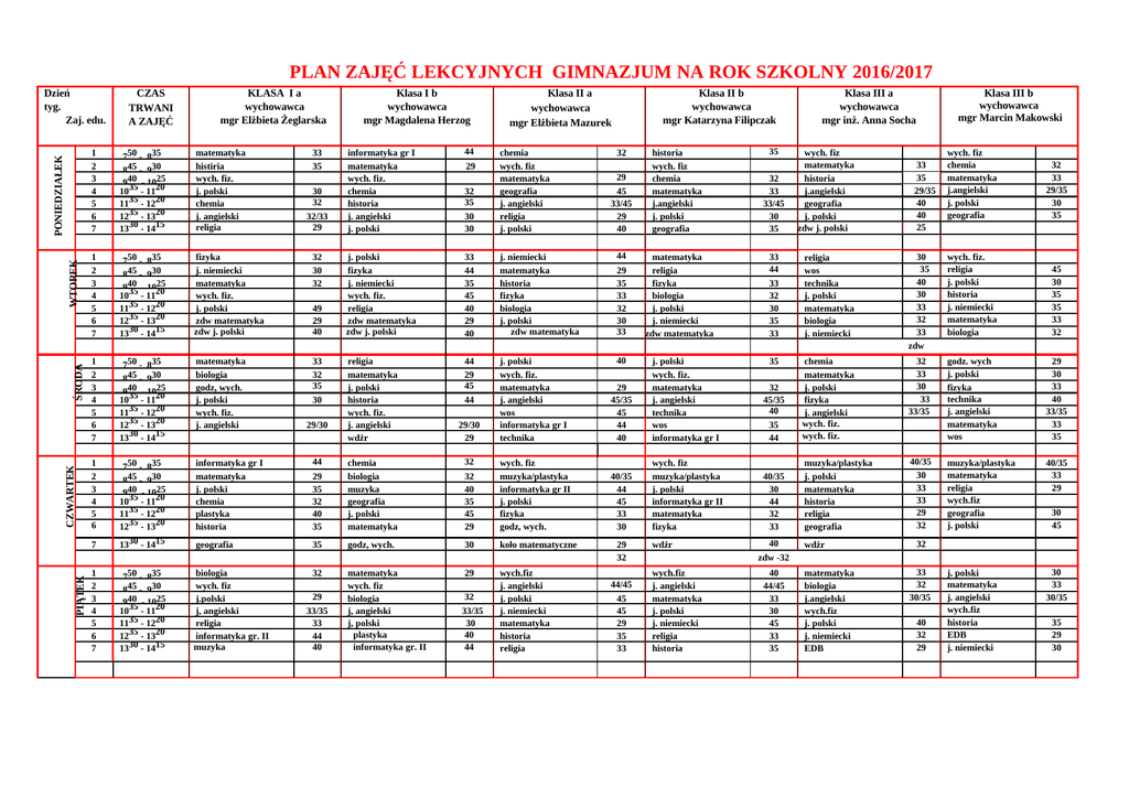 Plan zajęć lekcyjnych gimnazjum 2016/2017