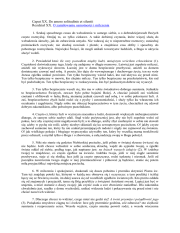 Caput XX. De amore solitudinis et silentii Rozdział XX. O zamiłowaniu samotności i milczenia 1. Szukaj sposobnego czasu do wchodzenia w samego siebie, a o dobrodziejstwach Bożych często rozmyślaj. Omijaj to, co tylko ciekawe. A takie dobieraj czytania, które więcej służą do wzbudzenia skruchy, jak do zabawienia umysłu. Nie wdawaj się w niepotrzebne rozmowy; zaniechaj próżniackich rozrywek; nie słuchaj nowinek i plotek; a znajdziesz czas obfity i sposobny do pobożnego rozmyślania. Najwięksi Święci, ile mogli unikali towarzystw ludzkich, a Bogu w ukryciu służyć woleli. 2. Powiedział ktoś: Ile razy poszedłem między ludzi, mniejszym wróciłem człowiekiem (1). Częstokroć doświadczamy tego, kiedy się zadajemy w długie rozmowy. Łatwiej jest zupełnie milczeć, aniżeli nie wykroczyć słowem. Łacniej jest w domu bezpiecznie przebywać, aniżeli za domem dostatecznie czuwać nad sobą. A przeto, kto dąży do wewnętrznego i duchowego życia, ten na wzór Jezusa zgiełku unikać powinien. Ten tylko bezpieczny wśród ludzi, kto rad ukrywa się przed nimi. Ten tylko bezpieczny w mowie, kto chętnie milczy. Ten tylko bezpieczny na przełożeństwie, kto rad być podwładnym. Ten tylko bezpieczny w rozkazywaniu, kto być posłusznym dobrze się wyuczył. 3. Ten tylko bezpiecznie weseli się, kto ma w sobie świadectwo dobrego sumienia. Jednakże to bezpieczeństwo Świętych, zawsze było pełne bojaźni Bożej. A chociaż jaśnieli oni wielkimi cnotami i obfitowali w łaskę Bożą, niemniej jednak czuwali nad sobą, i w sobie pokornymi byli. A zaś, bezpieczeństwo złych ludzi rodzi się z pychy i zarozumiałości, i służy tylko ku własnemu ich oszukaniu i zagubieniu. Nigdy sobie nie obiecuj bezpieczeństwa w tym życiu, chociażbyś się zdawał dobrym zakonnikiem, albo pobożnym pustelnikiem. 4. Często ci, którzy byli w wyższym szacunku u ludzi, doznawali większych niebezpieczeństw dlatego, że samym sobie nazbyt ufali. Stąd wiele pożyteczniej jest, aby nie byli zupełnie wolni od pokus, lecz aby częściej nimi nagabywani byli; a to dlatego, ażeby zbyt zaufanymi w sobie nie stawali się; ażeby w pychę nie rośli; ażeby niezbyt skłaniali się ku zewnętrznym pociechom. O! jakby czyste zachował sumienie ten, który by nie szukał przemijających radości i nigdy nie zajmował się światem. O! jak wielkiego pokoju i błogiego wypoczynku używałby ten, który by wszelką marną troskliwość precz odrzucił, a myślał tylko o Bogu i o zbawieniu, a całą nadzieję swoją w Bogu położył. 5. Nikt nie stanie się godzien Niebieskiej pociechy, jeśli pilnie w świętej skrusze ćwiczyć się nie będzie. Jeśli chcesz wzbudzić w sobie serdeczną skruchę, wejdź do sypialni twojej, a zgiełki świata oddal od siebie, podług tego, jak napisano jest: na łożach waszych żałujcie (2). W izdebce twojej to znajdziesz, co często zgubisz na świecie. Izdebka twoja, jeśli w niej ciągle samotnie przebywasz, staje ci się słodką; lecz jeśli ją często opuszczasz, rodzi tęsknotę i niesmak. Jeśli od początku nawrócenia twego ciągle w niej przemieszkiwać i pilnować ją będziesz, stanie się potem miłą przyjaciółką i najwdzięczniejszą pociechą. 6. W milczeniu i spokojności, doskonali się dusza pobożna i przenika skrytości Pisma św. Tam też znajduje potoki łez, którymi w każdą noc obmywa się i oczyszcza: a tym poufalej i ściślej łączy się ze Stwórcą swoim, im dalej usuwa się od wszelkich zgiełków światowych. Kto przeto oddala się od znajomych i przyjaciół, temu się Bóg przybliży z świętymi Aniołami swymi. Lepiej jest być w utajeniu, a mieć staranie o duszy swojej: jak czynić cuda a swe zbawienie zaniedbać. Dla zakonnika chwalebnie jest, rzadko z domu wychodzić, unikać widzenia ludzi i pokazywania się przed nimi i nie chcieć nawet ich widzieć. 7. Dlaczego chcesz to widzieć, czego mieć nie godzi się? A świat przemija i pożądliwość jego (3). Pożądania zmysłowe ciągną tu i ówdzie: lecz gdy przeminie godzina, cóż odnosisz? oto ciężkość sumienia i rozproszenie serca. Wesołe wyjście, często smutny powrót rodzi, a wesoła wieczorna zabawa, często zasępia następny poranek. Tak wszelka zmysłowa radość wchodzi łagodnie: ale na koniec gryzie i zabija. 8. Cóż obaczysz gdzie indziej, czego byś tu nie widział? Oto widzisz niebo, ziemię i wszystkie żywioły; a wszystko co jest, z nich uczynione jest. I gdzież ujrzysz co takiego, co by długo pod słońcem trwać mogło? Myślisz może, że się nasycisz, lecz tego nigdy nie dopniesz. Gdybyś razem widział świat cały, cóżby to było? marne widziadło! Wznieś oczy ku Bogu: a módl się za twoje niedbalstwa i grzechy. Zostaw marności marnym; a sam dąż ku temu, co Bóg przykazał. Zamknij za sobą drzwi twoje i przyzwij ku sobie Jezusa, Ukochanego twego. I z Nim pozostań w izdebce twojej, albowiem nie znajdziesz nigdzie tyle pokoju. Gdybyś nie wychodził od siebie, a żadnych pogłosek nie słuchał, lepiej byś zachował słodki a bezpieczny pokój. Lecz skoro bawisz się niekiedy słuchaniem nowinek, wnet za to niepokój serca cierpieć musisz. Przypisy: (1) Seneka, list 7. (2) Ps. IV, 5. (3) List I Jan. II, 17.