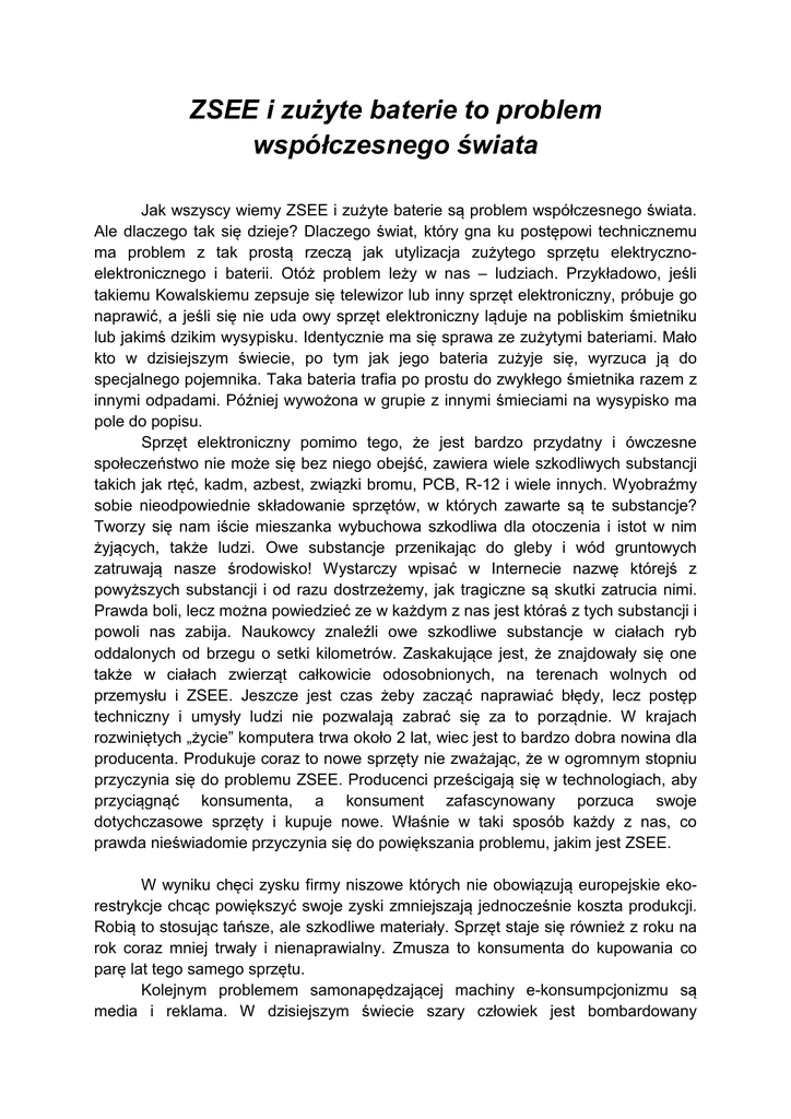 ZSEE i zużyte baterie to problem współczesnego świata Jak wszyscy wiemy ZSEE i zużyte baterie są problem współczesnego świata. Ale dlaczego tak się dzieje? Dlaczego świat, który gna ku postępowi technicznemu ma problem z tak prostą rzeczą jak utylizacja zużytego sprzętu elektrycznoelektronicznego i baterii. Otóż problem leży w nas – ludziach. Przykładowo, jeśli takiemu Kowalskiemu zepsuje się telewizor lub inny sprzęt elektroniczny, próbuje go naprawić, a jeśli się nie uda owy sprzęt elektroniczny ląduje na pobliskim śmietniku lub jakimś dzikim wysypisku. Identycznie ma się sprawa ze zużytymi bateriami. Mało kto w dzisiejszym świecie, po tym jak jego bateria zużyje się, wyrzuca ją do specjalnego pojemnika. Taka bateria trafia po prostu do zwykłego śmietnika razem z innymi odpadami. Później wywożona w grupie z innymi śmieciami na wysypisko ma pole do popisu. Sprzęt elektroniczny pomimo tego, że jest bardzo przydatny i ówczesne społeczeństwo nie może się bez niego obejść, zawiera wiele szkodliwych substancji takich jak rtęć, kadm, azbest, związki bromu, PCB, R-12 i wiele innych. Wyobraźmy sobie nieodpowiednie składowanie sprzętów, w których zawarte są te substancje? Tworzy się nam iście mieszanka wybuchowa szkodliwa dla otoczenia i istot w nim żyjących, także ludzi. Owe substancje przenikając do gleby i wód gruntowych zatruwają nasze środowisko! Wystarczy wpisać w Internecie nazwę którejś z powyższych substancji i od razu dostrzeżemy, jak tragiczne są skutki zatrucia nimi. Prawda boli, lecz można powiedzieć ze w każdym z nas jest któraś z tych substancji i powoli nas zabija. Naukowcy znaleźli owe szkodliwe substancje w ciałach ryb oddalonych od brzegu o setki kilometrów. Zaskakujące jest, że znajdowały się one także w ciałach zwierząt całkowicie odosobnionych, na terenach wolnych od przemysłu i ZSEE. Jeszcze jest czas żeby zacząć naprawiać błędy, lecz postęp techniczny i umysły ludzi nie pozwalają zabrać się za to porządnie. W krajach rozwiniętych „życie” komputera trwa około 2 lat, wiec jest to bardzo dobra nowina dla producenta. Produkuje coraz to nowe sprzęty nie zważając, że w ogromnym stopniu przyczynia się do problemu ZSEE. Producenci prześcigają się w technologiach, aby przyciągnąć konsumenta, a konsument zafascynowany porzuca swoje dotychczasowe sprzęty i kupuje nowe. Właśnie w taki sposób każdy z nas, co prawda nieświadomie przyczynia się do powiększania problemu, jakim jest ZSEE. W wyniku chęci zysku firmy niszowe których nie obowiązują europejskie ekorestrykcje chcąc powiększyć swoje zyski zmniejszają jednocześnie koszta produkcji. Robią to stosując tańsze, ale szkodliwe materiały. Sprzęt staje się również z roku na rok coraz mniej trwały i nienaprawialny. Zmusza to konsumenta do kupowania co parę lat tego samego sprzętu. Kolejnym problemem samonapędzającej machiny e-konsumpcjonizmu są media i reklama. W dzisiejszym świecie szary człowiek jest bombardowany reklamami o sprzęcie jaki musi posiadać. Po sporej dawce manipulacyjnej kampanii reklamowej klient idzie do sklepu i kupuje niepotrzebny mu sprzęt. Najczęściej jest to sprzęt tani i produkcji Chińskiej, więc psuje się i ląduje na wysypiskach. Główną winę śmieciowego problemu ponoszą nie konsumenci, lecz wielkie firmy elektroniczne. Dlaczego? Otóż to proste. Większość firm nie zajmuje się segregowaniem śmieci oraz ich ponownym przetworzeniem. Producenci baterii nie organizują zbiórek swoich zużytych wyrobów. Konsument więc nie ma nawet szansy wpłynąć na środowisko. Gdyby firmy zamieszczały do sprzętu instrukcje co robić ze starym sprzętem wtedy konsument byłby poinformowany i nie mógłby się tak łatwo wywinąć od obowiązku segregacji i utylizacji e-śmieci. Trudnym zagadnieniem jest segregacja e-sprzętu z wysypisk. Jak wiemy na wysypiskach lądują nie tylko e-śmieci, ale także śmieci organiczne. Wiele państw zatrudnia ludzi do segregacji, jednak jest to praca niebezpieczna ponieważ zmusza do pracy w warunkach niebezpiecznych. Stare baterie i jarzeniówki są bardzo niebezpieczne do segregowania, ponieważ zawierają niebezpieczne pierwiastki rakotwórcze. Z przedstawionym problemem można walczyć w bardzo skuteczny sposób. Na sam początek należałoby zacząć pracować u podstaw społecznych. Należy uświadomić ludzi poprzez m.in. taki konkurs jak „Drugie życie elektrośmieci” oraz różne kampanie. Jednak nie wystarczy wyemitować paru reklam i dać kilka wzniosłych przemów. Należy pracować z dziećmi od najmłodszych lat. To zadanie dla nauczycieli którzy muszą wyrobić dobre nawyki w dzieciach i młodzieży. Następnie należałoby zabrać się za producentów. Pierwszym sposobem powinno być zaostrzenie prawa i kar wobec firm które prowadzą szkodliwą politykę ekologiczną. Również powinno się zachęcić konsumenta do segregacji i recyklingu. Przykładowo firma SONY zorganizowała zbiórkę starego sprzętu w zamian oferują 20% rabatu na ich nowy sprzęt. To sprawia że klientowi „chce się” zanieść stary telewizor ponieważ, dostanie za to rabat na nowy sprzęt. Firmy powinny również tworzyć przyzakładowe punkty utylizacji i recyklingu śmieci. Pozwoliłoby to im na wykorzystanie starego sprzętu oraz oczyszczenie rynku ze zbędnych e-odpadów.