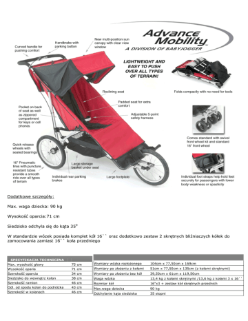 Dodatkowe szczegóły: Max. waga dziecka: 90 kg Wysokość oparcia:71 cm Siedzisko odchyla się do kąta 350 W standardzie wózek posiada komplet kół 16`` oraz dodatkowo zestaw 2 skrętnych bliźniaczych kółek do zamocowania zamiast 16`` koła przedniego SPECYFIKACJA TECHNICZNA 75 cm Wymiary wózka rozłożonego 104cm x 77,50cm x 169cm Wysokość oparia 71 cm Wymiary po złożeniu z kołami 51cm x 77,50cm x 135cm (z kołami skrętnymi) Szerokość oparcia 34 cm Wymiary po złożeniu bez kół 39,50cm x 61cm x 119,50cm Siedzisko do wewnątrz kolan 38 cm Waga wózka 13,4 kg z kołami skrętnymi /13,6 kg z kołami 3 x 16`` Szerokość ramion 46 cm Rozmiar kół 16"x3 + zestaw kół skrętnych przednich Odl. od spodu kolan do podnóżka 43 cm Max.waga dziecka 90 kg Szerokość w kolanach 46 cm Odchylanie kąta siedziska 35 stopni Max. wysokość głowy