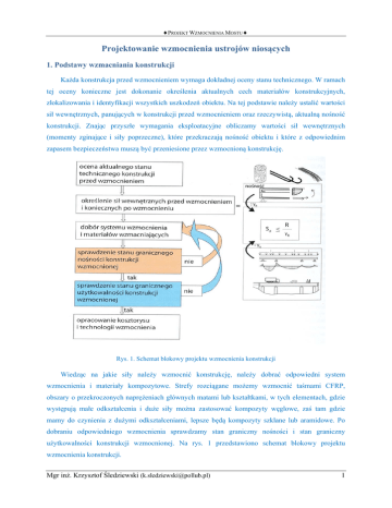 PROJEKT WZMOCNIENIA MOSTU Projektowanie wzmocnienia ustrojów niosących 1. Podstawy wzmacniania konstrukcji Każda konstrukcja przed wzmocnieniem wymaga dokładnej oceny stanu technicznego. W ramach tej oceny konieczne jest dokonanie określenia aktualnych cech materiałów konstrukcyjnych, zlokalizowania i identyfikacji wszystkich uszkodzeń obiektu. Na tej podstawie należy ustalić wartości sił wewnętrznych, panujących w konstrukcji przed wzmocnieniem oraz rzeczywistą, aktualną nośność konstrukcji. Znając przyszłe wymagania eksploatacyjne obliczamy wartości sił wewnętrznych (momenty zginające i siły poprzeczne), które przekraczają nośność obiektu i które z odpowiednim zapasem bezpieczeństwa muszą być przeniesione przez wzmocnioną konstrukcję. Rys. 1. Schemat blokowy projektu wzmocnienia konstrukcji Wiedząc na jakie siły należy wzmocnić konstrukcję, należy dobrać odpowiedni system wzmocnienia i materiały kompozytowe. Strefy rozciągane możemy wzmocnić taśmami CFRP, obszary o przekroczonych naprężeniach głównych matami lub kształtkami, w tych elementach, gdzie występują małe odkształcenia i duże siły można zastosować kompozyty węglowe, zaś tam gdzie mamy do czynienia z dużymi odkształceniami, lepsze będą kompozyty szklane lub aramidowe. Po dobraniu odpowiedniego wzmocnienia sprawdzamy stan graniczny nośności i stan graniczny użytkowalności konstrukcji wzmocnionej. Na rys. 1 przedstawiono schemat blokowy projektu wzmocnienia konstrukcji. Mgr inż. Krzysztof Śledziewski ([email protected]) 1 PROJEKT WZMOCNIENIA MOSTU 2. Zginane elementy betonowe W budownictwie mostowym za pomocą taśm kompozytowych FRP przyklejanych do stref rozciąganych mogą być wzmacniane zginane elementy konstrukcyjne, takie jak belki, płyty, słupy itp. Kierunek włókien musi być równoległy do naprężeń rozciągających. Metoda obliczeń odnosi się do stanu granicznego nośności oraz stanu granicznego użytkowalności. Przy projektowaniu wzmocnienia elementu zginanego zakłada się w stanie granicznym nośności pełną współpracę istniejącego zbrojenia z przyklejonym kompozytem. Dla określenia odkształceń panujących w zbrojeniu istniejącym w fazie przyklejania kompozytów można przyjąć, że przekrój żelbetowy (niewzmocniony) pracuje w stanie granicznym zarysowania. W ten sposób określa się punkt czasowy, w którym zaczyna się współpraca zbrojenia istniejącego z przyklejanym. Dla tych konstrukcji, w których nie dopuszcza się zarysowania, np. dla ustrojów z betonu sprężonego (przy pełnym sprężeniu), należy przyjmować rzeczywisty stan konstrukcji, tj. I fazę pracy betonu. W każdym przypadku konieczne jest znalezienie odkształcenia początkowego εo , które powstaje w momencie, gdy do współpracy zostaje włączone wzmocnienie w postaci doklejonego elementu. Odkształcenie to jest wywołane działaniem momentu (początkowego) zginającego Mo, działającego na przekrój poprzeczny w fazie wzmacniania (np. wywołanego ciężarem własnym konstrukcji, częścią obciążeń stałych itp.). Oblicza się je z równowagi sił wewnętrznych w przekroju. 3. Procedura projektowania 3.1. Krok I Dane: Taśma – fLU, EL, AL, εL, kL Stal - fsy, Es, As, εg, ks Beton – fc, εcu, Przekrój b, d, h Rys. 2. Przekrój poprzeczny wzmacnianej konstrukcji Mgr inż. Krzysztof Śledziewski ([email protected]) 2 PROJEKT WZMOCNIENIA MOSTU 3.2. Krok II Określenie odkształceń (Kryterium zniszczenia: zniszczenie taśmy i uplastycznienie stali przed zniszczeniem betonu): kL f Lu EL L kL Lu sy s,max s ks g c cu 3.3. Krok III W celu uproszczenia obliczeń, można zastąpić krzywoliniowy rozkład naprężeń w strefie ściskanej betonu rozkładem prostokątnym o szerokości k1fc, z położeniem środka ciężkości w odległości k2x (licząc od skrajnych włókien ściskanych betonu). Rys. 3. Rozkład odkształceń i sił wewnętrznych oraz współczynniki ki Współczynniki k1 i k2 są uzależnione od maksymalnego odkształcenia betonu ściskanego εc: dla c 2‰ 1000 (500 c2 3 c ) 6 750 c 4 k2 1 2(500 c 3) k1 c 1000 c (250 c 1) f c dla 2‰ c c 3.5‰ k1 1 1 1500 c k2 1 0.5 (3 106 c2 )1 1 (1500 c )1 c fc Mgr inż. Krzysztof Śledziewski ([email protected]) 3 PROJEKT WZMOCNIENIA MOSTU Z równowagi sił w przekroju (rys. 3) uzyskujemy: siła przenoszona przez beton ściskany Dc k1bxf c siła w rozciąganym zbrojeniu stalowym Z s s As fsy As siła w doklejonym kompozycie Z L L AL f Lu AL 3.4. Krok IV Określenie położenia osi x z równowagi sił w przekroju (rys. 3): Z s Z L Dc 0 fsy As f Lu AL k1bxf c 0 W drodze iteracji znajdujemy x. 3.5. Krok V Sprawdzenie odkształceń: L x co (h x) w betonie c w stali s L w kompozycie L kL L,max (d x) so hx Jeżeli nie OK => nowe założenia Jeżeli OK => nośność przekroju: M R (d k2 x) Z s (h k2 x)ZL Stopień wzmocnienia: B MR M0 gdzie: MR – obliczeniowa wartość momentu niszczącego przekroju wzmocnionego, M0 – obliczeniowa wartość momentu niszczącego przekroju nie wzmocnionego. Należy spełnić warunek: B 2 Źródło: Marek Łagoda (2012): Wzmacnianie konstrukcji mostowych kompozytami polimerowymi. PAN, Warszawa. Mgr inż. Krzysztof Śledziewski ([email protected]) 4