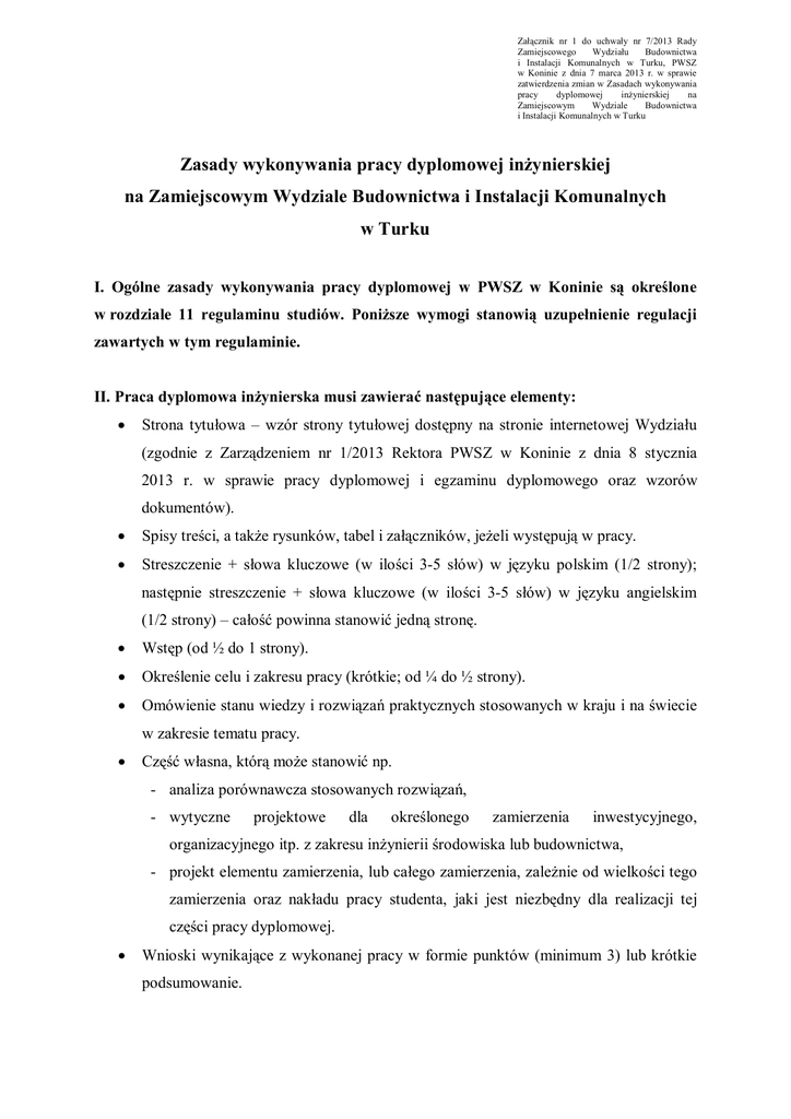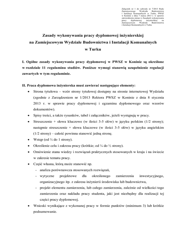 Załącznik nr 1 do uchwały nr 7/2013 Rady Zamiejscowego Wydziału Budownictwa i Instalacji Komunalnych w Turku, PWSZ w Koninie z dnia 7 marca 2013 r. w sprawie zatwierdzenia zmian w Zasadach wykonywania pracy dyplomowej inżynierskiej na Zamiejscowym Wydziale Budownictwa i Instalacji Komunalnych w Turku Zasady wykonywania pracy dyplomowej inżynierskiej na Zamiejscowym Wydziale Budownictwa i Instalacji Komunalnych w Turku I. Ogólne zasady wykonywania pracy dyplomowej w PWSZ w Koninie są określone w rozdziale 11 regulaminu studiów. Poniższe wymogi stanowią uzupełnienie regulacji zawartych w tym regulaminie. II. Praca dyplomowa inżynierska musi zawierać następujące elementy: Strona tytułowa – wzór strony tytułowej dostępny na stronie internetowej Wydziału (zgodnie z Zarządzeniem nr 1/2013 Rektora PWSZ w Koninie z dnia 8 stycznia 2013 r. w sprawie pracy dyplomowej i egzaminu dyplomowego oraz wzorów dokumentów). Spisy treści, a także rysunków, tabel i załączników, jeżeli występują w pracy. Streszczenie + słowa kluczowe (w ilości 3-5 słów) w języku polskim (1/2 strony); następnie streszczenie + słowa kluczowe (w ilości 3-5 słów) w języku angielskim (1/2 strony) – całość powinna stanowić jedną stronę. Wstęp (od ½ do 1 strony). Określenie celu i zakresu pracy (krótkie; od ¼ do ½ strony). Omówienie stanu wiedzy i rozwiązań praktycznych stosowanych w kraju i na świecie w zakresie tematu pracy. Część własna, którą może stanowić np. - analiza porównawcza stosowanych rozwiązań, - wytyczne projektowe dla określonego zamierzenia inwestycyjnego, organizacyjnego itp. z zakresu inżynierii środowiska lub budownictwa, - projekt elementu zamierzenia, lub całego zamierzenia, zależnie od wielkości tego zamierzenia oraz nakładu pracy studenta, jaki jest niezbędny dla realizacji tej części pracy dyplomowej. Wnioski wynikające z wykonanej pracy w formie punktów (minimum 3) lub krótkie podsumowanie. Spis wykorzystanych materiałów (liczba pozycji zależna od tematu pracy, ale minimum 10), z podziałem na: - publikowane: literatura podstawowa o charakterze publikacji naukowych (najbardziej wskazane), książki, poradniki zawodowe; - niepublikowane - opracowania niepublikowane znanych firm i instytucji (w przypadku opracowań niepublikowanych obowiązuje podanie nazwy firmy lub instytucji oraz jej adresu); - akty prawne: ustawy, rozporządzenia, dyrektywy, normy itp. dotyczące tematu pracy dyplomowej; - materiały internetowe (zweryfikowane przez promotora). III. Wymogi techniczne: 1. Czcionka: - Times New Roman, wielkość czcionki 12, lub Arial, wielkość czcionki 11. 2. Odstępy między wierszami: 1,5 3. Marginesy: - po stronie grzbietu: 3,5 cm; - po przeciwnej stronie: 2,5 cm - górny: 2,5 cm; - dolny: 2,5 cm. 4. Druk dwustronny. Minimalną objętość pracy dyplomowej inżynierskiej określono na 40 stron. IV. Pracę dyplomową student składa w dziekanacie w postaci: a) dwóch egzemplarzy w twardej oprawie introligatorskiej - dla promotora i recenzenta, b) jednego egzemplarza w miękkiej oprawie, trwale ale możliwie cienko zszytego (bindowanie nie jest zalecane) - do archiwum, c) płyty CD z całą treścią pracy zapisaną w formacie PDF; na płycie należy napisać wodoodpornym pisakiem imię i nazwisko autora oraz tytuł pracy dyplomowej. Na końcu egzemplarza w miękkiej oprawie student umieszcza (w następnej kolejności): kartę ewidencyjną pracy oraz oświadczenie o samodzielnym wykonaniu pracy (obydwa wymienione formularze można pobrać z dziekanatu lub ze strony internetowej wydziału).