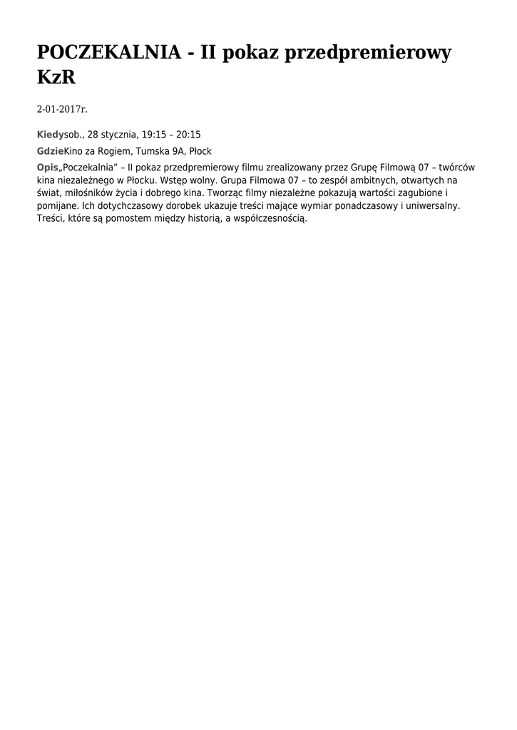POCZEKALNIA - II pokaz przedpremierowy KzR 2-01-2017r. Kiedysob., 28 stycznia, 19:15 – 20:15 GdzieKino za Rogiem, Tumska 9A, Płock Opis„Poczekalnia” – II pokaz przedpremierowy filmu zrealizowany przez Grupę Filmową 07 – twórców kina niezależnego w Płocku. Wstęp wolny. Grupa Filmowa 07 – to zespół ambitnych, otwartych na świat, miłośników życia i dobrego kina. Tworząc filmy niezależne pokazują wartości zagubione i pomijane. Ich dotychczasowy dorobek ukazuje treści mające wymiar ponadczasowy i uniwersalny. Treści, które są pomostem między historią, a współczesnością.