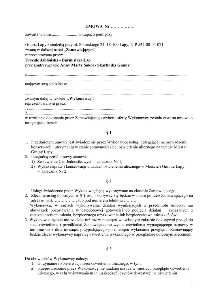 UMOWA Nr ……………. zawarta w dniu ........................ w Łapach pomiędzy: Gminą Łapy z siedzibą przy ul. Sikorskiego 24, 18-100 Łapy, NIP 542-00-04-071 zwaną w dalszej treści „Zamawiającym" reprezentowaną przez: Urszulę Jabłońską - Burmistrza Łap przy kontrasygnacie Anny Marty Sokół - Skarbnika Gminy a ....................................................................................................................................................... ....................................................................................................................................................... mającym swą siedzibę w .......................................................................................................................... ....................................................................................................................................................... zwanym dalej w tekście „Wykonawcą”, reprezentowanym przez: 1. ....................................................................................... 2. ....................................................................................... w rezultacie dokonania przez Zamawiającego wyboru oferty Wykonawcy została zawarta umowa o następującej treści: §1 1. Przedmiotem umowy jest świadczenie przez Wykonawcę usługi polegającej na prowadzeniu konserwacji i utrzymaniu w stanie sprawności sieci oświetlenia ulicznego na terenie Miasta i Gminy Łapy. 2. Integralną część umowy stanowi: 1) Zestawienie Cen Jednostkowych – załącznik Nr 1, 2) Wykaz napraw i konserwacji urządzeń oświetlenia ulicznego w Mieście i Gminie Łapy – załącznik Nr 2. §2 1. Usługi świadczone przez Wykonawcę będą wykonywane na zlecenie Zamawiającego. 2. Zlecanie usług opisanych w § 1 ust. 1 odbywać się będzie w miarę potrzeb Zamawiającego na adres e-mail……………… lub pod numerem telefonu ……….. Wykonawca, w ramach wykonywania działań wynikających z przedmiotu umowy, ma obowiązek pozostawania w całodobowej gotowości do podjęcia działań związanych z zabezpieczeniem mienia, bezpiecznego użytkowania lub bezpieczeństwa mieszkańców. 3. Wykonawca będzie nie rzadziej niż raz w miesiącu we własnym zakresie dokonywał przeglądu sieci oświetlenia i przedkładał Zamawiającemu wykaz oświetlenia wymagającego naprawy w terminie do 5 dnia miesiąca przypadającego po miesiącu wykonania przeglądu. Zamawiający będzie zlecał wykonawcy naprawę oświetlenia wykazanego w przeglądzie odrębnym zleceniem. §3 Do obowiązków Wykonawcy należy: 1. Utrzymanie i konserwacja sieci oświetlenia ulicznego, w tym: a) przeprowadzanie przez Wykonawcę nie rzadziej niż raz w miesiącu przeglądu oświetlenia ulicznego, w celu wykrywania m.in. uszkodzeń, czynów dewastacji na oświetleniu 1 ulicznym, oceny stanu technicznego, w oparciu o które dokonywana będzie konserwacja poszczególnych urządzeń, b) wymianę niesprawnych źródeł światła, c) demontaż opraw, wysięgników, okablowania, d) wymianę i naprawę uszkodzonych elementów opraw, e) regulację położenia źródeł światła względem kloszy i odbłyśników, f) czyszczenie opraw, mycie kloszy i odbłyśników odpowiednio do potrzeb, g) wymianę niesprawnych bezpieczników, styczników, zegarów sterujących, wysięgników, h) wymianę uszkodzonego osprzętu elektrycznego w oprawach, i) przegląd, konserwację i wymianę wyeksploatowanych złącz kablowych zasilających, j) konserwację słupów, wysięgników, przewieszek, konstrukcji wsporczych, k) wymiana i malowanie szaf oświetleniowych (sterowniczych), uzupełnianie opisów, l) prostowanie pochylonych słupów i wysięgników oświetlenia, m) uzupełnianie i konserwację zamknięć skrzynek, wnęk słupowych, itp., n) przegląd i konserwację aparatury łączeniowej i sterowniczej, o) ustawianie i regulacje zegarów sterowniczych oświetlenia, p) wymianę niesprawnych urządzeń sterowniczych (zegarów, styczników, dławików, gniazd bezpiecznikowych, kabli, itp.), q) wymianę uszkodzonych przewodów w słupach oświetleniowych i wysięgnikach, r) usuwanie zwarć na liniach napowietrznych nN, s) regulację zwisów oświetlenia drogowego, t) lokalizację i naprawę uszkodzonych kabli zasilających obwody oświetleniowe, u) naprawę zerwanych lub uszkodzonych przewodów oświetlenia ulicznego w sieci podwieszonej, v) wymianę (naprawę) uszkodzonych skrzynek sterowania oświetleniem ulicznym podwieszonych na słupach linii napowietrznych nN, w) zabezpieczenie i wymianę urządzeń uszkodzonych przez osoby trzecie, np. w wyniku kolizji drogowych (np: słupów oświetlenia wydzielonego, opraw, kloszy, daszków, szaf oświetleniowych, itp.), x) wykonywanie pomiarów napięć i obciążeń, y) pomiary eksploatacyjne (rezystancji uziemień ochronnych, skuteczności ochrony przeciwporażeniowej), z) poprawa rezystancji uziemień opraw oświetleniowych, aa) przyjmowanie zgłoszeń i reklamacji dotyczących niesprawności oświetlenia drogowego, bb) informowanie Zamawiającego o awariach sieci zasilającej i urządzeń sterowniczych powodujących czasowe zaciemnienie ulic, cc) montaż, podłączenie do napięcia oraz demontaż po okresie ekspozycji iluminacji świąteczno-noworocznej w ilości ok. 35 szt. w terminach każdorazowo wyznaczonych przez Zamawiającego, dd) wycinanie gałęzi drzew w obrębie punktu świetlnego wraz z ich utylizacją, ee) pokrywanie kosztów utylizacji zużytych lamp i innych elementów zgodnie z obowiązującymi w tym zakresie przepisami. 2. Usuwanie skutków wandalizmu i skutków wypadków drogowych, tj. uzupełnianie brakujących lub zdewastowanych: a) kloszy, opraw, wysięgników, słupów, układów sterowniczych, kabli oświetleniowych zasilających i sterowniczych, szafek, zamków i zamknięć, tablic oświetleniowych, urządzeń oświetlenia ulicznego i parkowego, b) w przypadku wykrycia sprawcy w