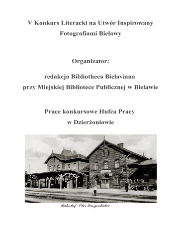 V Konkurs Literacki na Utwór Inspirowany Fotografiami Bielawy Organizator: redakcja Bibliotheca Bielaviana przy Miejskiej Bibliotece Publicznej w Bielawie Prace konkursowe Hufca Pracy w Dzierżoniowie Wyobraźnia przez zamknięte oczy patrzę na starą stację potykając się o tory pędzą przed siebie nigdy nie wiadomo dokąd lecz zawsze jest nadzieja że następna stacja będzie moja nocą szum kół wydaje się głośniejszy niż kiedykolwiek strach w ludzkich snach pobudzają wyobraźnię nie muszę się bać jestem bezpieczny Michał Bokota I miejsce w kategorii młodzież Bielawski pociąg Ludzie czekają Milcząc na stacji Kiedy on będzie Między myślami Czekam i czekam A go wciąż nie ma Czas przez to wszystko Szybko ucieka Patrzę zza rogu On szybko jedzie Kto wejdzie pierwszy Ej z drogi śledzie Miejsca zajęte Tłum ludzi w środku Wszyscy plotkują Od gwaru głośno Jedzie ten pociąg Do przodu w dal Otwieram okno Płynę wśród fal Wiatr gładko dzwoni Zboża kołysze Gra wiatr daleko Melodię słyszę Karolina Zapała Oczekując na pociąg Stoję na stacji. Rozglądam się Patrzę w prawo, w lewo I widzę pustkę. Bielawski wiatr… Bielawski świst… Bielawski mrok… Sylwia Belczak Wspomnienia Stacja Ober Langenbielau Jest opuszczona i zaniedbana Jak patrzę na nią to Aż łza w oku się kręci Po dłuższej chwili Można sobie wyobrazić Ludzi czekających Na pociąg i dzieci bawiące się W chowanego Spoglądam na starą fotografię Wspomnienia wciąż żywe Wanesa Mozolewska Tatuś Któregoś dnia odbyłam wieczorem z tatą taką oto rozmowę. - Kochany tatusiu, proszę Cię bardzo, czy opowiesz mi historię o starym dworcu PKP, który był w Bielawie? Wiem, że się tam wychowywałeś, więc na pewno dużo wiesz o tym miejscu. - Hm… Niech pomyślę… Więc tak Kochana córeczko... Mieszkałem niedaleko niego. Był to duży dworzec PKP. Jeździło tam bardzo dużo pociągów towarowych i osobowych. Można było jeździć nawet na koniec świata. – tata roześmiał się głośno po czym opowiadał dalej. – Wiem to, ponieważ jeździłem często stamtąd wiele razy do swojej siostry do Legnicy. - Tatusiu, a czemu to wszystko przestało działać? – zapytałam znowu. - Ponieważ rozwinął się transport komunikacji miejskiej i PKP już tak nie zarabiało jak wcześniej. Teraz zostały tylko tory zarośnięte przez trawę i chwasty. Chciałbym bardzo powrócić do tamtych czasów… Zamyśliłam się, kiedy leżałam już w łóżku, a potem mocno zasnęłam widząc we śnie pędzące pociągi z taty opowieści. Monika Zagała Pociąg stoją na stacji pociąg z daleka gwiżdże turkocze pędzi przyspiesza ciągnie wagony ciężkie wypchane każdym sukcesem każdym zmaganiem choć nie jest łatwo nie ma że boli mija przeszkody sił ma do woli i nie przystaje podąża dalej żeby osiągnąć cele wytrwale Barbara Bulerska