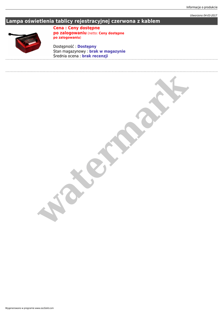 Informacje o produkcie Utworzono 04-03-2017 Lampa oświetlenia tablicy rejestracyjnej czerwona z kablem Cena : Ceny dostępne po zalogowaniu (netto: Ceny dostępne po zalogowaniu) w at er m ar k Dostępność : Dostępny Stan magazynowy : brak w magazynie Średnia ocena : brak recenzji Wygenerowano w programie www.oscGold.com