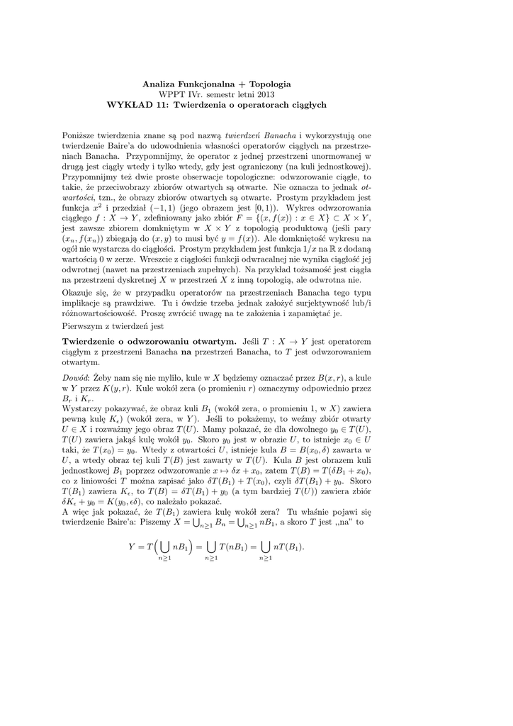 twierdzenie Baire’a do udowodnienia wlasności operatorów cia̧glych na przestrzeniach Banacha. Przypomnijmy, że operator z jednej przestrzeni unormowanej w