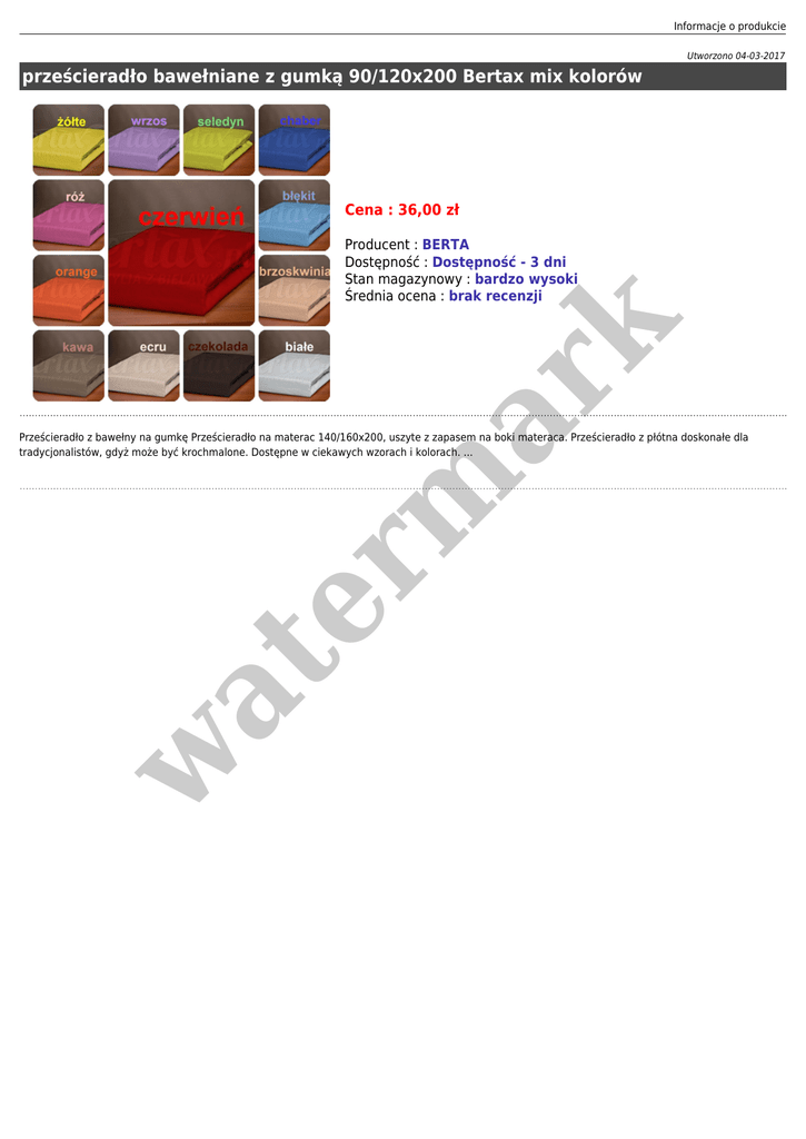 Informacje o produkcie Utworzono 04-03-2017 prześcieradło bawełniane z gumką 90/120x200 Bertax mix kolorów Cena : 36,00 zł er m ar k Producent : BERTA Dostępność : Dostępność - 3 dni Stan magazynowy : bardzo wysoki Średnia ocena : brak recenzji w at Prześcieradło z bawełny na gumkę Prześcieradło na materac 140/160x200, uszyte z zapasem na boki materaca. Prześcieradło z płótna doskonałe dla tradycjonalistów, gdyż może być krochmalone. Dostępne w ciekawych wzorach i kolorach. ...