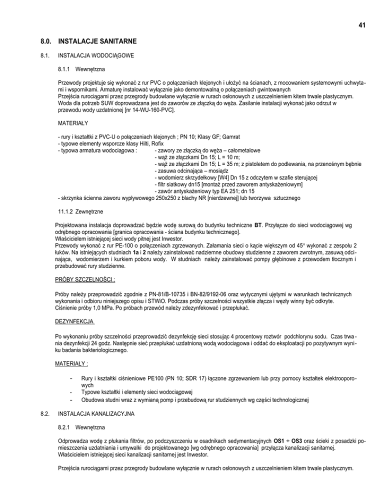 41 8.0. INSTALACJE SANITARNE 8.1. INSTALACJA WODOCIĄGOWE 8.1.1 Wewnętrzna Przewody projektuje się wykonać z rur PVC o połączeniach klejonych i ułożyć na ścianach, z mocowaniem systemowymi uchwytami i wspornikami. Armaturę instalować wyłącznie jako demontowalną o połączeniach gwintowanych Przejścia rurociągami przez przegrody budowlane wyłącznie w rurach osłonowych z uszczelnieniem kitem trwale plastycznym. Woda dla potrzeb SUW doprowadzana jest do zaworów ze złączką do węża. Zasilanie instalacji wykonać jako odrzut w przewodu wody uzdatnionej [nr 14-WU-160-PVC]. MATERIAŁY - rury i kształtki z PVC-U o połączeniach klejonych ; PN 10; Klasy GF; Gamrat - typowe elementy wsporcze klasy Hilti, Rofix - typowa armatura wodociągowa : - zawory ze złączką do węża – całometalowe - wąż ze złączkami Dn 15; L = 10 m; - wąż ze złączkami Dn 15; L = 35 m; z pistoletem do podlewania, na przenośnym bębnie - zasuwa odcinająca – mosiądz - wodomierz skrzydełkowy [W4] Dn 15 z odczytem w szafie sterującej - filtr siatkowy dn15 [montaż przed zaworem antyskażeniowym] - zawór antyskażeniowy typ EA 251; dn 15 - skrzynka ścienna zaworu wypływowego 250x250 z blachy NR [nierdzewnej] lub tworzywa sztucznego 11.1.2 Zewnętrzne Projektowana instalacja doprowadzać będzie wodę surową do budynku techniczne BT. Przyłącze do sieci wodociągowej wg odrębnego opracowania [granica opracowania - ściana budynku technicznego]. Właścicielem istniejącej sieci wody pitnej jest Inwestor. Przewody wykonać z rur PE-100 o połączeniach zgrzewanych. Załamania sieci o kącie większym od 45 o wykonać z zespołu 2 łuków. Na istniejących studniach 1a i 2 należy zainstalować nadziemne obudowy studzienne z zaworem zwrotnym, zasuwą odcinająca, wodomierzem i kurkiem poboru wody. W studniach należy zainstalować pompy głębinowe z przewodem tłocznym i przebudować rury studzienne. PRÓBY SZCZELNOŚCI : Próby należy przeprowadzić zgodnie z PN-81/B-10735 i BN-82/9192-06 oraz wytycznymi ujętymi w warunkach technicznych wykonania i odbioru niniejszego opisu i STWiO. Podczas próby szczelności wszystkie złącza i węzły winny być odkryte. Ciśnienie próby 1,0 MPa. Po próbach przewód należy zdezynfekować i przepłukać. DEZYNFEKCJA Po wykonaniu próby szczelności przeprowadzić dezynfekcję sieci stosując 4 procentowy roztwór podchlorynu sodu. Czas trwa nia dezynfekcji 24 godz. Następnie sieć przepłukać uzdatnioną wodą wodociągowa i oddać do eksploatacji po pozytywnym wyniku badania bakteriologicznego. MATERIAŁY : - 8.2. Rury i kształtki ciśnieniowe PE100 (PN 10; SDR 17) łączone zgrzewaniem lub przy pomocy kształtek elektrooporowych Typowe kształtki i elementy sieci wodociągowej Obudowa studni wraz z wymianą pomp i przebudową rur studziennych wg części technologicznej INSTALACJA KANALIZACYJNA 8.2.1 Wewnętrzna Odprowadza wodę z płukania filtrów, po podczyszczeniu w osadnikach sedymentacyjnych OS1 ÷ OS3 oraz ścieki z posadzki pomieszczenia uzdatniania i umywalki do projektowanego [wg odrębnego opracowania] przyłącza kanalizacji sanitarnej. Właścicielem istniejącej sieci kanalizacji sanitarnej jest Inwestor. Przejścia rurociągami przez przegrody budowlane wyłącznie w rurach osłonowych z uszczelnieniem kitem trwale plastycznym. 42 MATERIAŁY - rury i kształtki z PVC i z PE o połączeniach kielichowych - Wpusty ściekowe Dn 100 z blachy ko; gastronomiczne; klasy AWE Bydgoszcz - Lejki ściekowe [wpusty] Dn 160/110 wykonane z typowych kształtek - redukcji PE - Zlew z blachy ko z tylną ścianką; 400x300 8.2.2 Zewnętrzne Zewnętrzna instalacja kanalizacji wód popłucznych odprowadzać będzie wody popłuczne z filtrów z projektowanej stacji uzdatniania wody. Wody popłuczne kierowane będą do zestawu 3 osadników, w których osadzać się będą zmineralizowane związki żelaza i manganu, a następnie kierowane będą do sieci kanalizacji sanitarnej inwestora [przyłącze wg odrębnego opracowania]. Zakłada się 1 dobowe przetrzymanie wody popłucznej w osadnikach i minimalną 90 % sprawność sedymentacji. Osady będą okresowo wywożone na wysypisko gminne, średnio do 2 razy w roku. Połączenie zewnętrznej instalacji z przyłączem sanitarnym projektuje się z zasyfonowaniem w osadniku O3. Osadniki poddać należy gruntownej renowacji, a osadniku O3 zainstalować odpowietrzenie, wyprowadzone ponad pokrywę osadnika, z instalacją wywietrzaka typ WLO 315. MATERIAŁY : - - Rury i kształtki kanalizacyjne z litego PVC, kielichowe klasy minimum SN8, Studnie z prefabrykatów B45, z użyciem uszczelek elastomerowych z włazem żeliwno betonowym typ D 400; wenty lowanym , Osadniki z prefabrykatów B45; Dn 1,5 m; Hcz. =2,3 m; czynna pojemność łączna Vcz.=4,5 m3, Wywietrzak dachowy typ WLO 315 PRÓBY SZCZELNOŚCI : Próby należy przeprowadzić zgodnie z PN-92/B-10735 oraz wytycznymi ujętymi w warunkach technicznych wykonania i odbioru niniejszego opisu i ST, ciśnieniem 50 kPa. Przewody należy poddać próbie na : - eksfiltrację wody z przewodu w grunt - infiltrację wody do przewodu ( w przypadku posadowienia kolektora poniżej poziomu wód gruntowych) 8.3. INSTALACJA OGRZEWANIA W pomieszczeniach SUW projektuje się ogrzewanie kompensujące straty ciepła w przypadku dłuższego zatrzymania urządzeń elektrycznych SUW [pompy, sprężarka i dmuchawa] w wielkości 50% obliczeniowego zapotrzebowania ciepła równe 1201W. Projektuje się instalację elektrycznych grzejników konwektorowymi z termostatami. Obliczenia strat ciepła dokonano wg programu komputerowego, temperatura obliczeniowa : -16 / +4 o C. MATERIAŁY - grzejniki elektryczne o mocy znamionowej 750 W, konwektorowe z termostatem [element grzewczy umieszczony w płaszczu olejowym]. 8.4. INSTALACJA WENTYLACJI 11.4.1. Budynek techniczny [kubatura 7,5x5,60x3,60 = 151,2 m3] Nawiew : [1N] Przyjęto Wywiew : [1W] LNAW. = 0,5 ÷ 1,0 w/h : - Czerpnie ścienn