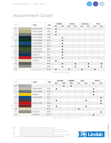 L i nld indab a b A sbtuild r o n i n| g sC o| l ocuorl oCuhracr h t art Assortment Chart ~ NCS ~ RAL 01 S 2005-G60Y 7044 04 S 2010-Y20R 7032 15 S 4010-R90B 7000 16 S 7010-R90B 5008 28 S 7020-B90G 6005 32 S 4550-R90B 5010 33 S 7010-G30Y 6020 34 S 6020-G30Y 6003 35 S 7005-B20G 7011 36 S 6020-B 5001 37 S 2070-Y90R 3000 39 S 1502-Y 9002 44 ---------------- 9007 45 ---------------- 9006 50 ---------------- 9010 # * * * LPA900 25 µ ■ ■ ■ Sinutec 35 µ 25 µ Sinutherm 35 µ 25 µ 35 µ Polar 25 µ 35 µ ■ ■ ■ ■ ■ ■ ■ ■ ■ ■ ■ ■ ■ ■ ■ ■ ■ ■ ■ ■ ■ Quality: Super Polyester # ~ NCS ~ RAL LPR1000 35 µ AZA * 01 S 2005-G60Y 7044 15 S 4010-R90B 7000 19 S1080-Y 1021 32 S 4550-R90B 5010 35 ---------------- 7011 37 S 2070-Y90R 3000 38 ---------------- 3009 39 ---------------- 9002 45 S 2002-B 9006 50 S 0502-G 9010 ■ LMR600 AZA AZA ■ ■ Polar 25 µ GE+ET 35 µ 25 µ ■ ■ ■ ■ ■ ■ ■ ■ ■ 35 µ ■ ■ ■ ■ * GB D F RO PL RUSS These colours may have extended delivery times. Bei diesen Farben kann es zu längeren Lieferzeiten kommen. Ces couleurs peuvent avoir une incidence sur les délais de livraison. Aceste culori pot avea termene extinse de livrare. W przypadku wyboru tych kolorów, termin dostawy może się wydłużyć. для этих цветов сроки поставки возможно будут длительными. 2011/03 TC 303/00 00 © Lindab Buildings Quality: Super Polyester, AZA = Aluzinc lindaLbi nbduilding a b A s tsr o n | c| o lC oo u lrocuhr aC r th a r t 50 39 01 04 19 ■ Due to printing limitations, the shown colours on this chart are not exact. If a precise match is required, a metallic sample should be requested. ■ Aufgrund abweichender Drucktechnik sind die hier gezeigten Farben nur Näherungswerte. Für einen verbindlichen Farbabgleich müssen Blechmuster verwendet werden. ■ En fonction de la qualité AZA 45 44 35 de l’impression, les couleurs reproduites sur cette carte peuvent légèrement différer de la réalité. Si besoin, n’hésitez pas à demander un échantillon métallique. ■ Datorita capacitatii limitate de printare, culorile indicate pe acest grafic nu sunt exacte! Daca este ceruta o potrivire clara, trebuie solicitata o mostra metalica. ■ Ze względu na ograniczenia druku, kolory widoczne na wzorniku mogą nieznacznie odbiegać od rzeczywistej barwy. W przypadku konieczności precyzyjnego dopasowania koloru, sugerujemy posługiwanie się metalowymi próbkami. ■ Из-за особенностей 15 32 36 16 34 33 28 38 печати, цвета в этой таблице не точны! Если требуется точное соответствие цвета, запрашивайте образец материала. 37