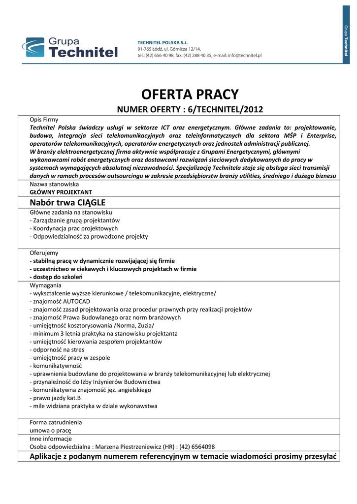 OFERTA PRACY NUMER OFERTY : 6/TECHNITEL/2012 Opis Firmy Technitel Polska świadczy usługi w sektorze ICT oraz energetycznym. Główne zadania to: projektowanie, budowa, integracja sieci telekomunikacyjnych oraz teleinformatycznych dla sektora MŚP i Enterprise, operatorów telekomunikacyjnych, operatorów energetycznych oraz jednostek administracji publicznej. W branży elektroenergetycznej firma aktywnie współpracuje z Grupami Energetycznymi, głównymi wykonawcami robót energetycznych oraz dostawcami rozwiązań sieciowych dedykowanych do pracy w systemach wymagających absolutnej niezawodności. Specjalizacją Technitela staje się obsługa sieci transmisji danych w ramach procesów outsourcingu w zakresie przedsiębiorstw branży utilities, średniego i dużego biznesu Nazwa stanowiska GŁÓWNY PROJEKTANT Nabór trwa CIĄGLE Główne zadania na stanowisku - Zarządzanie grupą projektantów - Koordynacja prac projektowych - Odpowiedzialność za prowadzone projekty Oferujemy - stabilną pracę w dynamicznie rozwijającej się firmie - uczestnictwo w ciekawych i kluczowych projektach w firmie - dostęp do szkoleń Wymagania - wykształcenie wyższe kierunkowe / telekomunikacyjne, elektryczne/ - znajomość AUTOCAD - znajomość zasad projektowania oraz procedur prawnych przy realizacji projektów - znajomość Prawa Budowlanego oraz norm branżowych - umiejętność kosztorysowania /Norma, Zuzia/ - minimum 3 letnia praktyka na stanowisku projektanta - umiejętność kierowania zespołem projektantów - odporność na stres - umiejętność pracy w zespole - komunikatywność - uprawnienia budowlane do projektowania w branży telekomunikacyjnej lub elektrycznej - przynależność do Izby Inżynierów Budownictwa - komunikatywna znajomość jęz. angielskiego - prawo jazdy kat.B - mile widziana praktyka w dziale wykonawstwa Forma zatrudnienia umowa o pracę Inne informacje Osoba odpowiedzialna : Marzena Piestrzeniewicz (HR) : (42) 6564098 Aplikacje z podanym numerem referencyjnym w temacie wiadomości prosimy przesyłać na adres [email protected] Informujemy, że skontaktujemy się tylko z wybranymi kandydatami. Prosimy o dopisanie klauzuli: „Wyrażam zgodę na przetwarzanie moich danych osobowych zawartych w ofercie pracy dla potrzeb niezbędnych do realizacji procesu rekrutacji zgodnie z Ustawą o Ochronie Danych Osobowych z dnia 29.08.97 (Dz.U. Nr 133 poz. 883) ISO 9001:2009