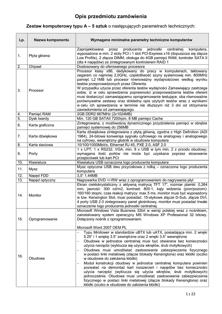 Opis przedmiotu zamówienia Zestaw komputerowy typu A – 5 sztuk o następujących parametrach technicznych: Lp. Nazwa komponentu 1. Płyta główna 2. Chipset 3. Procesor 4. 5. Pamięć RAM Dysk twardy 6. Karta graficzna 7. Karta dźwiękowa 8. Karta sieciowa 9. Porty 10. Klawiatura 11. Mysz 12. 13. Napęd FDD Napęd optyczny 14. Monitor 15. Oprogramowanie 16. Obudowa Wymagane minimalne parametry techniczne komputerów Zaprojektowana przez producenta jednostki centralnej komputera, wyposażona w min. 2 sloty PCI i 1 slot PCI-Express x16 (dopuszcza się złącza Low Profile), 2 złącza DIMM, obsługa do 4GB pamięci RAM, kontroler SATA II (dla 4 napędów) ze zintegrowanym kontrolerem RAID 1 Dostosowany do oferowanego procesora Procesor klasy x86, dedykowany do pracy w komputerach, taktowany zegarem co najmniej 2,0GHz, częstotliwość szyny systemowej min. 800MHz pamięć L2 1MB lub procesor równoważny wydajnościowo według wyniku testów przeprowadzonych przez Oferenta. W przypadku użycia przez oferenta testów wydajności Zamawiający zastrzega sobie, iż w celu sprawdzenia poprawności przeprowadzenia testów oferent musi dostarczyć zamawiającemu oprogramowanie testujące, oba równoważne porównywalne zestawy oraz dokładny opis użytych testów wraz z wynikami w celu ich sprawdzenia w terminie nie dłuższym niż 3 dni od otrzymania zawiadomienia od zamawiającego. 2GB DDR2 667MHz (2x1024MB) Min. 120 GB SATAII 7200rpm, 8 MB pamięci Cache Zintegrowana, z możliwością dynamicznego przydzielenia pamięci w obrębie pamięci systemowej do 256MB Karta dźwiękowa zintegrowana z płytą główną, zgodna z High Definition (ADI 1984), 24-bitowa konwersja sygnału cyfrowego na analogowy i analogowego na cyfrowy, wewnętrzny głośnik w obudowie komputera 10/100/1000Mbit/s, Ethernet RJ 45, PXE 2.0, ASF 2.0 1 x LPT; 1 x RS232, VGA; min. 8 x USB w tym min. 2 z przodu obudowy; wymagana ilość portów nie może być uzyskana poprzez stosowanie przejściówek lub kart PCI Klawiatura USB oznaczona logo producenta komputera Mysz optyczna USB dwu przyciskowa z rolką – oznaczona logo producenta komputera 3,5” 1.44MB Nagrywarka DVD +/-RW wraz z oprogramowaniem do nagrywania płyt Ekran ciekłokrystaliczny z aktywną matrycą TFT 17”, rozmiar plamki: 0,264 mm, jasność: 300 cd/m2, kontrast: 800:1, kąty widzenia (pion/poziom): 160/160 stopni, czas reakcji matrycy: max 5 ms, monitor musi być wyposażony w tzw. Kensington Slot, musi posiadać: 15-stykowe złącze D-Sub, złącze DVI, 4 porty USB 2.0 zintegrowany panel głośnikowy, monitor musi posiadać trwałe oznaczenie logo producenta jednostki centralnej. Microsoft Windows Vista Business 32bit w wersji polskiej wraz z nośnikiem, zainstalowany system operacyjny MS Windows XP Professional 32 bitowy. Dołączony nośnik z oprogramowaniem. Microsoft Word 2007 OEM PL - Typu Minitower w standardzie uBTX lub uATX, posiadająca min. 2 wnęki 5.25” i 1 wnękę 3.5” zewnętrzne oraz 2 wnęki 3.5” wewnętrzne - Obudowa w jednostce centralnej musi być otwierana bez konieczności użycia narzędzi (wyklucza się użycia wkrętów, śrub motylkowych) - Obudowa musi umożliwiać zastosowanie zabezpieczenia fizycznego w postaci linki metalowej (złącze blokady Kensingtona) oraz kłódki (oczko w obudowie do założenia kłódki) - Moduł konstrukcji obudowy w jednostce centralnej komputera powinien pozwalać na demontaż kart rozszerzeń i napędów bez konieczności użycia narzędzi (wyklucza się użycia wkrętów, śrub motylkowych) jednocześnie. Obudowa musi umożliwiać zastosowanie zabezpieczenia fizycznego w postaci linki metalowej (złącze blokady Kensingtona) oraz kłódki (oczko w obudowie do założenia kłódki) 1 z 22 - 17. BIOS 18. Dodatkowe oprogramowanie Zasilacz o mocy min. 300W o sprawności 80%, pobór mocy zgodny z normą Energy Star 4.0 w kategorii min. B w trybie bezczynności - Komputer musi być wyposażony w wizualny system diagnostyczny, służący do sygnalizowania i diagnozowania problemów z komputerem i jego komponentami; a w szczególności musi sygnalizować: § Przebieg procedury POST § Sum kontrolnych BIOSu § Awarii procesora lub pamięci podręcznej procesora § Uszkodzenia lub braku pamięci RAM, uszkodzenia złączy PCI, kontrolera Video, dysku twardego, płyty głównej, kontrolera USB - W pamięci Flash, funkcja blokowania wejścia do BIOS oraz blokowania startu systemu operacyjnego , zgodny ze specyfikacją Plug & Play, (gwarantujący utrzymanie zapisanego hasła nawet w przypadku jednoczesnego odłączenia wszystkich źródeł zasilania i podtrzymania BIOS) - Funkcja blokowania/odblokowania BOOT-owania stacji roboczej z zewnętrznych urządzeń - Możliwość polegająca na kontrolowaniu urządzeń wykorzystujących magistralę komunikacyjną PCI, bez uruchamiania systemu operacyjnego z dysku twardego komputera lub innych podłączonych do niego urządzeń zewnętrznych. Pod pojęciem kontroli Zamawiający rozumie funkcjonalność polegającą na blokowaniu / odblokowaniu slotów PCI. - Możliwość, bez uruchamiania systemu operacyjnego z dysku twardego komputera lub innych, podłączonych do niego urządzeń zewnętrznych, ustawienia hasła na poziomie systemu, administratora oraz dysku twardego oraz możliwość ustawienia następujących zależności pomiędzy nimi: brak możliwości zmiany hasła pozwalającego na uruchomienie systemu bez podania hasła administratora. - Musi posiadać możliwość ustawienia zależności pomiędzy hasłem administratora a hasłem systemowy tak, aby nie było możliwe wprowadzenie zmian w BIOS wyłącznie po podaniu hasła systemowego. Funkcja ta ma wymuszać podanie hasła administratora przy próbie zmiany ustawień BIOS w sytuacji, gdy zostało podane hasło systemowe. - Możliwość odczytania z BIOS, bez uruchamiania systemu operacyjnego z dysku twardego komputera lub innych, podłączonych do niego, urządzeń zewnętrznych , informacji na tema