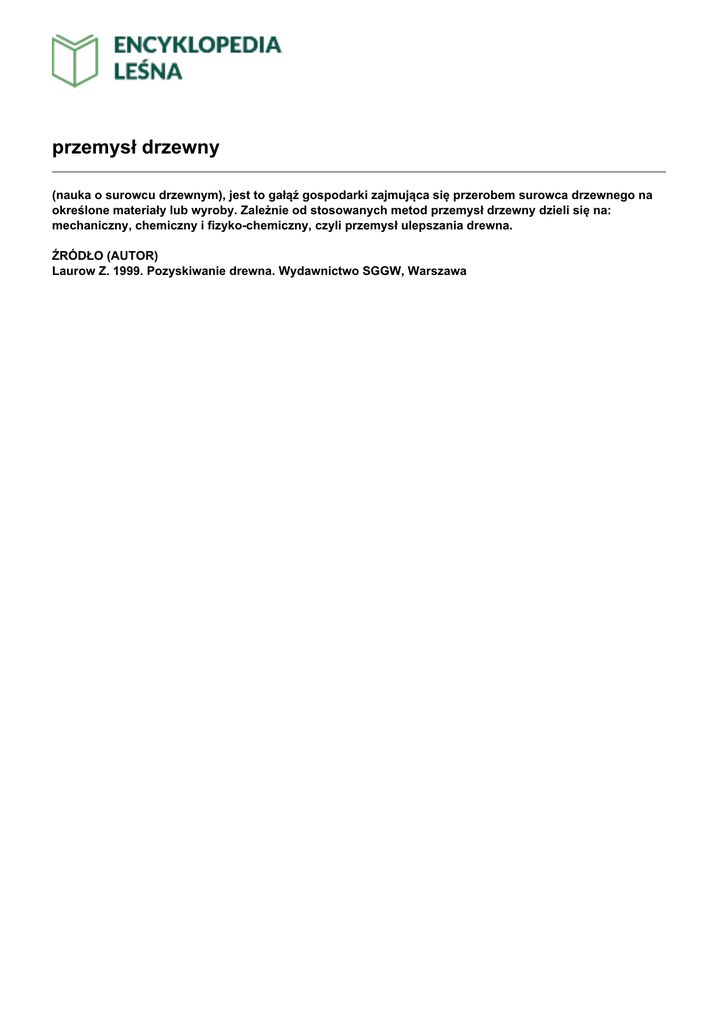 przemysł drzewny (nauka o surowcu drzewnym), jest to gałąź gospodarki zajmująca się przerobem surowca drzewnego na określone materiały lub wyroby. Zależnie od stosowanych metod przemysł drzewny dzieli się na: mechaniczny, chemiczny i fizyko-chemiczny, czyli przemysł ulepszania drewna. ŹRÓDŁO (AUTOR) Laurow Z. 1999. Pozyskiwanie drewna. Wydawnictwo SGGW, Warszawa