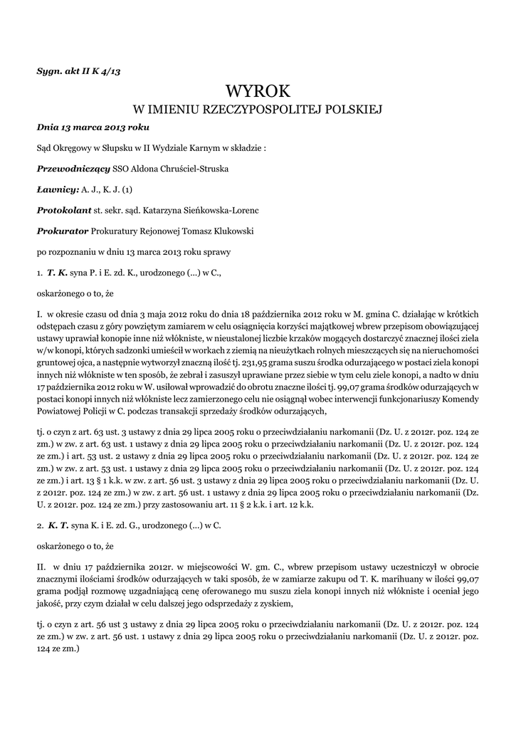 Sygn. akt II K 4/13 WYROK W IMIENIU RZECZYPOSPOLITEJ POLSKIEJ Dnia 13 marca 2013 roku Sąd Okręgowy w Słupsku w II Wydziale Karnym w składzie : Przewodniczący SSO Aldona Chruściel-Struska Ławnicy: A. J., K. J. (1) Protokolant st. sekr. sąd. Katarzyna Sieńkowska-Lorenc Prokurator Prokuratury Rejonowej Tomasz Klukowski po rozpoznaniu w dniu 13 marca 2013 roku sprawy 1. T. K. syna P. i E. zd. K., urodzonego (...) w C., oskarżonego o to, że I. w okresie czasu od dnia 3 maja 2012 roku do dnia 18 października 2012 roku w M. gmina C. działając w krótkich odstępach czasu z góry powziętym zamiarem w celu osiągnięcia korzyści majątkowej wbrew przepisom obowiązującej ustawy uprawiał konopie inne niż włókniste, w nieustalonej liczbie krzaków mogących dostarczyć znacznej ilości ziela w/w konopi, których sadzonki umieścił w workach z ziemią na nieużytkach rolnych mieszczących się na nieruchomości gruntowej ojca, a następnie wytworzył znaczną ilość tj. 231,95 grama suszu środka odurzającego w postaci ziela konopi innych niż włókniste w ten sposób, że zebrał i zasuszył uprawiane przez siebie w tym celu ziele konopi, a nadto w dniu 17 października 2012 roku w W. usiłował wprowadzić do obrotu znaczne ilości tj. 99,07 grama środków odurzających w postaci konopi innych niż włókniste lecz zamierzonego celu nie osiągnął wobec interwencji funkcjonariuszy Komendy Powiatowej Policji w C. podczas transakcji sprzedaży środków odurzających, tj. o czyn z art. 63 ust. 3 ustawy z dnia 29 lipca 2005 roku o przeciwdziałaniu narkomanii (Dz. U. z 2012r. poz. 124 ze zm.) w zw. z art. 63 ust. 1 ustawy z dnia 29 lipca 2005 roku o przeciwdziałaniu narkomanii (Dz. U. z 2012r. poz. 124 ze zm.) i art. 53 ust. 2 ustawy z dnia 29 lipca 2005 roku o przeciwdziałaniu narkomanii (Dz. U. z 2012r. poz. 124 ze zm.) w zw. z art. 53 ust. 1 ustawy z dnia 29 lipca 2005 roku o przeciwdziałaniu narkomanii (Dz. U. z 2012r. poz. 124 ze zm.) i art. 13 § 1 k.k. w zw. z art. 56 ust. 3 ustawy z dnia 29 lipca 2005 roku o przeciwdziałaniu narkomanii (Dz. U. z 2012r. poz. 124 ze zm.) w zw. z art. 56 ust. 1 ustawy z dnia 29 lipca 2005 roku o przeciwdziałaniu narkomanii (Dz. U. z 2012r. poz. 124 ze zm.) przy zastosowaniu art. 11 § 2 k.k. i art. 12 k.k. 2. K. T. syna K. i E. zd. G., urodzonego (...) w C. oskarżonego o to, że II. w dniu 17 października 2012r. w miejscowości W. gm. C., wbrew przepisom ustawy uczestniczył w obrocie znacznymi ilościami środków odurzających w taki sposób, że w zamiarze zakupu od T. K. marihuany w ilości 99,07 grama podjął rozmowę uzgadniającą cenę oferowanego mu suszu ziela konopi innych niż włókniste i oceniał jego jakość, przy czym działał w celu dalszej jego odsprzedaży z zyskiem, tj. o czyn z art. 56 ust 3 ustawy z dnia 29 lipca 2005 roku o przeciwdziałaniu narkomanii (Dz. U. z 2012r. poz. 124 ze zm.) w zw. z art. 56 ust. 1 ustawy z dnia 29 lipca 2005 roku o przeciwdziałaniu narkomanii (Dz. U. z 2012r. poz. 124 ze zm.) III. w tym samym miejscu i czasie wbrew przepisom ustawy posiadał środek odurzający w postaci suszu marihuany w ilości 6,22 g oraz substancję psychotropową w postaci amfetaminy w ilości 0,25g, tj. o czyn z art. 62 ust 1 ustawy z dnia 29 lipca 2005 roku o przeciwdziałaniu narkomanii (Dz. U. z 2012r. poz. 124 ze zm.) 3. S. C. syna M. i B. zd. K., urodzonego (...) w W. oskarżonego o to, że IV. w dniu 17 października 2012r. w miejscowości W., działając w zamiarze aby T. K. wbrew przepisom ustawy wprowadził do obrotu znaczną ilość środków odurzających w postaci 99,07 grama suszu ziela konopi innych niż włókniste, poprzez znalezienie nabywcy wymienionego środka odurzającego w osobie K. T. oraz poprzez doprowadzenie do spotkania w/w z T. K. w celu dokonania transakcji jego sprzedaży ułatwił popełnienie przestępstwa T. K., tj. o czyn z art. 18 § 3 k.k. w zw. z art. 56 ust. 3 ustawy z dnia 29 lipca 2005 roku o przeciwdziałaniu narkomanii (Dz. U. z 2012r. poz. 124 ze zm.)w zw. z art. 56 ust 1 ustawy z dnia 29 lipca 2005 roku o przeciwdziałaniu narkomanii (Dz. U. z 2012r. poz. 124 ze zm.) 1. uznaje oskarżonego T. K. za winnego popełnienia zarzucanego mu czynu, z tym ustaleniem, że dopuścił się go w okresie od 3 maja 2012 roku do 17 października 2012 roku, to jest przestępstwa z art. 63 ust. 3 ustawy z dnia 29 lipca 2005 roku o przeciwdziałaniu narkomanii w zw. z art. 63 ust. 1 ustawy z dnia 29 lipca 2005 roku o przeciwdziałaniu narkomanii i art. 53 ust. 2 ustawy z dnia 29 lipca 2005 roku o przeciwdziałaniu narkomanii w zw. z art. 53 ust. 1 ustawy z dnia 29 lipca 2005 roku o przeciwdziałaniu narkomanii i art. 13 § 1 k.k. w zw. z art. 56 ust. 3 ustawy z dnia 29 lipca 2005 roku o przeciwdziałaniu narkomanii w zw. z art. 56 ust. 1 ustawy z dnia 29 lipca 2005 roku o przeciwdziałaniu narkomanii przy zastosowaniu art. 11 § 2 k.k. i w zw. z art. 12 k.k. i za to na mocy art. 53 ust 3 ustawy z dnia 29 lipca 2005 roku o przeciwdziałaniu narkomanii przy zast. art. 11 § 3 k.k. i art. 60 § 2 pkt 2 i § 6 pkt 2 k.k. skazuje go na karę 2 (dwóch) lat i 3 (trzech) miesięcy pozbawienia wolności i 200 (dwieście) stawek dziennych grzywny, przyjmując wysokość stawki dziennej na kwotę 40 (czterdziestu) złotych; 2. uznaje oskarżonego K. T. za winnego tego, że w dniu 17 października 2012 roku w miejscowości W., gm. C., wbrew przepisom ustawy usiłował uczestniczyć w obrocie znacznymi ilościami środków odurzających w taki sposób, że w zamiarze zakupu od T. K. marihuany w ilości 99,07 grama podjął rozmowę uzgadniającą cenę oferowanego mu suszu ziela konopi innych niż włókniste i oceniał jego jakość, przy czym działał w celu dalszej jego odsprzedaży z zyskiem, jednakże zamierzonego celu nie osiągnął z uwagi na interwencję funkcjonariuszy Komendy Powiatowej Policji w C., to jest przestępstwa z art. 13 § 1 k.k. w zw. z art. 56 ust 3 ustawy z dnia