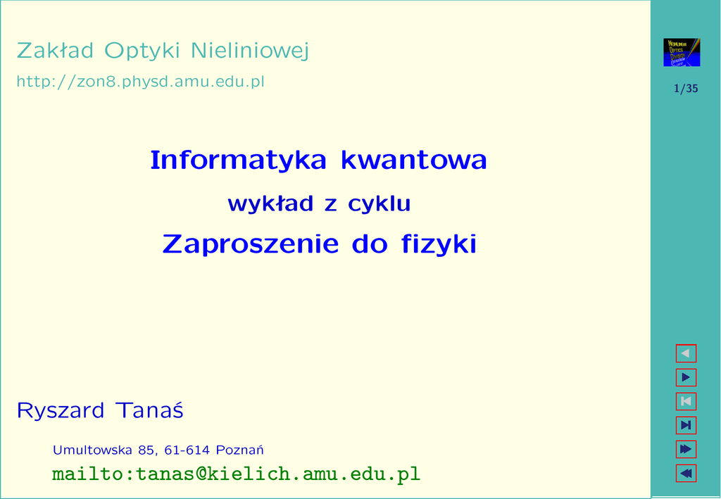 Zakład Optyki Nieliniowej http://zon8.physd.amu.edu.pl 1/35 Informatyka kwantowa wykład z cyklu Zaproszenie do fizyki Ryszard Tanaś Umultowska 85, 61-614 Poznań mailto:[email protected] Spis treści 1 Komputer kwantowy liczy już do 15! 4 2 Informacja klasyczna — bit 6 2.1 Definicja . . . . . . . . . . . . . . . . . . . . . . . . . . . . . . 6 2.2 Informacja jest wielkością fizyczną . . . . . . . . . . . . . . . 8 3 Informacja kwantowa — qubit (kubit) 9 3.1 Definicja . . . . . . . . . . . . . . . . . . . . . . . . . . . . . . 9 3.2 Kubit (spin) na sferze Blocha . . . . . . . . . . . . . . . . . . 10 4 Bramki kwantowe 4.1 4.2 2/35 16 Klasyczne bramki logiczne . . . . . . . . . . . . . . . . . . . . 16 4.1.1 jednobitowe . . . . . . . . . . . . . . . . . . . . . . . . 16 4.1.2 dwubitowe . . . . . . . . . . . . . . . . . . . . . . . . 17 Bramki kwantowe . . . . . . . . . . . . . . . . . . . . . . . . . 18 4.2.1 18 4.2.2 jednobitowe . . . . . . . . . . . . . . . . . . . . . . . . dwubitowe . . . . . . . . . . . . . . . . . . . . . . . . 22 3/35 5 Algorytm Shora 26 5.1 Motywacja . . . . . . . . . . . . . . . . . . . . . . . . . . . . . 27 5.2 Algorytm RSA . . . . . . . . . . . . . . . . . . . . . . . . . . . 28 5.3 Kwantowa faktoryzacja . . . . . . . . . . . . . . . . . . . . . . 31 6 Kryptografia kwantowa 33 7 Zaproszenie do fizyki 34 Komputer kwantowy liczy już do 15! 4/35 Rysunek 1: Wiedza i Życie, maj 2002 5/35 Rysunek 2: Isaac L. Chuang i jego procesor kwantowy Informacja klasyczna — bit 6/35 Definicja Niech A będzie zdarzeniem losowym, które występuje z prawdopodobieństwem P (A). Jeśli dowiadujemy się, że takie zdarzenie nastąpiło, to uzyskujemy I(A) = log 1 P (A) jednostek informacji. Jeśli logarytm jest przy podstawie 2, to jednostka informacji nazywa się bit. Zauważmy, że dla P (A) = 1 2, I(A) = 1. Informacja klasyczna — bit 6/35 Definicja Niech A będzie zdarzeniem losowym, które występuje z prawdopodobieństwem P (A). Jeśli dowiadujemy się, że takie zdarzenie nastąpiło, to uzyskujemy I(A) = log 1 P (A) jednostek informacji. Jeśli logarytm jest przy podstawie 2, to jednostka informacji nazywa się bit. Zauważmy, że dla P (A) = 1 2, I(A) = 1. Jeden bit to ilość informacji jaką uzyskujemy kiedy zachodzi jedna z dwóch alternatywnych możliwości, np. kiedy poznajemy wynik rzutu monetą. Informacja klasyczna — bit 6/35 Definicja Niech A będzie zdarzeniem losowym, które występuje z prawdopodobieństwem P (A). Jeśli dowiadujemy się, że takie zdarzenie nastąpiło, to uzyskujemy I(A) = log 1 P (A) jednostek informacji. Jeśli logarytm jest przy podstawie 2, to jednostka informacji nazywa się bit. Zauważmy, że dla P (A) = 1 2, I(A) = 1. Jeden bit to ilość informacji jaką uzyskujemy kiedy zachodzi jedna z dwóch alternatywnych możliwości, np. kiedy poznajemy wynik rzutu monetą. Przy rzucie kostką do gry P (A) = I(A) = log2 6 ≈ 2.58 bitów. 1 6 i poznanie wyniku daje Niech {A1 , A2 , . . . , An } będą zdarzeniami niezależnymi występującymi z prawdopodobieństwami {P (A1 ), P (A2 ), . . . , P (An )}, wtedy 7/35 Niech {A1 , A2 , . . . , An } będą zdarzeniami niezależnymi występującymi z prawdopodobieństwami {P (A1 ), P (A2 ), . . . , P (An )}, wtedy 7/35 H = X i X 1 P (Ai ) log =− P (Ai ) log P (Ai ) P (Ai ) i określa średnią informację (entropię) takiego źródła informacji. Niech {A1 , A2 , . . . , An } będą zdarzeniami niezależnymi występującymi z prawdopodobieństwami {P (A1 ), P (A2 ), . . . , P (An )}, wtedy 7/35 H = X i X 1 P (Ai ) log =− P (Ai ) log P (Ai ) P (Ai ) i określa średnią informację (entropię) takiego źródła informacji. Weźmy np. Zdarzenie Prawdopodobieństwo A1 A2 A3 1 2 1 3 1 6 Niech {A1 , A2 , . . . , An } będą zdarzeniami niezależnymi występującymi z prawdopodobieństwami {P (A1 ), P (A2 ), . . . , P (An )}, wtedy 7/35 H = X i X 1 P (Ai ) log =− P (Ai ) log P (Ai ) P (Ai ) i określa średnią informację (entropię) takiego źródła informacji. Weźmy np. Zdarzenie Prawdopodobieństwo A1 A2 A3 1 2 1 3 1 6 wtedy H = − 1 1 1 1 1 1 log − log − log ≈ 1.46 2 2 3 3 6 6 Informacja jest wielkością fizyczną Zasada Landauera Wymazanie jednego bitu informacji w otoczeniu o temperaturze T wymaga 8/35 straty energii (wydzielenia ciepła) o wartości co najmniej kT ln 2 Informacja jest wielkością fizyczną Zasada Landauera Wymazanie jednego bitu informacji w otoczeniu o temperaturze T wymaga 8/35 straty energii (wydzielenia ciepła) o wartości co najmniej kT ln 2 Komputer jest układem fizycznym Jeden bit informacji jest reprezentowany, w układach fizycznych z których zbudowane są obecne komputery, przez około 1010 atomów! Informacja jest wielkością fizyczną Zasada Landauera Wymazanie jednego bitu informacji w otoczeniu o temperaturze T wymaga 8/35 straty energii (wydzielenia ciepła) o wartości co najmniej kT ln 2 Komputer jest układem fizycznym Jeden bit informacji jest reprezentowany, w układach fizycznych z których zbudowane są obecne komputery, przez około 1010 atomów! Jeśli obecny trend w miniaturyzacji układów scalonych się utrzyma, to około roku 2020 jeden bit będzie reprezentowany przez jeden atom! Informacja jest wielkością fizyczną Zasada Landauera Wymazanie jednego bitu informacji w otoczeniu o temperaturze T wymaga 8/35 straty energii (wydzielenia ciepła) o wartości co najmniej kT ln 2 Komputer jest układem fizycznym Jeden bit informacji jest reprezentowany, w układach fizycznych z których zbudowane są obecne komputery, przez około 1010 atomów! Jeśli obecny trend w miniaturyzacji układów scalonych się utrzyma, to około roku 2020 jeden bit będzie reprezentowany przez jeden atom! Fizyka w skali pojedynczego atomu to fizyka kwantowa — rządzą tu prawa mechaniki kwantowej. Informacja kwantowa — qubit (kubit) 9/35 Definicja Kwantowym odpowiednikiem klasycznego bitu jest dowolny układ dwustanowy: dwa poziomy atomu, s