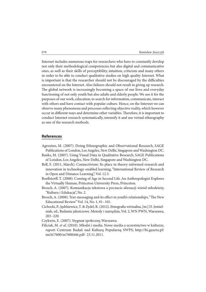 214 Stanisław Juszczyk Internet includes numerous traps for researchers who have to constantly develop not only their methodological competencies but also digital and communicative ones, as well as their skills of perceptibility, intuition, criticism and many others in order to be able to conduct qualitative studies on high quality Internet. What is important is that the researcher should not be discouraged by the difficulties encountered on the Internet. Also failures should not result in giving up research. The global network is increasingly becoming a space of our lives and everyday functioning of not only youth but also adults and elderly people. We use it for the purposes of our work, education, to search for information, communicate, interact with others and have contact with popular culture. Hence, on the Internet we can observe many phenomena and processes reflecting objective reality, which however occur in different ways and determine other variables. Therefore, it is important to conduct Internet research systematically, intensify it and use virtual ethnography as one of the research methods. References Agrosino, M. (2007). Doing Ethnographic and Observational Research, SAGE Publications of London, Los Angeles, New Delhi, Singapore and Washington DC. Banks, M. (2007). Using Visual Data in Qualitative Research, SAGE Publications of London, Los Angeles, New Delhi, Singapore and Washington DC. Bell, F. (2011, March). Connectivism: Its place in theory-informed research and innovation in technology-enabled learning, “International Review of Research in Open and Distance Learning”, Vol. 12.3. Boellstorff, T. (2008). Coming of Age in Second Life. An Anthropologist Explores the Virtually Human, Princeton University Press, Princeton. Brosch, A. (2007). Komunikacja tekstowa a poczucie alienacji wśród młodzieży, “Kultura i Edukacja”, No. 2. Brosch, A. (2008). Text-messaging and its effect in youth’s relationships, “The New Educational Review” Vol. 14, No. 1, 91 – 101. Cichocki, P., Jędrkiewicz, T. & Zydel, R. (2012). Etnografia wirtualna, [in:] D. Jemielniak, ed., Badania jakościowe. Metody i narzędzia, Vol. 2, WN PWN, Warszawa, 203 – 220. Czykwin, E. (2007). Stygmat społeczny, Warszawa. Filiciak, M. et al. (2010). Młodzi i media. Nowe media a uczestnictwo w kulturze, raport Centrum Badań nad Kulturą Popularną SWPS; http://bi.gazeta.pl/ im/6/7600/m7600446.pdf- 23.11.2011. Ethnography of Virtual Phenomena and Processes on the Internet 215 Giddens, A. (2004). Socjologia, PWN, Warszawa. Goffman, E. (2005). Piętno. Rozważania o zranionej tożsamości, GWP, Gdańsk. Grzenia, J. (2006). Komunikacja językowa w Internecie, PWN, Warszawa. Huk, T. (2009). Information Technology in the process of key competence development – a description conditioning, “The New Educational Review”, Vol. 19, No. 3 – 4, 58 – 77. Huk, T. (2012). Opportunities and risks of the use of the mobile phone in the process of education, “The New Educational Rewiev”, Vol. 30, No. 4, 249 – 258. Juszczyk, S. (2003). The chosen pedagogical, psychological and sociological aspects of a distance Education, „The New Educational Review”, Vol. 1, No. 1, 159 – 178. Juszczyk, S. (2009). Wizerunki medialne i kultura medialna. Potrzeba upowszechniania alfabetyzacji medialnej, [in:] Mirosław Kisiel, Tomasz Huk (ed.), Rzeczywistość. Perswazyjność. Falsyfikacja w optyce wychowania i edukacji, Oficyna Wydawnicza, Katowice, 15 – 27. Juszczyk, S. (2009). Komunikacja dzieci i młodzieży w przestrzeni wirtualnej, “Kwartalnik Pedagogiczny”, No. 4 (214), 83 – 104 Juszczyk, S. (2010). Fascynacja młodzieży grami komputerowymi, “Edukacja i Dialog”, No. 09/10, 47 – 51. Juszczyk, S. (2011). Internet. Współczesne medium komunikacji społecznej, “Edukacja i Dialog”, No. 05 – 06, 42 – 46, Juszczyk, S. (2012). Internet i sieciowe gry komputerowe w semiotycznym wymiarze interakcji społecznych, [in:] Bronisław Siemieniecki (ed.), Cyberprzestrzeń i edukacja, Wydawnictwo Adam Marszałek, Toruń, 87 – 116. Juszczyk, S. (2013a). Media społeczne w procesie komunikacji i edukacji – dialog i konektywizm, [in:] M. Wawrzaka-Chodaczek, J. Kowal, H. Żeligowski, ed., Społeczne i kulturowe wymiary komunikacji, Wydawnictwo Wyższej Szkoły Zarządzania “Edukacja”, Wrocław, 9 – 22. Juszczyk, S. (2013b). Media społeczne wsparciem dla funkcjonowania osób z niepełnosprawnością w społeczeństwie ponowoczesnym, [in:] H. Orieščiková, M. Kowalska-Kantyka, A. Lewko, ed., Tradycja i nowoczesność – funkcjonowanie osób z niepełnosprawnością we współczesnym świecie, seria wydawnicza “Specjalne potrzeby edukacyjne”, ed. of the series A. Stankowski, VERBUM, Ružomberok, 285 – 298. Kozinets, R.V. (2012). Netnografia. Badania etnograficzne on-line, translated by Maja Brzozowska-Brywczyńska, WN PWN, Warszawa. Manovich, L. (2006). Język nowych mediów, WAiP, Warszawa. 216 Stanisław Juszczyk McMillan, S., & Morrison, M. (2000). Coming of Age with the Internet. A Qualitative Exploration of How the Internet Has Become an Integral Part of Young People’s, “New Media and Society” Vol. 8, No. 1, 3 – 95. Miczka, T. (2002). O zmianie zachowań komunikacyjnych. Konsumenci w nowych sytuacjach audiowizualnych, Katowice. Miller, D. (2011). Tales from Facebook, Polity Press, Cambridge. Miller, D., & Slater D. (2000). The Internet. An Ethnographic Approach, Berg, Oxford. Olcoń-Kubicka, M. (2006). Uspołecznienie macierzyństwa przez dyskurs w przestrzeni internetowej, [in:] D. Batorski, M. Marody, A. Nowak, ed., Społeczna przestrzeń Internetu, Academica, Warszawa, 267 – 282. Siemens, G. (2005). Connectivism: A learning theory for a digital age, “International Journal of Instructional Technology and Distance Learning”, No. 2(1), 3 – 10. Sitarski, P. (2001). Czas rzeczywisty, nierzeczywista rozmowa. Komunikacja językowa w Internecie a nowa tożsamość użytk