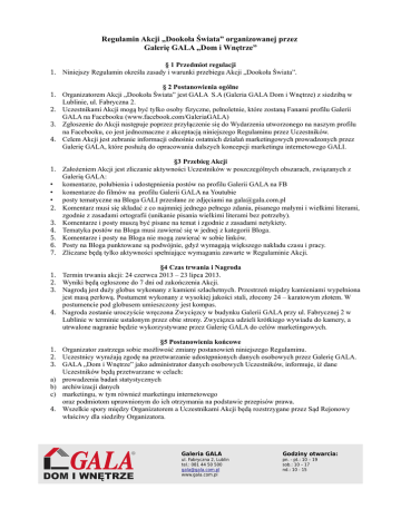Regulamin Akcji „Dookoła Świata” organizowanej przez Galerię GALA „Dom i Wnętrze” § 1 Przedmiot regulacji 1. Niniejszy Regulamin określa zasady i warunki przebiegu Akcji „Dookoła Świata”. § 2 Postanowienia ogólne 1. Organizatorem Akcji „Dookoła Świata” jest GALA S.A (Galeria GALA Dom i Wnętrze) z siedzibą w Lublinie, ul. Fabryczna 2. 2. Uczestnikami Akcji mogą być tylko osoby fizyczne, pełnoletnie, które zostaną Fanami profilu Galerii GALA na Facebooku (www.facebook.com/GaleriaGALA) 3. Zgłoszenie do Akcji następuje poprzez przyłączenie się do Wydarzenia utworzonego na naszym profilu na Facebooku, co jest jednoznaczne z akceptacją niniejszego Regulaminu przez Uczestników. 4. Celem Akcji jest zebranie informacji odnośnie ostatnich działań marketingowych prowadzonych przez Galerię GALA, które posłużą do opracowania dalszych koncepcji marketingu internetowego GALI. §3 Przebieg Akcji 1. Założeniem Akcji jest zliczanie aktywności Uczestników w poszczególnych obszarach, związanych z • • • 2. 3. 4. 5. 6. 7. Galerią GALA: komentarze, polubienia i udostępnienia postów na profilu Galerii GALA na FB komentarze do filmów na profilu Galerii GALA na Youtubie posty tematyczne na Bloga GALI przesłane ze zdjęciami na [email protected] Komentarz musi się składać z co najmniej jednego pełnego zdania, pisanego małymi i wielkimi literami, zgodnie z zasadami ortografii (unikanie pisania wielkimi literami bez potrzeby). Komentarze i posty muszą być pisane na temat i zgodnie z zasadami netykiety. Tematyka postów na Bloga musi zawierać się w jednej z kategorii Bloga. Komentarze i posty na Bloga nie mogą zawierać w sobie linków. Posty na Bloga punktowane są podwójnie, gdyż wymagają większego nakładu czasu i pracy. Zliczane będą tylko aktywności spełniające wymagania zawarte w Regulaminie Akcji. §4 Czas trwania i Nagroda 1. Termin trwania akcji: 24 czerwca 2013 – 23 lipca 2013. 2. Wyniki będą ogłoszone do 7 dni od zakończenia Akcji. 3. Nagrodą jest duży globus wykonany z kamieni szlachetnych. Przestrzeń między kamieniami wypełniona jest masą perłową. Postument wykonany z wysokiej jakości stali, złocony 24 – karatowym złotem. W postumencie pod globusem umieszczony jest kompas. 4. Nagroda zostanie uroczyście wręczona Zwycięzcy w budynku Galerii GALA przy ul. Fabrycznej 2 w Lublinie w terminie ustalonym przez obie strony. Zwycięzca udzieli krótkiego wywiadu do kamery, a utrwalone nagranie będzie wykorzystywane przez Galerię GALA do celów marketingowych. §5 Postanowienia końcowe 1. Organizator zastrzega sobie możliwość zmiany postanowień niniejszego Regulaminu. 2. Uczestnicy wyrażają zgodę na przetwarzanie udostępnionych danych osobowych przez Galerię GALA. 3. GALA „Dom i Wnętrze” jako administrator danych osobowych Uczestników, informuje, iż dane Uczestników będą przetwarzane w celach: a) prowadzenia badań statystycznych b) archiwizacji danych c) marketingu, w tym również marketingu internetowego oraz podmiotom uprawnionym do ich otrzymania na podstawie przepisów prawa. 4. Wszelkie spory między Organizatorem a Uczestnikami Akcji będą rozstrzygane przez Sąd Rejonowy właściwy dla siedziby Organizatora. Galeria GALA ul. Fabryczna 2, Lublin tel.: 081 44 50 500 [email protected] www.gala.com.pl Godziny otwarcia: pn. - pt.: 10 – 19 sob.: 10 – 17 nd.: 10 - 15