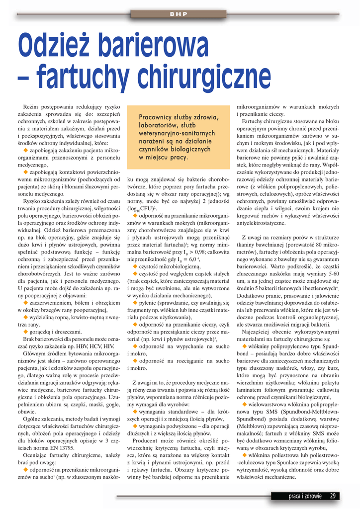 BHP Odzie˝ barierowa – fartuchy chirurgiczne Re˝im post´powania redukujàcy ryzyko zaka˝enia sprowadza si´ do: szczepieƒ ochronnych, szkoleƒ w zakresie post´powania z materia∏em zakaênym, dzia∏aƒ przed i poekspozycyjnych, w∏aÊciwego stosowania Êrodków ochrony indywidualnej, które: u zapobiegajà zaka˝eniu pacjenta mikroorganizmami przenoszonymi z personelu medycznego, u zapobiegajà kontaktowi powierzchniowemu mikroorganizmów (pochodzàcych od pacjenta) ze skórà i b∏onami Êluzowymi personelu medycznego. Ryzyko zaka˝enia zale˝y równie˝ od czasu trwania procedury chirurgicznej, wilgotnoÊci pola operacyjnego, barierowoÊci ob∏o˝eƒ pola operacyjnego oraz Êrodków ochrony indywidualnej. Odzie˝ barierowa przeznaczona np. na blok operacyjny, gdzie znajduje si´ du˝o krwi i p∏ynów ustrojowych, powinna spe∏niaç podstawowà funkcj´ – funkcj´ ochronnà i zabezpieczaç przed przenikaniem i przesiàkaniem szkodliwych czynników chorobotwórczych. Jest to wa˝ne zarówno dla pacjenta, jak i personelu medycznego. U pacjenta mo˝e dojÊç do zaka˝enia np. rany pooperacyjnej z objawami: u zaczerwienieniem, bólem i obrz´kiem w okolicy brzegów rany pooperacyjnej, u wydzielinà ropnà, krwisto-m´tnà z wn´trza rany, u goràczkà i dreszczami. Brak barierowoÊci dla personelu mo˝e oznaczaç ryzyko zaka˝enia np. HBV, HCV, HIV. G∏ównym êród∏em bytowania mikroorganizmów jest skóra – zarówno operowanego pacjenta, jak i cz∏onków zespo∏u operacyjnego, dlatego wa˝nà rol´ w procesie przeciwdzia∏ania migracji zarazków odgrywajà: r´kawice medyczne, barierowe fartuchy chirurgiczne i ob∏o˝enia pola operacyjnego. Uzupe∏nieniem ubioru sà czepki, maski, gogle, obuwie. Ogólne zalecania, metody badaƒ i wymogi dotyczàce w∏aÊciwoÊci fartuchów chirurgicznych, ob∏o˝eƒ pola operacyjnego i odzie˝y dla bloków operacyjnych opisuje w 3 cz´Êciach norma EN 13795. Oceniajàc fartuchy chirurgiczne, nale˝y braç pod uwag´: u odpornoÊç na przenikanie mikroorganizmów na sucho1 (np. w z∏uszczonym naskór- Pracownicy s∏u˝by zdrowia, laboratoriów, s∏u˝b weterynaryjno-sanitarnych nara˝eni sà na dzia∏anie czynników biologicznych w miejscu pracy. ku mogà znajdowaç si´ bakterie chorobotwórcze, które poprzez pory fartucha przedostanà si´ w obszar rany operacyjnej); wg normy, mo˝e byç co najwy˝ej 2 jednostki (log10CFU)2,, u odpornoÊç na przenikanie mikroorganizmów w warunkach mokrych (mikroorganizmy chorobotwórcze znajdujàce si´ w krwi i p∏ynach ustrojowych mogà przeniknàç przez materia∏ fartucha)3; wg normy minimalna barierowoÊç przy IB > 0,98; ca∏kowita nieprzenikalnoÊç gdy IB = 6,0 4, u czystoÊç mikrobiologicznà, u czystoÊç pod wzgl´dem czàstek sta∏ych (brak czàstek, które zanieczyszczajà materia∏ i mogà byç uwolnione, ale nie wytworzone w wyniku dzia∏ania mechanicznego), u pylenie (sprawdzanie, czy uwalniajà si´ fragmenty np. w∏ókien lub inne czàstki materia∏u podczas u˝ytkowania), u odpornoÊç na przenikanie cieczy, czyli odpornoÊç na przesiàkanie cieczy przez materia∏ (np. krwi i p∏ynów ustrojowych)5, u odpornoÊç na wypychanie na sucho i mokro, u odpornoÊç na rozciàganie na sucho i mokro. Z uwagi na to, ˝e procedury medyczne majà ró˝ny czas trwania i pojawia si´ ró˝nà iloÊç p∏ynów, wspomniana norma ró˝nicuje poziomy wymagaƒ dla wyrobów: u wymagania standardowe – dla krótszych operacji i z mniejszà iloÊcià p∏ynów, u wymagania podwy˝szone – dla operacji d∏u˝szych i z wi´kszà iloÊcià p∏ynów. Producent mo˝e równie˝ okreÊliç powierzchni´ krytycznà fartucha, czyli miejsca, które sà nara˝one na wi´kszy kontakt z krwià i p∏ynami ustrojowymi, np. przód i r´kawy fartucha. Obszary krytyczne powinny byç bardziej odporne na przenikanie mikroorganizmów w warunkach mokrych i przenikanie cieczy. Fartuchy chirurgiczne stosowane na bloku operacyjnym powinny chroniç przed przenikaniem mikroorganizmów zarówno w suchym i mokrym Êrodowisku, jak i pod wp∏ywem dzia∏ania si∏ mechanicznych. Materia∏y barierowe nie powinny pyliç i uwalniaç czàstek, które mog∏yby wniknàç do rany. Wspó∏czeÊnie wykorzystywane do produkcji jednorazowej odzie˝y ochronnej materia∏y barierowe (z w∏ókien polipropylenowych, poliestrowych, celulozowych), oprócz w∏aÊciwoÊci ochronnych, powinny umo˝liwiaç odprowadzanie ciep∏a i wilgoci, swoim krojem nie kr´powaç ruchów i wykazywaç w∏aÊciwoÊci antyelektrostatyczne. Z uwagi na rozmiary porów w strukturze tkaniny bawe∏nianej (porowatoÊç 80 mikrometrów), fartuchy i ob∏o˝enia pola operacyjnego wykonane z bawe∏ny nie sà gwarantem barierowoÊci. Warto podkreÊliç, ˝e czàstki z∏uszczanego naskórka majà wymiary 5-60 um, a na jednej czàstce mo˝e znajdowaç si´ Êrednio 5 bakterii tlenowych i beztlenowych6. Dodatkowo pranie, prasowanie i ja∏owienie odzie˝y bawe∏nianej doprowadza do os∏abienia lub przerwania w∏ókien, które nie jest widoczne podczas kontroli organoleptycznej, ale stwarza mo˝liwoÊci migracji bakterii. Najcz´Êciej obecnie wykorzystywanymi materia∏ami na fartuchy chirurgiczne sà: u w∏ókniny polipropylenowe typu Spundbond – posiadajà bardzo dobre w∏aÊciwoÊci barierowe dla zanieczyszczeƒ mechanicznych typu z∏uszczony naskórek, w∏osy, czy kurz, które mogà byç przynoszone na ubraniu wierzchnim u˝ytkownika; w∏óknina pokryta laminatem foliowym gwarantuje ca∏kowità ochron´ przed czynnikami biologicznymi, u wielowarstwowa w∏óknina polipropylenowa typu SMS (Spundbond-MeltblownSpundbond) posiada dodatkowà warstw´ (Meltblown) zapewniajàcà czasowà nieprzemakalnoÊç; fartuch z w∏ókniny SMS mo˝e byç dodatkowo wzmacniany w∏ókninà foliowanà w obszarach krytycznych wyrobu, u w∏óknina poliestrowa lub poliestrowo-celulozowa typu Spunlace zapewnia wysokà wytrzyma∏oÊç, wysokà ch∏