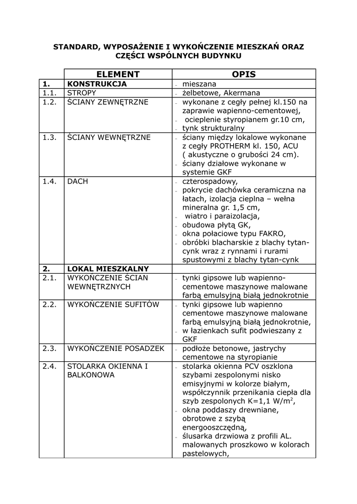 STANDARD, WYPOSAŻENIE I WYKOŃCZENIE MIESZKAŃ ORAZ CZĘŚCI WSPÓLNYCH BUDYNKU ELEMENT 1. 1.1. 1.2. KONSTRUKCJA STROPY ŚCIANY ZEWNĘTRZNE OPIS – – – – – 1.3. ŚCIANY WEWNĘTRZNE – – 1.4. DACH – – – – – – 2. 2.1. LOKAL MIESZKALNY WYKOŃCZENIE ŚCIAN WEWNĘTRZNYCH – 2.2. WYKOŃCZENIE SUFITÓW – – 2.3. WYKOŃCZENIE POSADZEK 2.4. STOLARKA OKIENNA I BALKONOWA – – – – mieszana żelbetowe, Akermana wykonane z cegły pełnej kl.150 na zaprawie wapienno-cementowej, ocieplenie styropianem gr.10 cm, tynk strukturalny ściany między lokalowe wykonane z cegły PROTHERM kl. 150, ACU ( akustyczne o grubości 24 cm). ściany działowe wykonane w systemie GKF czterospadowy, pokrycie dachówka ceramiczna na łatach, izolacja cieplna – wełna mineralna gr. 1,5 cm, wiatro i paraizolacja, obudowa płytą GK, okna połaciowe typu FAKRO, obróbki blacharskie z blachy tytancynk wraz z rynnami i rurami spustowymi z blachy tytan-cynk tynki gipsowe lub wapiennocementowe maszynowe malowane farbą emulsyjną białą jednokrotnie tynki gipsowe lub wapienno cementowe maszynowe malowane farbą emulsyjną białą jednokrotnie, w łazienkach sufit podwieszany z GKF podłoże betonowe, jastrychy cementowe na styropianie stolarka okienna PCV oszklona szybami zespolonymi nisko emisyjnymi w kolorze białym, współczynnik przenikania ciepła dla szyb zespolonych K=1,1 W/m2, okna poddaszy drewniane, obrotowe z szybą energooszczędną, ślusarka drzwiowa z profili AL. malowanych proszkowo w kolorach pastelowych, 2.5. PARAPETY – – 2.6. DRZWI WEJŚCIOWE DO MIESZKANIA – – 2.7. INSTALACJA WOD-KAN – – – – 2.8. INSTALACJE CO – – – – 2.9. INSTALACJA ELEKTRYCZNA – – – 2.10 . INSTALACJA TV – – 2.11 . 2.12 . 2.17 . 3.0. INSTALACJA TELEFONICZNA INSTALACJA DOMOFONOWA WENTYLACJA – – – – BALKON – – – 4.0. KLATKA SCHODOWA, KORYTARZE – – wewnętrzne PCV zewnętrzne blacha tytan cynk lub kamienna drzwi wejściowe do lokali mieszkalnych antywłamaniowe bez drzwi wewnątrz lokalowych otwory drzwiowe obrobione. przyłącza wody ciepłej i zimnej, odpływ kanalizacji dla pralki w łazience, przyłącze wody zimnej do zmywarki w kuchni, liczniki indywidualne piony i poziomy montowane pod stropem wykonany z rur stalowych odcinki łączące piony z grzejnikami z rur PEX, grzejniki płytowe wraz zaworami termoregulacyjnymi liczniki indywidualne instalacja wykonana przewodami YKY, YDY, LY obwody oświetlenia i gniazd wtyczkowych z osprzętem końcowym, prowadzone w rurkach giętkich WTG13, WTG16 w ściankach działowych GK lub bezpośrednio pod tynkiem, kuchnia: zasilanie elektryczne w postaci puszki rozgałęźnej typu P-5 kompletna instalacja kablowa do odbioru kanałów naziemnych gniazdo RTV instalacja telefoniczna zakończona puszką przyłączeniową instalacja domofonowa kompletna w mieszkaniach grawitacyjna, w garażach mechaniczna, wykonanie konstrukcji żelbetowej balustrady stalowe malowane proszkowo posadzki cementowe biegi i podesty z betonu zbrojonego posadzki i okładziny schodów z płytek typu GREPS kl. IV ścieralność w kolorach pastelowych – – – – – – – – 5.0. 5.1. GARAŻ PODZIEMNY WJAZD – – – 6.0. DOJŚCIA DO BUDYNKU – – malowanie tynków farbami akrylowymi w kolorach białym i pastelowym, lamperie w postaci „mokrych tapet” do wys. 1,2 m balustrady stalowe malowane proszkowo z pochwytem drewnianym, główne drzwi wejściowe do klatek schodowych: aluminiowe, przeszklone do mieszkań zainstalowane dzwonki na całości klatki schodowej oprawy oświetleniowe drzwi z przedsionka do garażu przeciwpożarowe na każdym piętrze indywidualne liczniki zużycia mediów: energii elektrycznej, cieplnej i wody brama uchylna ocieplona kostka brukowa wzdłuż bram garażowych odwodnienia liniowe kostka brukowa murki oporowe wykonane z elementów prefabrykowanych