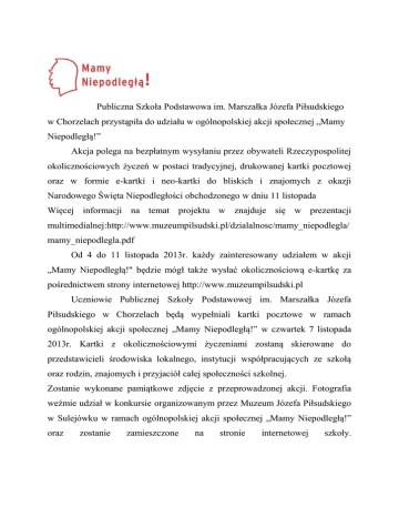 Publiczna Szkoła Podstawowa im. Marszałka Józefa Piłsudskiego w Chorzelach przystąpiła do udziału w ogólnopolskiej akcji społecznej „Mamy Niepodległą!” Akcja polega na bezpłatnym wysyłaniu przez obywateli Rzeczypospolitej okolicznościowych życzeń w postaci tradycyjnej, drukowanej kartki pocztowej oraz w formie e-kartki i neo-kartki do bliskich i znajomych z okazji Narodowego Święta Niepodległości obchodzonego w dniu 11 listopada Więcej informacji na temat projektu w znajduje się w prezentacji multimedialnej:http://www.muzeumpilsudski.pl/dzialalnosc/mamy_niepodlegla/ mamy_niepodlegla.pdf Od 4 do 11 listopada 2013r. każdy zainteresowany udziałem w akcji „Mamy Niepodległą!" będzie mógł także wysłać okolicznościową e-kartkę za pośrednictwem strony internetowej http://www.muzeumpilsudski.pl Uczniowie Publicznej Szkoły Podstawowej im. Marszałka Józefa Piłsudskiego w Chorzelach będą wypełniali kartki pocztowe w ramach ogólnopolskiej akcji społecznej „Mamy Niepodległą!” w czwartek 7 listopada 2013r. Kartki z okolicznościowymi życzeniami zostaną skierowane do przedstawicieli środowiska lokalnego, instytucji współpracujących ze szkołą oraz rodzin, znajomych i przyjaciół całej społeczności szkolnej. Zostanie wykonane pamiątkowe zdjęcie z przeprowadzonej akcji. Fotografia weźmie udział w konkursie organizowanym przez Muzeum Józefa Piłsudskiego w Sulejówku w ramach ogólnopolskiej akcji społecznej „Mamy Niepodległą!” oraz zostanie zamieszczone na stronie internetowej szkoły.