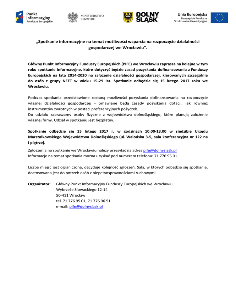 „Spotkanie informacyjne na temat możliwości wsparcia na rozpoczęcie działalności gospodarczej we Wrocławiu”. Główny Punkt Informacyjny Funduszy Europejskich (PIFE) we Wrocławiu zaprasza na kolejne w tym roku spotkanie informacyjne, które dotyczyć będzie zasad pozyskania dofinansowania z Funduszy Europejskich na lata 2014-2020 na założenie działalności gospodarczej, kierowanych szczególnie do osób z grupy NEET w wieku 15-29 lat. Spotkanie odbędzie się 15 lutego 2017 roku we Wrocławiu. Podczas spotkania przedstawione zostaną możliwości pozyskania dofinansowania na rozpoczęcie własnej działalności gospodarczej - omawiane będą zasady pozyskania dotacji, jak również instrumentów zwrotnych w postaci preferencyjnych pożyczek. Do udziału zapraszamy osoby fizyczne z województwa dolnośląskiego, które planują założenie własnej firmy. Udział w spotkaniu jest bezpłatny. Spotkanie odbędzie się 15 lutego 2017 r. w godzinach 10.00-13.00 w siedzibie Urzędu Marszałkowskiego Województwa Dolnośląskiego (ul. Walońska 3-5, sala konferencyjna nr 122 na I piętrze). Zgłoszenia na spotkanie we Wrocławiu należy przesyłać na adres [email protected] Informacje na temat spotkania można uzyskać pod numerem telefonu: 71 776 95 01. Liczba miejsc jest ograniczona, decyduje kolejność zgłoszeń. Sala, w których odbędzie się spotkanie, dostosowana jest do potrzeb osób z niepełnosprawnościami ruchowymi. Organizator: Główny Punkt Informacyjny Funduszy Europejskich we Wrocławiu Wybrzeże Słowackiego 12-14 50-411 Wrocław tel. 71 776 95 01, 71 776 96 51 e-mail: [email protected]