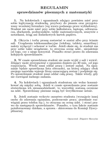 REGULAMIN sprawdzianów pisemnych z matematyki 1. Na kolokwiach i egzaminach zdajacy ¾ powinien mieć przy sobie legitymacj¾ e studencka,¾ przybory do pisania oraz przygotowany wcześniej formularz (wg wzoru podanego przez wyk÷ adowc¾ e). Student nie moz·e mieć przy sobie kalkulatora, laptopa, odtwarzacza, s÷ uchawek, podr¾ eczników, tablic matematycznych, zeszytów z notatkami, ściag ¾ ani dodatkowych kartek papieru. 2. Okrycia i torby prosz¾ e zostawiać w szatni albo przy ścianie sali. Urzadzenia ¾ telekomunikacyjne (telefony, tablety, smartfony) nalez·y wy÷ aczyć ¾ i schować w torbie. Jez·eli okaz·e si¾ e, z·e student ma przy sobie takie urzadzenie, ¾ to otrzyma ocen¾ e ndst., niezalez·nie od tego, czy z niego korzysta÷ . Ponadto straci prawo do zdawania kolejnych sprawdzianów. 3. W czasie sprawdzianu student nie moz·e wyjść z sali i wrócić. Zdajacy ¾ moz·e zrezygnować z egzaminu dopiero po 30 min. od jego rozpocz¾ ecia. Wtedy musi oddać prac¾ e i zestaw zadań. Na egzaminie bedzie ¾ sprawdzona lista obecności, na której zdajacy ¾ obok swojego nazwiska wpisuje liter¾ e oznaczajac ¾ a¾zestaw i podpisuje si¾ e. Po sprawdzianie student musi oddać ca÷ a¾ prac¾ e. Takz·e wtedy, gdy nie rozwiaza÷ ¾ z·adnego zadania. 4. Na kolokwiach i egzaminach studentom nie wolno komunikować sie¾ mi¾ edzy soba.¾ Jez·eli w czasie sprawdzania prac zostanie stwierdzona ich niesamodzielność, to wszystkie zostana¾ ocenione na ndst. Sprawdziany pisemne moga¾ być wery…kowane ustnie. 5. Jez·eli zostanie wykryte oszustwo studenta (wynaj¾ ecie innej osoby do zdawania egzaminu, podrzucenie pracy, przes÷ anie rozwiazań ¾ przez telefon itp.), to otrzyma on ocen¾ e ndst. i straci prawo do nast¾ epnych sprawdzianów. Ponadto, o tym fakcie zostanie poinformowany dziekan, a sprawa - skierowana do Komisji Dyscyplinarnej. Opracowa÷ : Zbigniew Skoczylas
