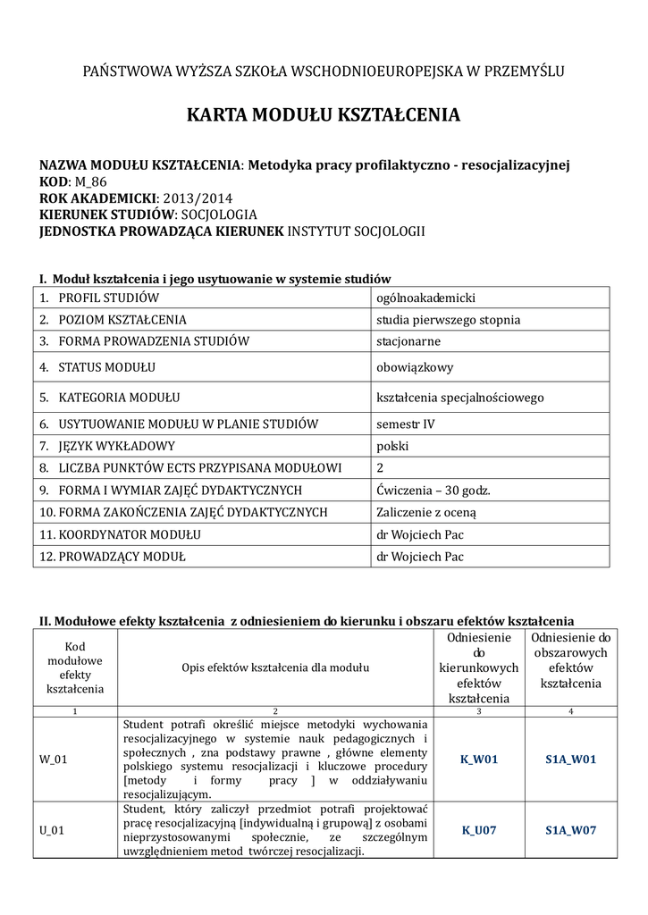 PAŃSTWOWA WYŻSZA SZKOŁA WSCHODNIOEUROPEJSKA W PRZEMYŚLU KARTA MODUŁU KSZTAŁCENIA NAZWA MODUŁU KSZTAŁCENIA: Metodyka pracy profilaktyczno - resocjalizacyjnej KOD: M_86 ROK AKADEMICKI: 2013/2014 KIERUNEK STUDIÓW: SOCJOLOGIA JEDNOSTKA PROWADZĄCA KIERUNEK INSTYTUT SOCJOLOGII I. Moduł kształcenia i jego usytuowanie w systemie studiów 1. PROFIL STUDIÓW ogólnoakademicki 2. POZIOM KSZTAŁCENIA studia pierwszego stopnia 3. FORMA PROWADZENIA STUDIÓW stacjonarne 4. STATUS MODUŁU obowiązkowy 5. KATEGORIA MODUŁU kształcenia specjalnościowego 6. USYTUOWANIE MODUŁU W PLANIE STUDIÓW semestr IV 7. JĘZYK WYKŁADOWY polski 8. LICZBA PUNKTÓW ECTS PRZYPISANA MODUŁOWI 2 9. FORMA I WYMIAR ZAJĘĆ DYDAKTYCZNYCH Ćwiczenia – 30 godz. 10. FORMA ZAKOŃCZENIA ZAJĘĆ DYDAKTYCZNYCH Zaliczenie z oceną 11. KOORDYNATOR MODUŁU dr Wojciech Pac 12. PROWADZĄCY MODUŁ dr Wojciech Pac II. Modułowe efekty kształcenia z odniesieniem do kierunku i obszaru efektów kształcenia Odniesienie Odniesienie do Kod do obszarowych modułowe Opis efektów kształcenia dla modułu kierunkowych efektów efekty efektów kształcenia kształcenia kształcenia 1 W_01 U_01 2 Student potrafi określić miejsce metodyki wychowania resocjalizacyjnego w systemie nauk pedagogicznych i społecznych , zna podstawy prawne , główne elementy polskiego systemu resocjalizacji i kluczowe procedury [metody i formy pracy ] w oddziaływaniu resocjalizującym. Student, który zaliczył przedmiot potrafi projektować pracę resocjalizacyjną [indywidualną i grupową] z osobami nieprzystosowanymi społecznie, ze szczególnym uwzględnieniem metod twórczej resocjalizacji. 3 4 K_W01 S1A_W01 K_U07 S1A_W07 K_01 Student, który zaliczył przedmiot jest wrażliwy na specyficzne potrzeby osób i środowisk objętych postępowaniem resocjalizacyjnym, jest świadomy konieczności doskonalenia metod i form pracy oraz poszukiwania optymalnych rozwiązań systemowych, potrafi pracować indywidualnie i zespołowo. K_K02 K_K04 S1A_K02 S1A_K04 III. Treści kształcenia – oddzielnie dla każdej formy zajęć dydaktycznych (W – wykład; C – ćwiczenia; K – konwersatorium; L – laboratorium; PR – projekt, PKZ – praktyka zawodowa; WT – Warsztat) Kod form zajęć dydaktyczny ch Szczegółowy opis treści realizowanych w ramach zajęć wg form zajęć dydaktycznych Liczba godzin Ćwiczenia C1 C2 C3 C4 C5 C6 C7 C8 C9 C10 C11 C12 C13 C14 C15 RAZEM Metodyka wychowania resocjalizacyjnego w systemie nauk pedagogicznych i społecznych. Przegląd historycznych i współczesnych systemów i modeli oddziaływań resocjalizacyjnych. Zasady i podstawowe zadania wychowania resocjalizacyjnego oraz kluczowe mechanizmy resocjalizacji. Zasady dotyczące strategii i procedur wychowania resocjalizującego. Charakterystyka podstawowych instytucji resocjalizacyjnych izolacyjnych i wolnościowych. Przegląd metod i form pracy wychowawczej w ramach izolacyjnych instytucji resocjalizacyjnych. Metody twórczej resocjalizacji – teatr resocjalizacyjny , drama , terapia przez sport, muzykę i plastykę. Niedostosowanie społeczne w świetle teorii socjologicznych i psychologicznych Przyczyny i objawy niedostosowania społecznego. Postępowanie z młodzieżą agresywną w placówkach resocjalizacyjnych oraz praca z rodziną dotkniętą przemocą. Znaczenie autorytetu i walorów osobowościowych pedagoga w procesie resocjalizacji. Uwarunkowania skuteczności podejmowanych działań resocjalizacyjnych. Formy resocjalizacji. Źródła zachowań negatywnych. System izolacyjno – dyscyplinarny w Polsce. Projektowanie i przeprowadzanie zajęć wychowawczych na terenie instytucji opiekuńczych , profilaktycznych i resocjalizacyjnych. 2 2 2 2 2 2 2 2 2 2 2 2 2 30 IV. Literatura podstawowa i uzupełniająca obowiązująca do zaliczenia modułu LITERATURA PODSTAWOWA: 1. Konopczyńska M .- Metody twórczej resocjalizacji, W-wa ,2006, PWN 2. Pospiszyl K. – Resocjalizacja. Teoretyczne podstawy i przykłady programów oddziaływań . W-wa ,1998, Wydawnictwo Akademickie ‘’ Żak” 3. Górski S. – Metodyka resocjalizacji, W-wa , 1985, IWZZ LITERATURA UZUPEŁNIAJĄCA: 1. Bartkiewicz Z . – Pomoc terapeutyczna nieletnim agresorom i ofiarom agresji w zakładach resocjalizacyjnych ,Lublin ,2001,AWH Antoni Dudek 2. Cekiera Cz. – Psychoprofilaktyka uzależnień oraz terapia resocjalizacja osób uzależnionych , Lublin , 1993 , KUL 3. Egan G.- Kompetentne pomaganie , Poznań , 2002 , Wydawnictwo Zysk i S-ka 4. Górecki P. , Stachowiak S . – Ustawa o postępowaniu w sprawach nieletnich . Komentarz., Zakamycze , 2002 , Kantor Wydawniczy Zakamycze Gromek K. – Kuratorzy sądowi . Komentarz do ustawy z 27 lipca 2001 . , W- wa ,2002 , Lexis Naxis Pospiszyl I . – Razem przeciw przemocy, W-wa , 1999, Wydawnictwo Akademickie „ Żak’’ Gaś Z. B. –Pomoc psychologiczna młodzieży , W-wa 1995 ,WSiP Węgliński A. –Mikrosystemy wychowawcze w resocjalizacji nieletnich. Analiza pedagogiczna , Lublin , 2000 , UMCS 9. Wysocka E. – Diagnoza w resocjalizacji , W-wa ,2008 ,PWN PUBLIKACJE / PRACE ZBIOROWE: 1. Socjoterapia –Sawicka K .( red.) , W-wa , 2007 2. Resocjalizacja – Urban B., Stanik J.M. ( red.), W-wa , 2007 3. Współczesna kuratela sądowa – Zinkiewicz B. (red.) , Mysłowice ,2006 5. 6. 7. 8.