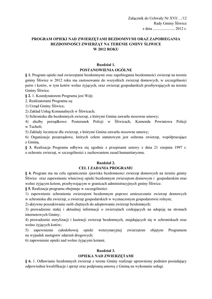 Załącznik do Uchwały Nr XVI/…/12 Rady Gminy Śliwice z dnia ...................... 2012 r. PROGRAM OPIEKI NAD ZWIERZĘTAMI BEZDOMNYMI ORAZ ZAPOBIEGANIA BEZDOMNOŚCI ZWIERZĄT NA TERENIE GMINY ŚLIWICE W 2012 ROKU Rozdział 1. POSTANOWIENIA OGÓLNE § 1. Program opieki nad zwierzętami bezdomnymi oraz zapobiegania bezdomności zwierząt na terenie gminy Śliwice w 2012 roku ma zastosowanie do wszystkich zwierząt domowych, w szczególności psów i kotów, w tym kotów wolno żyjących, oraz zwierząt gospodarskich przebywających na terenie Gminy Śliwice. § 2. 1. Koordynatorem Programu jest Wójt. 2. Realizatorami Programu są: 1) Urząd Gminy Śliwice; 2) Zakład Usług Komunalnych w Śliwicach; 3) Schroniska dla bezdomnych zwierząt, z którymi Gmina zawarła stosowne umowy; 4) służby porządkowe: Posterunek Policji w Śliwicach, Komenda Powiatowa Policji w Tucholi; 5) Zakłady lecznicze dla zwierząt, z którymi Gmina zawarła stosowne umowy; 6) Organizacje pozarządowe, których celem statutowym jest ochrona zwierząt, współpracujące z Gminą. § 3. Realizacja Programu odbywa się zgodnie z przepisami ustawy z dnia 21 sierpnia 1997 r. o ochronie zwierząt, w szczególności z zachowaniem zasad humanitaryzmu. Rozdział 2. CEL I ZADANIA PROGRAMU § 4. Program ma na celu ograniczenie zjawiska bezdomności zwierząt domowych na terenie gminy Śliwice oraz zapewnienie właściwej opieki bezdomnym zwierzętom domowym i gospodarskim oraz wolno żyjącym kotom, przebywającym w granicach administracyjnych gminy Śliwice. § 5. Realizacja programu obejmuje w szczególności: 1) zapewnienie schronienia zwierzętom bezdomnym poprzez umieszczanie zwierząt domowych w schronisku dla zwierząt, a zwierząt gospodarskich w wyznaczonym gospodarstwie rolnym; 2) aktywne poszukiwanie osób chętnych do adoptowania zwierząt bezdomnych; 3) prowadzenie stałej i aktualnej informacji o zwierzętach czekających na adopcję na stronach internetowych Gminy; 4) prowadzenie sterylizacji i kastracji zwierząt bezdomnych, znajdujących się w schroniskach oraz wolno żyjących kotów; 5) zapewnienie całodobowej opieki weterynaryjnej zwierzętom objętym Programem na wypadek następstw zdarzeń drogowych; 6) zapewnienie opieki nad wolno żyjącymi kotami. Rozdział 3. OPIEKA NAD ZWIERZĘTAMI § 6. 1. Odławianie bezdomnych zwierząt z terenu Gminy realizuje uprawniony podmiot posiadający odpowiednie kwalifikacje i sprzęt oraz podpisaną umowę z Gminą na wykonanie usługi. 2. Bezdomne odłowione zwierzęta dostarczane i przekazywane do schroniska pozostają pod opieką schroniska. § 7. Umowa zawarta z podmiotem, prowadzącym schronisko, określa skutki nienależytego wykonania wynikających z niej zobowiązań, dotyczących działalności schroniska, w tym ewentualne kary umowne. § 8. W razie stwierdzenia niezgodności działań schroniska z przepisami prawa, a zwłaszcza z ustawą organy gminy niezwłocznie zawiadamiają właściwe rzeczowo instytucje publiczne o zaobserwowanych uchybieniach. § 9. Sprawowanie opieki nad kotami wolno żyjącymi, w tym ich dokarmianie realizuje Urząd Gminy w Śliwicach poprzez: 1) zakup i wydawanie karmy społecznym opiekunom (karmicielom) kotów wolno żyjących, którzy zarejestrowani są w Urzędzie oraz wydawanie skierowania na leczenie zwierząt, w ramach zawartych umów z zakładami leczniczymi dla zwierząt; 2) podejmowanie interwencji w sprawach kotów wolno żyjących przy udziale organizacji pozarządowych. § 10. Niehumanitarnie traktowane zwierzęta gospodarskie będą odbierane właścicielom i przekazane do wskazanego gospodarstwa rolnego, z którym Gmina zawarła stosowną umowę. § 11. 1. Gospodarstwo rolne, które zapewnia miejsce dla zwierząt gospodarskich powinno spełniać wymagania dotyczące : 1) zasad przemieszczeń pomiędzy stadami; 2) odpowiednich warunków bytowania zwierząt gospodarskich, w tym minimalnych norm powierzchni określonych w obowiązujących w tym zakresie przepisach, w tym ustawie z dnia 11 marca 2004 r. o ochronie zdrowia zwierząt oraz zwalczaniu chorób zakaźnych zwierząt (Dz. U. z 2008 roku Nr 213, poz. 1342 z późn. zm.). 2. Osoba, która zapewnia miejsce dla zwierząt gospodarskich nie może być karana za naruszenie przepisów ustawy z dnia 21 sierpnia 1997 roku o ochronie zwierząt (Dz. U. z 2003r. Nr 106, poz.1002 z późn. zm.). § 12. Zapewnienie całodobowej opieki weterynaryjnej w przypadkach zdarzeń drogowych z udziałem bezdomnych zwierząt realizuje Gmina poprzez dokonanie zlecenia odpowiednim służbom weterynaryjnym dla podjęcia opieki lekarskiej nad bezdomnymi psami i kotami wolno żyjącymi z terenu gminy w celu udzielenia pomocy lekarskiej. § 13. 1. Poszukiwanie nowych właścicieli dla bezdomnych zwierząt realizują: 1) schronisko poprzez prowadzenie działań zmierzających do pozyskiwania nowych właścicieli i oddawania do adopcji bezdomne psy osobom zainteresowanym i zdolnym zapewnić im należyte warunki bytowania; 2) Gmina poprzez promocję adopcji zwierząt przyjętych z terenu Gminy do schroniska; 3) organizacje pozarządowe poprzez prowadzenie akcji adopcyjnych i promocyjnych. 2. Gmina sprawuje opiekę nad bezdomnymi zwierzętami poprzez prowadzenie działań zmierzających do pozyskania nowych właścicieli, m.in. umieszczanie ogłoszeń o możliwościach adopcji zwierząt na stronie internetowej Urzędu. Rozdział 4. OGRANICZANIE POPULACJI BEZDOMNYCH ZWIERZĄT § 14. Ograniczanie populacji bezdomnych zwierząt poprzez sterylizację i kastrację zwierząt domowych, w szczególności psów i kotów realizowane jest przez Gminę i schroniska poprzez: 1) prowadzenie akcji zachęcającej właścicieli psów i kotów do wykonywania zabiegów sterylizacji i kastracji, przy pełnej odpłatności kosztów zabiegów ponoszonych przez właścicieli; 2) obligatoryjne przeprowadzanie zabiegów sterylizacji i kastracji zwierząt przyjętych do schroniska. § 15. Usypianie ślepych miotów z