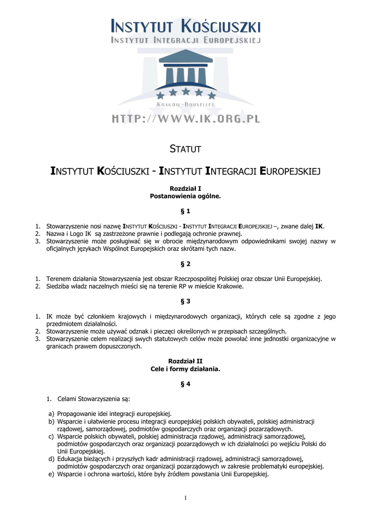 STATUT INSTYTUT KOŚCIUSZKI - INSTYTUT INTEGRACJI EUROPEJSKIEJ Rozdział I Postanowienia ogólne. §1 1. Stowarzyszenie nosi nazwę INSTYTUT KOŚCIUSZKI - INSTYTUT INTEGRACJI EUROPEJSKIEJ –, zwane dalej IK. 2. Nazwa i Logo IK są zastrzeżone prawnie i podlegają ochronie prawnej. 3. Stowarzyszenie może posługiwać się w obrocie międzynarodowym odpowiednikami swojej nazwy w oficjalnych językach Wspólnot Europejskich oraz skrótami tych nazw. §2 1. Terenem działania Stowarzyszenia jest obszar Rzeczpospolitej Polskiej oraz obszar Unii Europejskiej. 2. Siedziba władz naczelnych mieści się na terenie RP w mieście Krakowie. §3 1. IK może być członkiem krajowych i międzynarodowych organizacji, których cele są zgodne z jego przedmiotem działalności. 2. Stowarzyszenie może używać odznak i pieczęci określonych w przepisach szczególnych. 3. Stowarzyszenie celem realizacji swych statutowych celów może powołać inne jednostki organizacyjne w granicach prawem dopuszczonych. Rozdział II Cele i formy działania. §4 1. Celami Stowarzyszenia są: a) Propagowanie idei integracji europejskiej. b) Wsparcie i ułatwienie procesu integracji europejskiej polskich obywateli, polskiej administracji rządowej, samorządowej, podmiotów gospodarczych oraz organizacji pozarządowych. c) Wsparcie polskich obywateli, polskiej administracja rządowej, administracji samorządowej, podmiotów gospodarczych oraz organizacji pozarządowych w ich działalności po wejściu Polski do Unii Europejskiej. d) Edukacja bieżących i przyszłych kadr administracji rządowej, administracji samorządowej, podmiotów gospodarczych oraz organizacji pozarządowych w zakresie problematyki europejskiej. e) Wsparcie i ochrona wartości, które były źródłem powstania Unii Europejskiej. 1 2. Stowarzyszenie realizuje swoje cele poprzez: a) b) c) d) e) f) g) h) i) j) k) l) m) n) o) p) q) r) s) t) u) v) w) x) y) z) Prowadzenie badań naukowych oraz przygotowywanie analiz, ekspertyz i prognoz. Prowadzenie działalności konsultingowej i szkoleniowej. Doradztwo w wykorzystaniu programów wspólnotowych i funduszy unijnych. Przygotowanie koncepcyjne, informacyjne i kadrowe procesu integracji Polski z Unią Europejską. Organizowanie wymiany kadr, staży, stypendiów, praktyk zawodowych i naukowych w ramach Unii Europejskiej. Utworzenie przedstawicielstw IK przy instytucjach Unii Europejskiej, w szczególności w Brukseli, Strasburgu i Luksemburgu. Utworzenie w krajach Unii Europejskiej przedstawicielstw IK. Utworzenie na terenie RP punktów informacyjnych i prowadzenie ośrodków szkoleniowych. Promocję i upowszechnianie prawa obowiązującego w Unii Europejskiej. Przygotowanie koncepcyjne, informacyjne i kadrowe procesu integracji Polski z Unią Europejską. Wspieranie polskich branżowych organizacji społecznych i gospodarczych. Stworzenie międzynarodowej sieci współpracy instytucji zajmujących się problematyką europejską. Wspieranie wymiany informacji pomiędzy Instytucjami Unii Europejskiej, członkami ich kolegialnych gremiów, w szczególności tych wybranych na terenie RP, a polskimi obywatelami, polską administracją rządową, samorządową, podmiotami gospodarczymi oraz organizacjami pozarządowymi. Organizowanie konferencji, seminariów, szkoleń, warsztatów, imprez kulturalnych. Tworzenie serwisów internetowych oraz działalność wydawniczą. Wspieranie inicjatyw społecznych i gospodarczych, służących integracji i aktywizacji społeczeństw lokalnych. Wzmacnianie proeuropejskiego sektora pozarządowego w Polsce. Wspieranie działań społecznych i politycznych służących lepszym warunkom członkostwa Polski w Unii Europejskiej. Propagowanie i realizowanie wymiany kulturalnej między Polską, a krajami europejskimi, w tym organizowanie imprez kulturalnych. Reprezentowanie swoich członków wobec administracji lokalnej i władz państwowych oraz organizacji krajowych, zagranicznych i międzynarodowych. Działanie na rzecz praworządności i ochrony bezpieczeństwa. Tworzenie, utrzymywanie oraz zagospodarowywanie obiektów służących realizacji celów stowarzyszenia. Prowadzenie działalności gospodarczej. Pomoc młodzieży, studentom i absolwentom szkół wyższych w znalezieniu zatrudnienia. Tworzenie banków informacji o działaniach gospodarczych, społecznych, edukacyjnych, naukowych, kulturalnych. Prowadzenie i podejmowanie innych działań dla realizacji celów stowarzyszenia. Rozdział III Członkowie, ich prawa i obowiązki. §5 1. Członkowie dzielą się na: a) Członków zwyczajnych. b) Członków rzeczywistych. c) Członków honorowych. d) Członków wspierających. 2. Członkiem zwyczajnym może zostać obywatel RP, obywatel UE oraz inna osoba posiadający pełną zdolność do czynności prawnych i nie pozbawiona praw publicznych, której bliskie są cele działania niniejszego Stowarzyszenia, jeśli złoży pisemną deklarację członkowską, wpłaci składkę roczna i zostanie przyjęty decyzją zarządu, powziętą na wniosek czterech członków zwyczajnych lub rzeczywistych. 3. Członkami rzeczywistymi są członkowie założyciele. 4. Członkowie zwyczajni, którzy w ciągu sześciu miesięcy od uzyskania statusu członka swoim zaangażowaniem i wzorową postawą etyczną udowodnią, że bliskie im są cele Stowarzyszenia, na wniosek pisemny skierowany do Zarządu mogą jego uchwałą, podjętą zwykłą większością głosów, uzyskać status członka rzeczywistego. W przypadkach szczególnie uzasadnionych status członka rzeczywistego można uzyskać w krótszym okresie, z tym, że uchwała zarządu musi zapaść jednomyślnie. 5. Godność członka honorowego nadaje zarząd osobom szczególnie zasłużonym, które w inny szczególny sposób wniosły zasługi dla Stowarzyszenia. 2 6. Członkami wspierającymi mogą być podmioty prawne i spółki cywilne, które przekazały na rzecz Stowarzyszenia znaczącą pomoc finansową lub rzeczową. 7. Osoba prawna