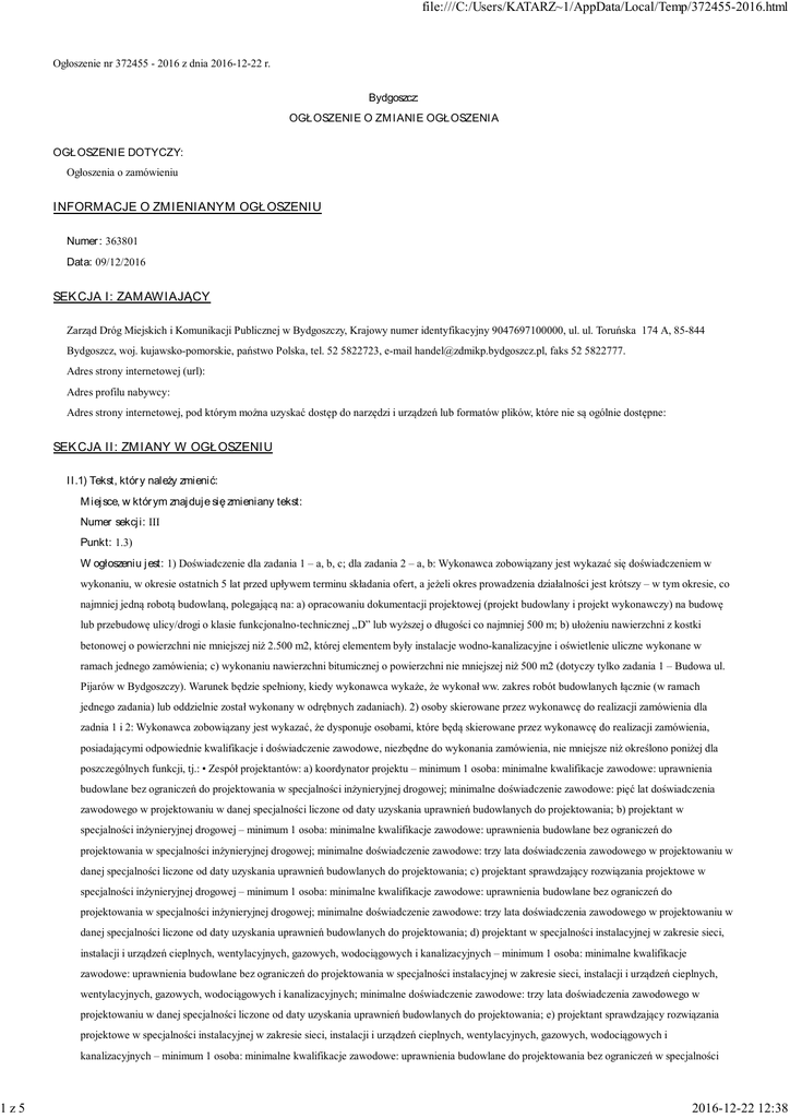 ogłoszenie 372455-2016 o zmianie ogłoszenia
