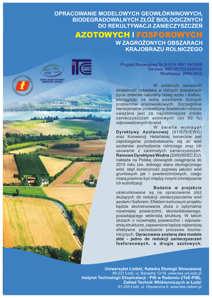 OPRACOWANIE MODELOWYCH GEOWŁÓKNINOWYCH, BIODEGRADOWALNYCH ZŁÓŻ BIOLOGICZNYCH DO REKULTYWACJI ZANIECZYSZCZEŃ AZOTOWYCH I FOSFOROWYCH W ZAGROŻONYCH OBSZARACH KRAJOBRAZU ROLNICZEGO PIB Projekt Rozwojowy Nr N R14 0061 06/2009 Umowa: 0607/R/T02/2009/06 Realizacja: 2009-2012 W ostatnich dekadach działalność człowieka w różnych dziedzinach życia zmieniła naturalny obieg azotu i fosforu, pociągając za sobą powstanie licznych problemów środowiskowych. Szczególnie nieracjonalnie prowadzona działalność rolnicza uważana jest za najistotniejsze źródło zanieczyszczeń azotowych (do 60 %) odprowadzanych do wód. W świetle wymagań Dyrektywy Azotanowej (91/676/EWG) oraz Konwencji Helsińskiej konieczne jest zapobieganie przedostawaniu się do wód azotanów pochodzenia rolniczego oraz ich usuwanie z zaistniałych zanieczyszczeń. Ramowa Dyrektywa Wodna (2000/60/EC EU) nakłada na Polskę obowiązek osiągnięcia do 2015 roku tzw. dobrego stanu ekologicznego wód, stąd konieczność poprawy jakości wód gruntowych jak i powierzchniowych, czego miarą powinno być między innymi zmniejszenie ich eutrofizacji. Badania w projekcie ukierunkowane są na opracowanie złóż służących do redukcji zanieczyszczenia wód azotem i fosforem. Efektem końcowym projektu będzie skonstruowanie złoża o optymalnie rozwiniętej powierzchni, skonsolidowanego, posiadającego włóknistą strukturę. W takich złożach o rozwiniętej powierzchni i odpowiedniej strukturze, zapewnione będzie najbardziej efektywne zachodzenie procesów biochemicznych. Opracowane zostaną dwa modele złóż - jedno do redukcji zanieczyszczeń fosforanowych, a drugie azotowych. Uniwersytet Łódzki, Katedra Ekologii Stosowanej 90-237 Łódź, ul. Banacha 12/16, www.kes.uni.lodz.pl Instytut Technologii Eksploatacji - PIB w Radomiu (ITeE-PIB), Zakład Technik Włókienniczych w Łodzi 91-335 Łódź, ul. Hipoteczna 6, www.itee.radom.pl Rekultywacja zanieczyszczeń AZOTOWYCH Cz ar no ci n a -i ns ta la cj óż zł z em rz zie źd pa ym an lni ych zanieczyszczeń azo szarow towych ji ob wac ulty rek do Złoże przeznaczone do usuwania związków azotu ma strukturę podłoża organicznego, biodegradowalnego, na którym osadzone jest samo regenerujące się złoże biologiczne przeprowadzajace w warunkach beztlenowych reakcję denitryfikacji. Po wyeksploatowaniu takie złoże, jako tkanka organiczna, łatwo degradowalna, może być zużytkowane dla ulepszania (humifikacji) gleby. Złoża (ściany) denitryfikacyjne tworzone są w postaci rowów na trasie przepływu wód gruntowych niosących wysoki ładunek azotanów. Rowy te są głębokie na ok. 1,0 - 1,5 m i szerokie na ok. 1,5 m. Ziemia wybrana z rowu zostaje przemieszana w odpowiednich proporcjach z włóknistym materiałem organicznym (węgiel wapienny, węgiel brunatny, paździerz lniany, trociny sosnowe, liście), po czym rowy te zostają zasypywane taką mieszanką. Takie przygotowanie ma na celu zwiększenie zawartości węgla organicznego w złożu, którego niedobór jest czynnikiem ograniczającym proces denitryfikacji i redukcję azotanów znajdujących się w wodzie gruntowej w warunkach naturalnych. Dodanie do gleby w złożu organicznego źródła węgla powoduje wzrost populacji bakterii denitryfikacyjnych i tym samym intensyfikację procesu denitryfikacji. Zaproponowane źródła węgla są stosunkowo łatwymi do pozyskania materiałami z odpadu oraz recyclingu. Zastosowanie złoża na przykładach z terenu województwa łódzkiego: ! rekultywacja źródeł punktowych (np. w miejscach intensywnej hodowli zwierząt). ! rekultywacja źródeł obszarowych (np. w strefach przybrzeżnych do których dochodzą pola uprawne, i w strefach intensywnej infiltracji zanieczyszczonych wód gruntowych do wód powierzchniowych). Rekultywacja zanieczyszczeń FOSFOROWYCH Trest a Rz ądow a - zło ż azC a(OH ) 2 do rekult ywacji za n ie c z yszcze ń fosfor owych Złoże do usuwania związków fosforu posiada rozwiniętą powierzchnię wewnętrzną tak, aby w jego wnętrzu, na powierzchniach włókien i otaczającej je warstwie przyściennej wody mogły intensywnie zachodzić reakcje chemiczne wiążące fosfor. Istotny dla całego procesu jest właściwy dobór - na drodze doświadczalnej - stopnia rozwłóknienia materiału, gdyż ma on wpływ z jednej strony na intensywność reakcji chemicznych zachodzących wewnątrz złoża, a z drugiej strony na czas jego eksploatacji. Im złoże jest bardziej rozdrobnione tym szybciej zachodzą w nim reakcje i jest "sprawniejsze" ale jego trwałość jest krótsza. Złoże po wyeksploatowaniu może być wykorzystane jako pełnowartościowy nawóz stanowiący doskonałe źródło fosforu i związków organicznych humifikujących glebę, tworząc w ten sposób rodzaj ,,małej recyrkulacji" wychwyconych w złożach minerałów nawozowych. Podczas przygotowania złoża jest wykonywana analiza porównawcza wiązania fosforu ze związkami wapnia i związkami metali ziem rzadkich i żelazem, z którym tworzy nierozpuszczalne, lub trudno rozpuszczalne w wodzie związki w postaci kłaczkowatej. Najczęściej do przygotowania złoża stosuje się związki metali ziem rzadkich i żelaza, które dość łatwo wiążą się z solami fosforu, a ponadto nie są drogie i łatwo dostępne na rynku. Zastosowanie złoża na przykładach z terenu województwa łódzkiego: ! ! ! rekultywacja stawów miejskich na rzece Sokołówce w Łodzi, rekultywacja terenów przybrzeżnych rzeki Pilicy, rekultywacja zbiorników zaporowych. Treść i Zdjęcia: KES UŁ, ZTW ITeE-PIB