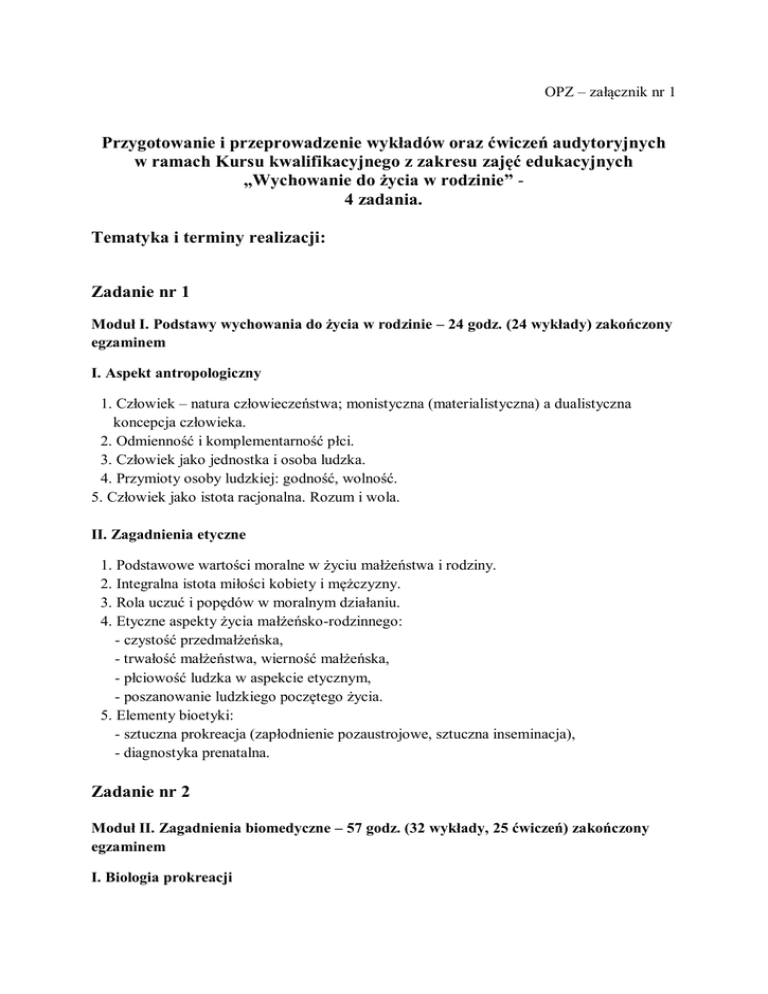 OPZ – załącznik nr 1 Przygotowanie i przeprowadzenie wykładów oraz ćwiczeń audytoryjnych w ramach Kursu kwalifikacyjnego z zakresu zajęć edukacyjnych „Wychowanie do życia w rodzinie” 4 zadania. Tematyka i terminy realizacji: Zadanie nr 1 Moduł I. Podstawy wychowania do życia w rodzinie – 24 godz. (24 wykłady) zakończony egzaminem I. Aspekt antropologiczny 1. Człowiek – natura człowieczeństwa; monistyczna (materialistyczna) a dualistyczna koncepcja człowieka. 2. Odmienność i komplementarność płci. 3. Człowiek jako jednostka i osoba ludzka. 4. Przymioty osoby ludzkiej: godność, wolność. 5. Człowiek jako istota racjonalna. Rozum i wola. II. Zagadnienia etyczne 1. Podstawowe wartości moralne w życiu małżeństwa i rodziny. 2. Integralna istota miłości kobiety i mężczyzny. 3. Rola uczuć i popędów w moralnym działaniu. 4. Etyczne aspekty życia małżeńsko-rodzinnego: - czystość przedmałżeńska, - trwałość małżeństwa, wierność małżeńska, - płciowość ludzka w aspekcie etycznym, - poszanowanie ludzkiego poczętego życia. 5. Elementy bioetyki: - sztuczna prokreacja (zapłodnienie pozaustrojowe, sztuczna inseminacja), - diagnostyka prenatalna. Zadanie nr 2 Moduł II. Zagadnienia biomedyczne – 57 godz. (32 wykłady, 25 ćwiczeń) zakończony egzaminem I. Biologia prokreacji 1. Rozwój układu płciowego męskiego i żeńskiego. 2. Wady rozwojowe układu płciowego. 3. Determinacja płci. 4. Przebieg dojrzewania dziewcząt i chłopców. 5. Regulacja neurohormonalna: oś podwzgórzowo-przysadkowo-gonadalna. 6. Zaburzenia dojrzewania płciowego. 7. Budowa układu płciowego męskiego i spermatogeneza. 8. Budowa układu płciowego żeńskiego i oogeneza. 9. Cykl miesiączkowy i jego zaburzenia. 10. Zapłodnienie. 11. Prokreacja wspomagana medycznie: wywoływanie owulacji, sztuczna inseminacja, zapłodnienie in vitro, eksperymenty dotyczące klonowania. II. Wybrane zagadnienia ginekologiczno-położnicze 1. Wybrane zagadnienia ginekologii wieku rozwojowego. 2. Przygotowanie do poczęcia: czynniki wpływające na zdrowie matki i dziecka. 3. Rozwój prenatalny dziecka. 4. Przebieg i higiena ciąży. 5. Przygotowanie do porodu; szkoły rodzenia. 6. Fizjologia porodu; poród naturalny i poród rodzinny. 7. Karmienie niemowlęcia; promocja karmienia piersią. 8. Rozwój więzi matki i ojca z dzieckiem we wczesnym okresie życia. 9. Ciąża mnoga. 10. Najczęstsze powikłania ciąży i porodu. 11. Bezpłodność: przyczyny, zapobieganie i leczenie. 12. Aborcja: istota, skutki biomedyczne i psychiczne, uwarunkowania prawne. 13. Menopauza i andropauza. III. Planowanie rodziny (prowadzi instruktor naturalnego planowania rodziny) 1. Metody rozpoznawania płodności – naturalne planowanie rodziny (NPR); rodzaje metod (termiczna, owulacji Billingsa i objawowo-termiczna). 2. Nauka metody objawowo-termicznej austriackiej 3. Antykoncepcja: metody i środki, mechanizmy działania, skuteczność, działanie uboczne i powikłania. Zadanie nr 3 Moduł III. Zagadnienia seksuologiczne - 40 godz. (25 wykładów, 7 ćwiczeń) zakończony egzaminem I. Natura ludzkiej seksualności 1. Biologiczne uwarunkowania popędu seksualnego. 2. Psychospołeczne i kulturowe uwarunkowania przejawów seksualności człowieka. 3. Rola i funkcje seksualności w życiu człowieka (budowanie więzi i prokreacja). II. Seksualność w rozwoju ontogenetycznym 1. Seksualność w kolejnych etapach życia. 2. Kształtowanie identyfikacji i tożsamości płciowej. 3. Dojrzewanie psychoseksualne dziewcząt i chłopców. 4. Wychowanie do integralnego przeżywania ludzkiej seksualności. III. Seksualność kobiety i mężczyzny 1. Biologiczne uwarunkowania seksualności kobiety i mężczyzny. 2. Psychologia kobiety, psychologia mężczyzny. 3. Zachowania seksualne w świetle badań. IV. Seksuologia 1. Wybrane metody terapii i poradnictwa. 2. Pedagogika seksuologiczna i jej typologia. V. Seksualność osób chorych, niepełnosprawnych oraz pozostających w szczególnych warunkach. VI. Norma a zachowania seksualne(zaburzenia seksualne i dewiacje) 1. Problemy normy i patologii. 2. Zaburzenia seksualne i dewiacje. 3. Uzależnienia a zachowania seksualne. 4. Erotyzm w sztuce. 5. Komercja seksualna: pornografia, sex shopy, prostytucja. 6. Przemoc seksualna: typy, profilaktyka i terapia. VII. Prawne regulacje zachowań seksualnych. Zadanie nr 4 Moduł IV. Zagadnienia psychologiczno-pedagogiczne – 32 godz. (28 wykładów, 4 ćwiczenia) zakończony egzaminem I. Psychologia małżeństwa 1. Dojrzałość do zawarcia małżeństwa. 2. Wybór współmałżonka. 3. Czynniki wpływające na trwałość związku, np. system wartości i jego urzeczywistnianie, empatia, komunikacja, współdziałanie, wspólne zainteresowania, współżycie seksualne, rozwiązywanie konfliktów. 4. Przyczyny trudności w małżeństwie i sposoby ich pokonywania. II. Psychologia i pedagogika rodziny 1. Systemowe ujęcie rodziny. 2. Rodzina jako wspólnota. Rodzina prawidłowa. Etapy życia rodzinnego. 3. Istota, zasady i metody wychowawcze. 4. Środowisko wychowawcze. „Wychowanie przez codzienność”. III. Psychologia płciowości i prokreacji 1. Psychologiczne aspekty kobiecości i męskości. 2. Role płciowe: macierzyństwo, ojcostwo, komplementarność ról rodzicielskich. 3. Psychologia ciąży, porodu, połogu i karmienia; macierzyństwo i ojcostwo. 4. Psychologiczne aspekty planowania rodziny, diagnostyki prenatalnej, niepłodności, aborcji. 5. Przyczyny wczesnej inicjacji seksualnej młodzieży. 6. Psychologiczne aspekty nieletniego rodzicielstwa; samotne macierzyństwo i ojcostwo. IV. Społeczne zagrożenia życia rodzinnego: uzależnienia, bezrobocie, ubóstwo, przemoc, sekty V. Mass media 1. Mechanizmy oddziaływania mass mediów na człowieka. 2. Obraz płciowości, małżeństwa i rodziny w mass mediach. 3. Wpływ mass mediów na rozwój osobowy i relacje międzyludzkie (z uwzględnieniem specyfiki